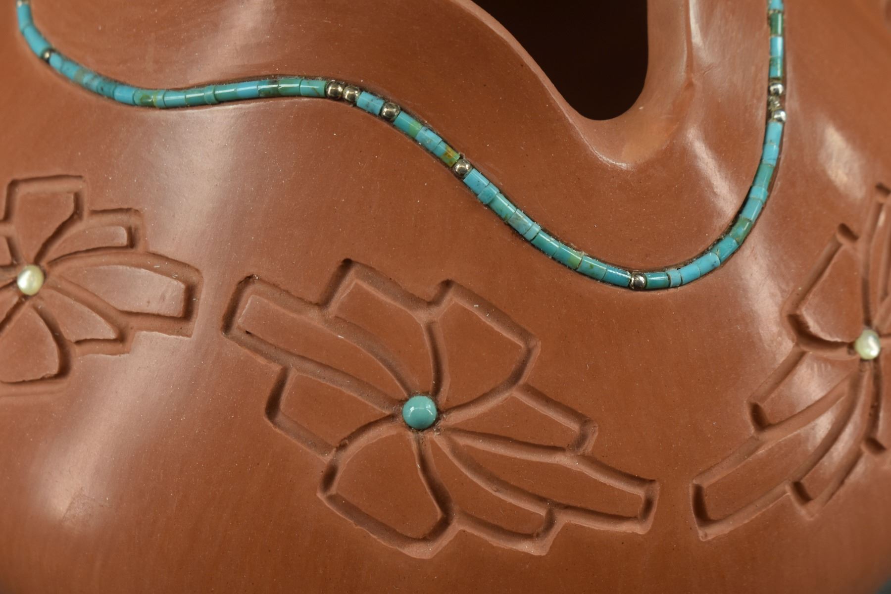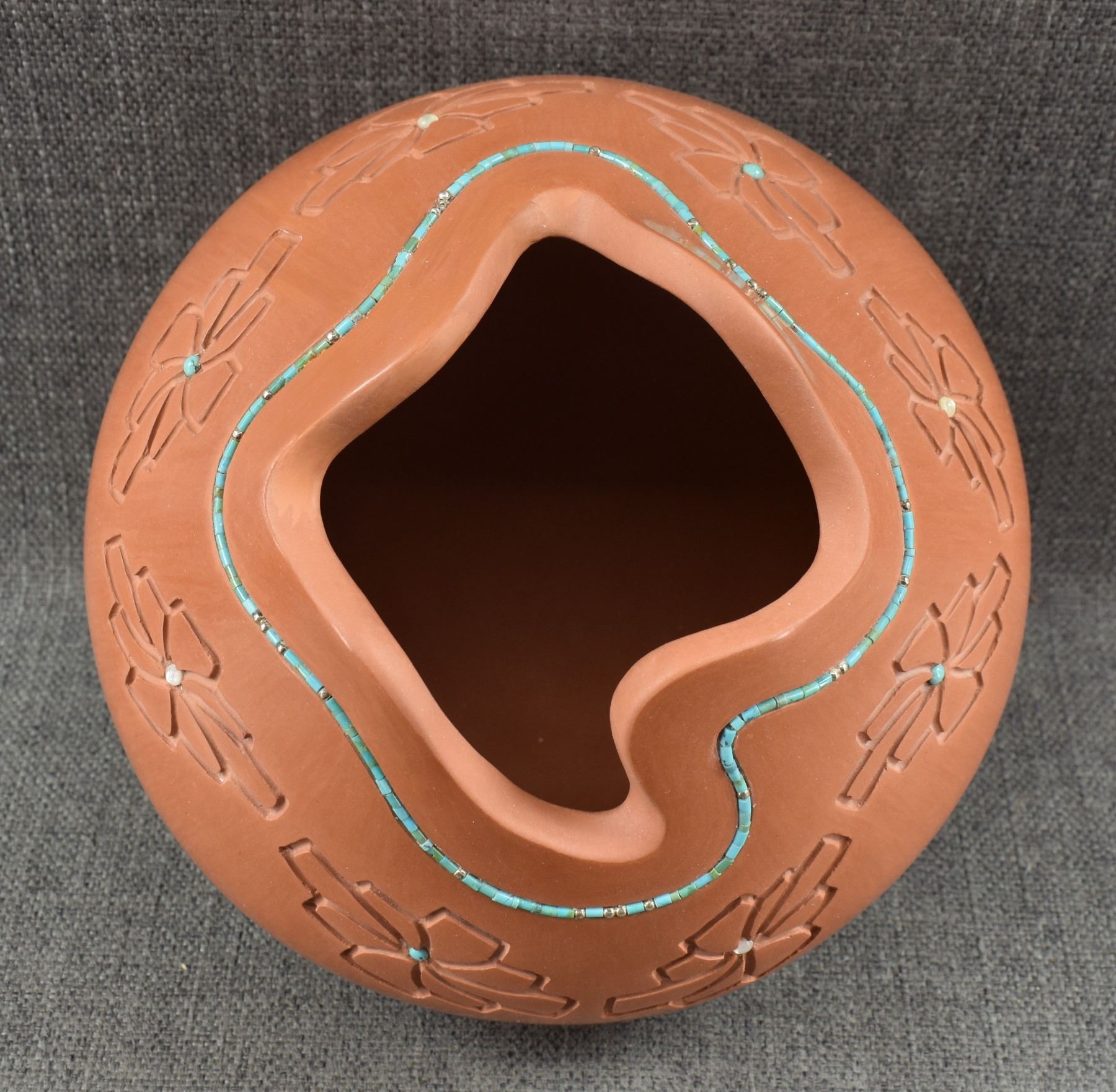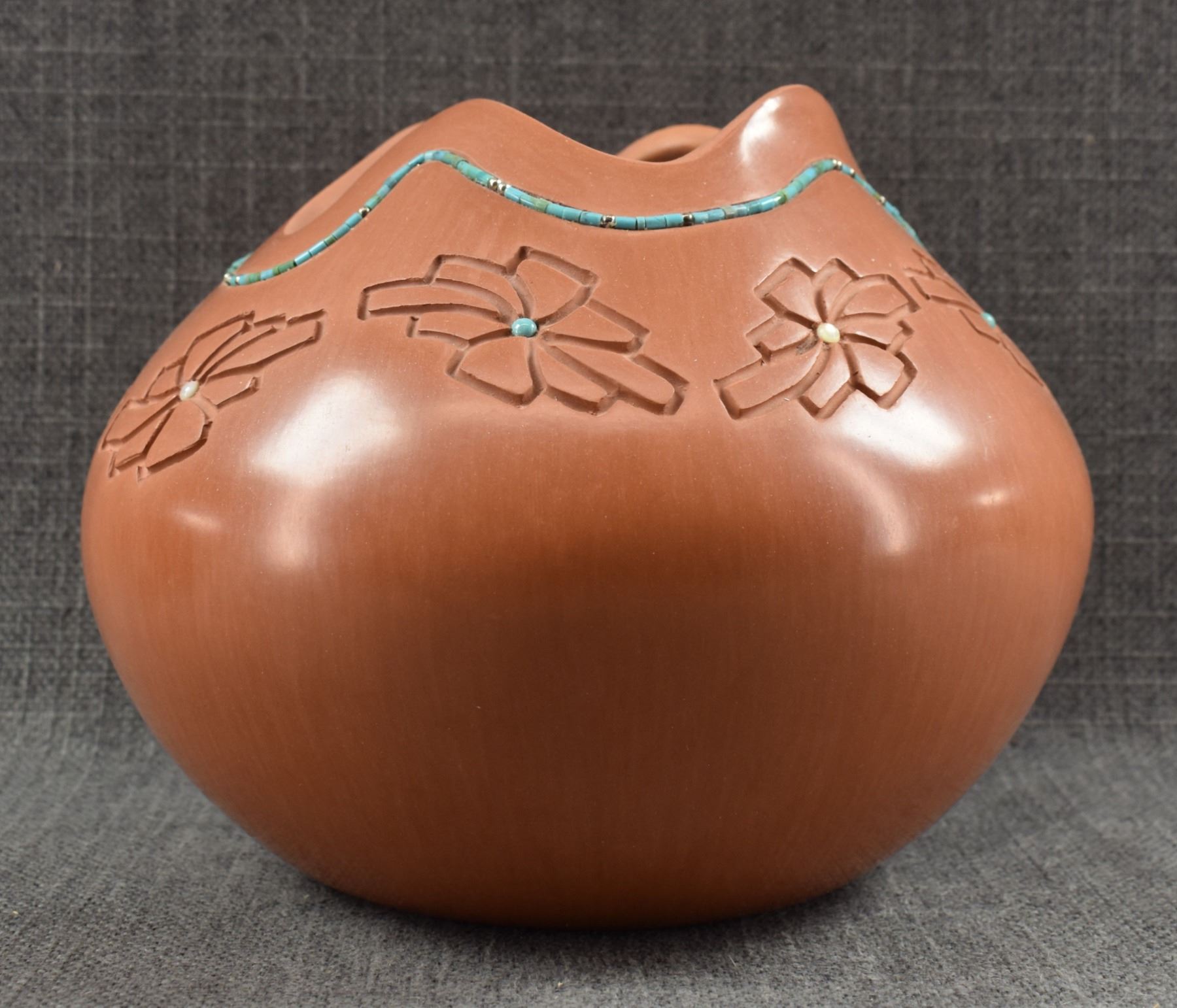 1990-2000's Isleta, hand coiled with carved floral design with inlaid turquoise by Carol L Caprio 6" x 8" has restoration