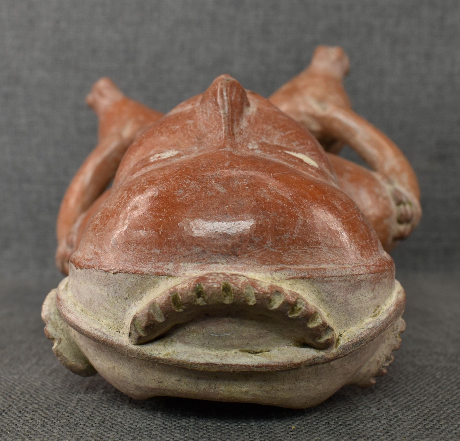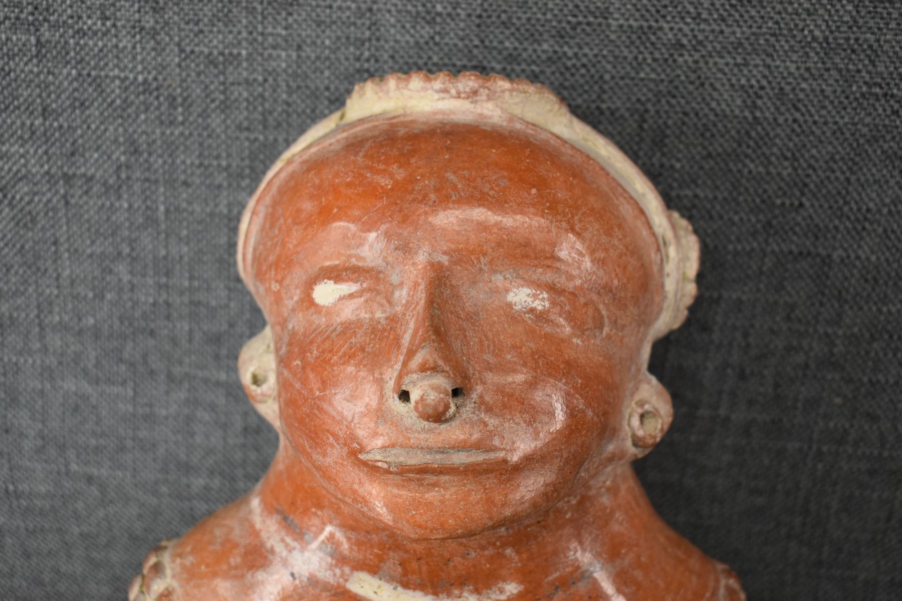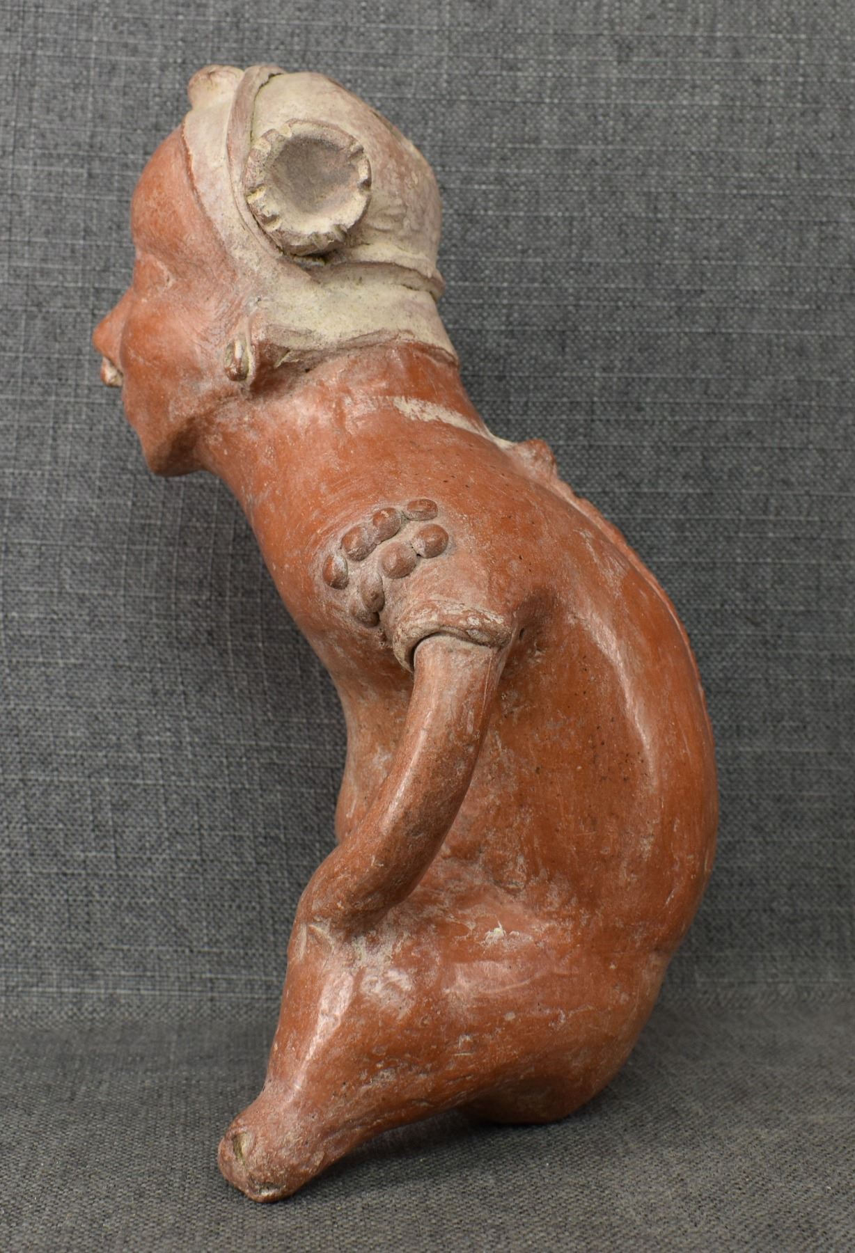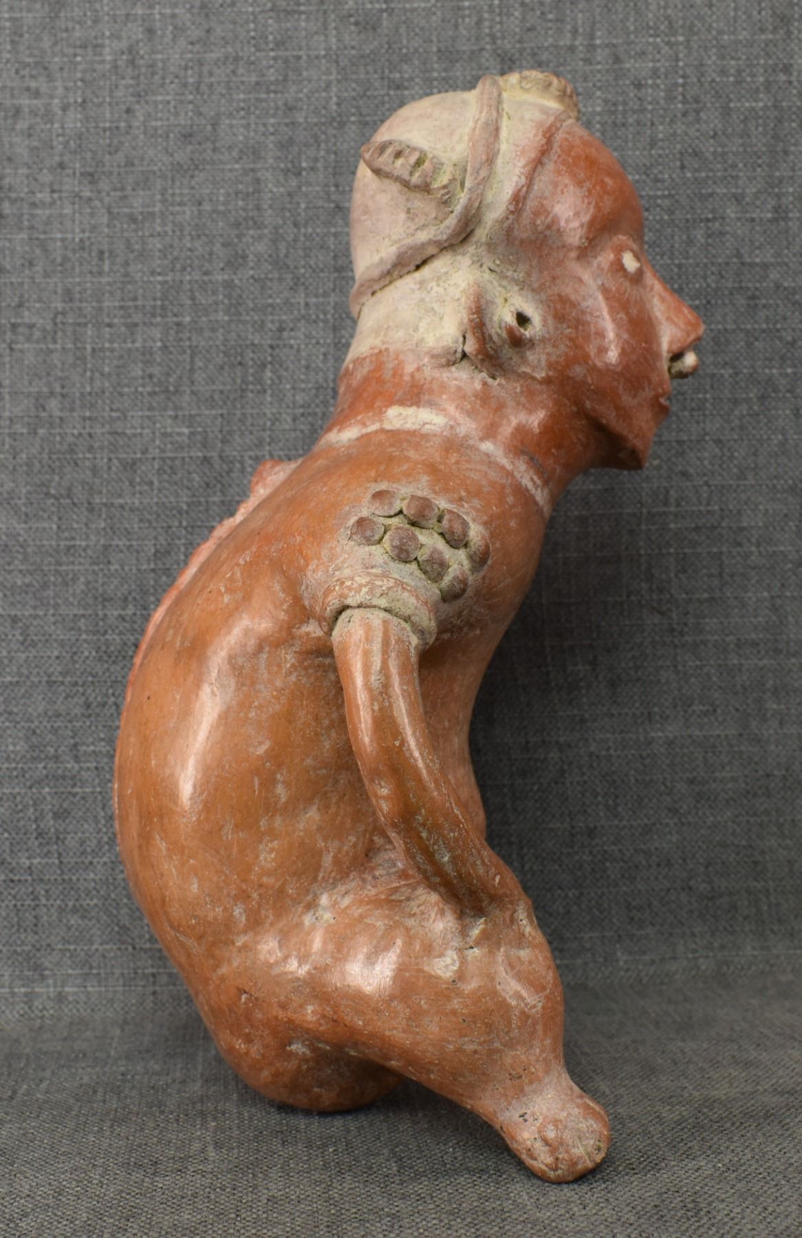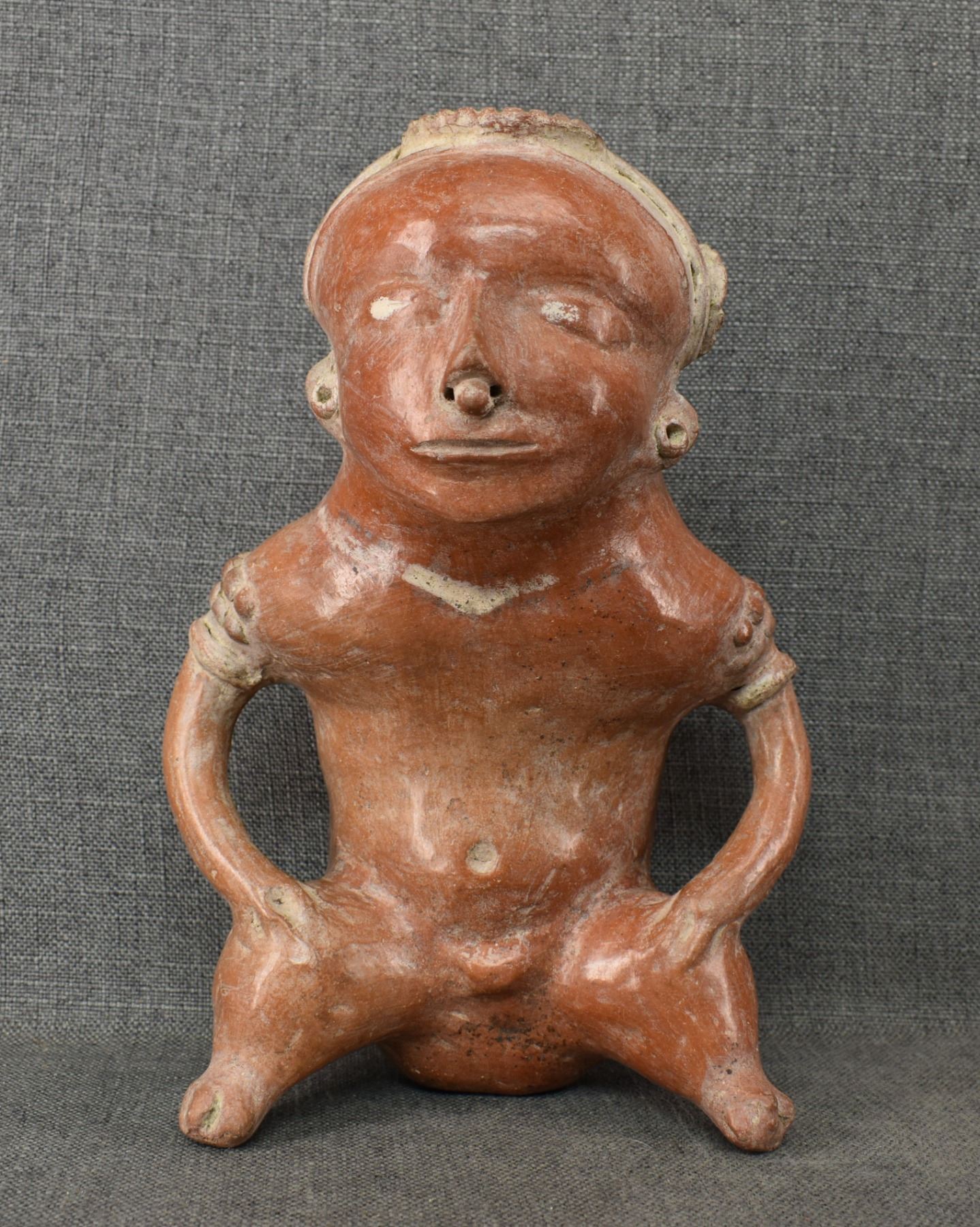 prehistoric Jalisco. Hand coiled pottery depicting seated male figure. May have restoration. 13'' x 9'' x 8''