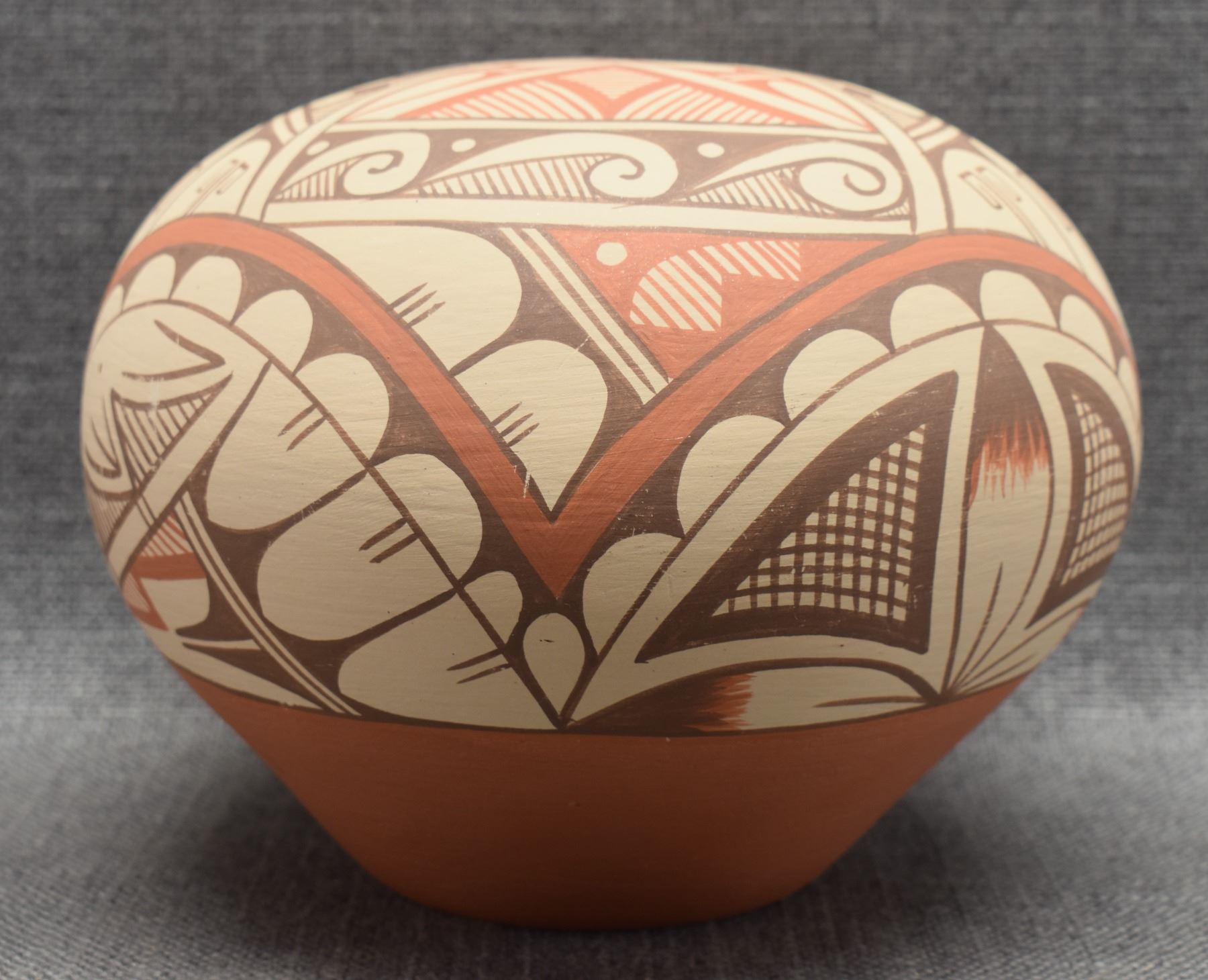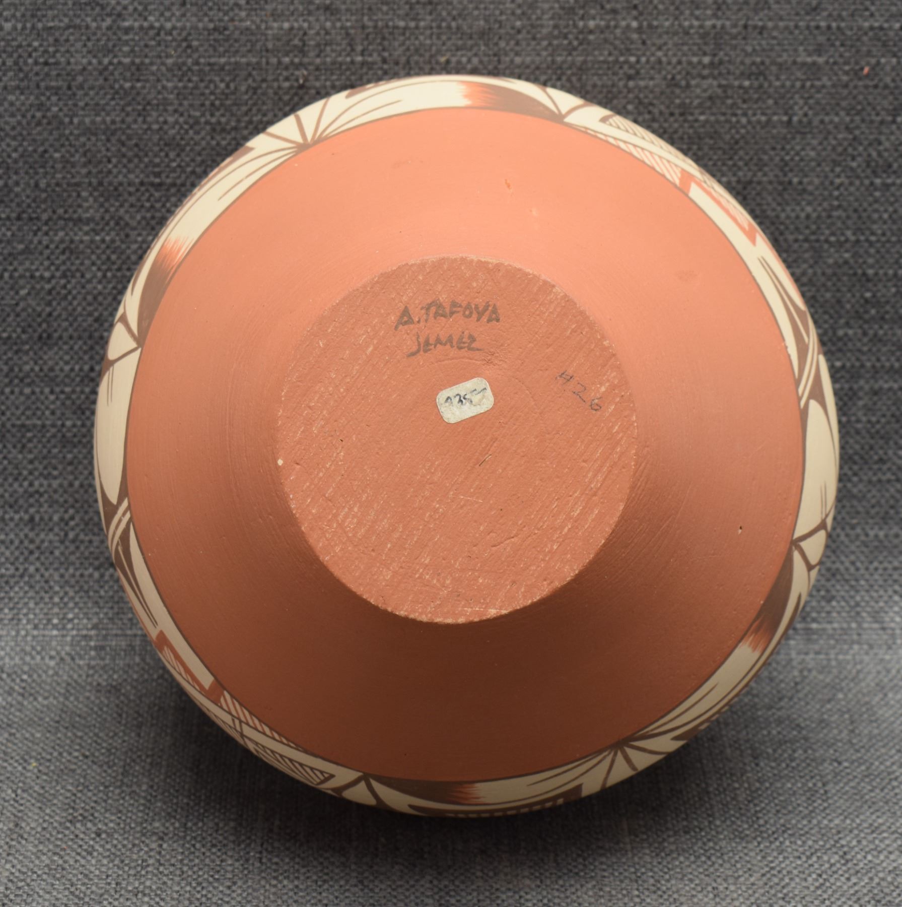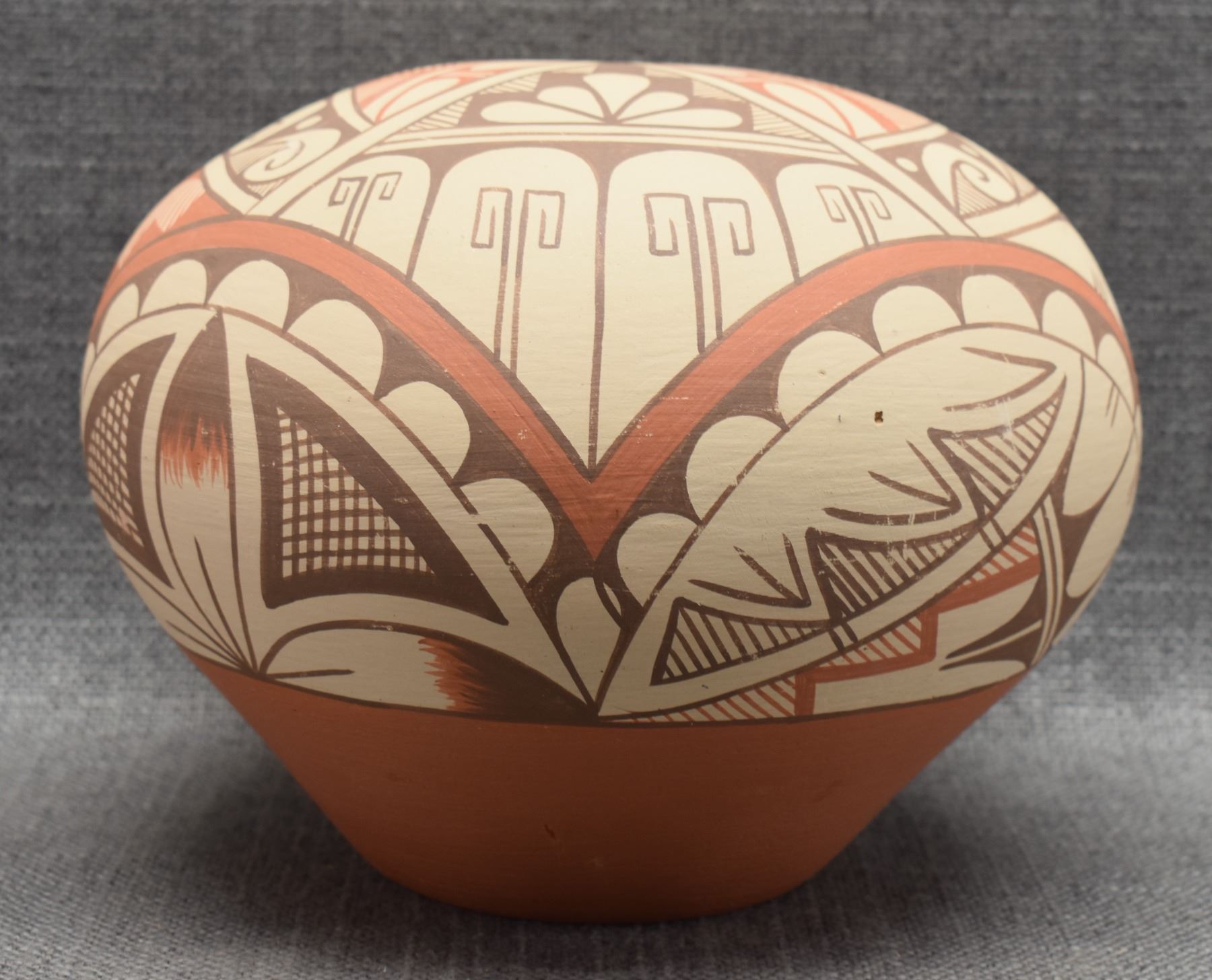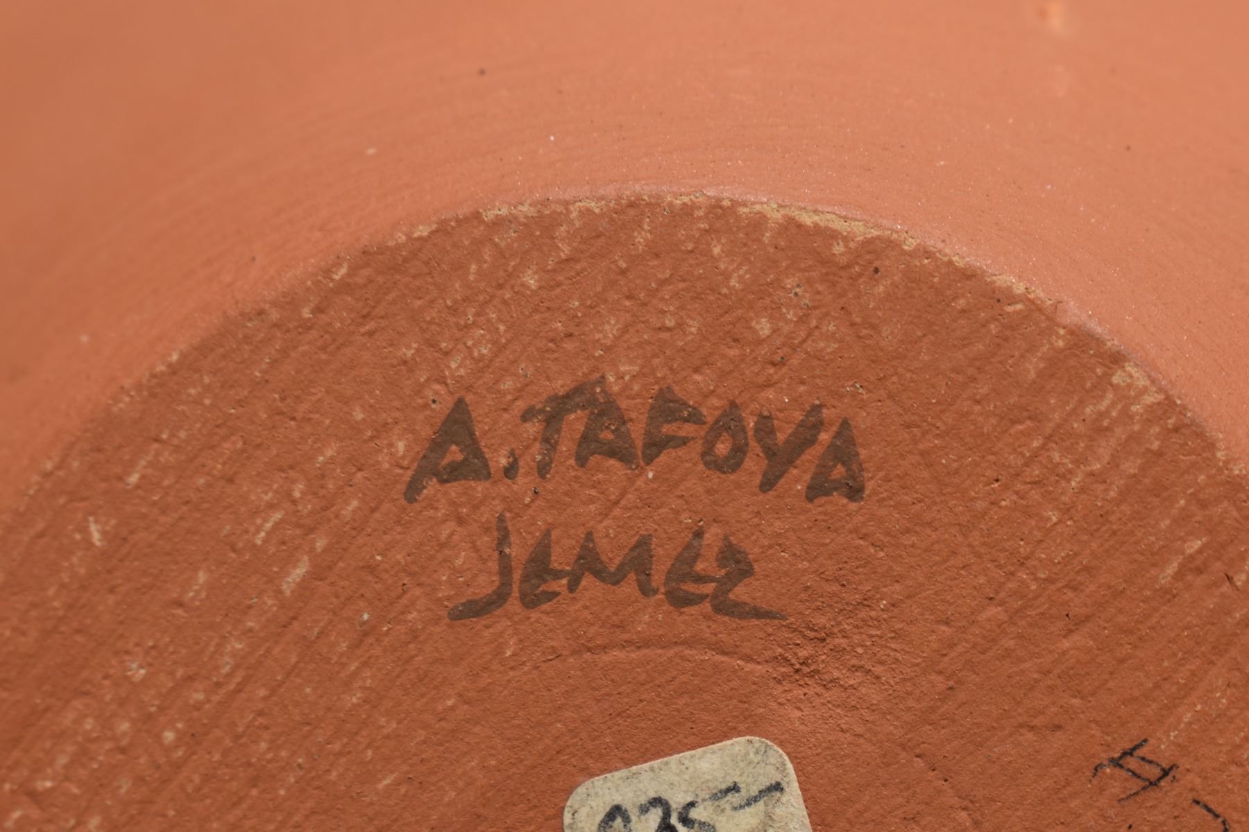 1980-90's Jemez Indian hand coiled and polychrome painted geometric design signed A Tafoya 6.25" x 7.75"