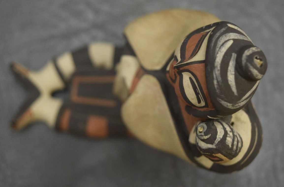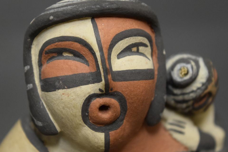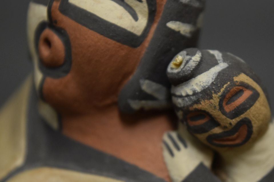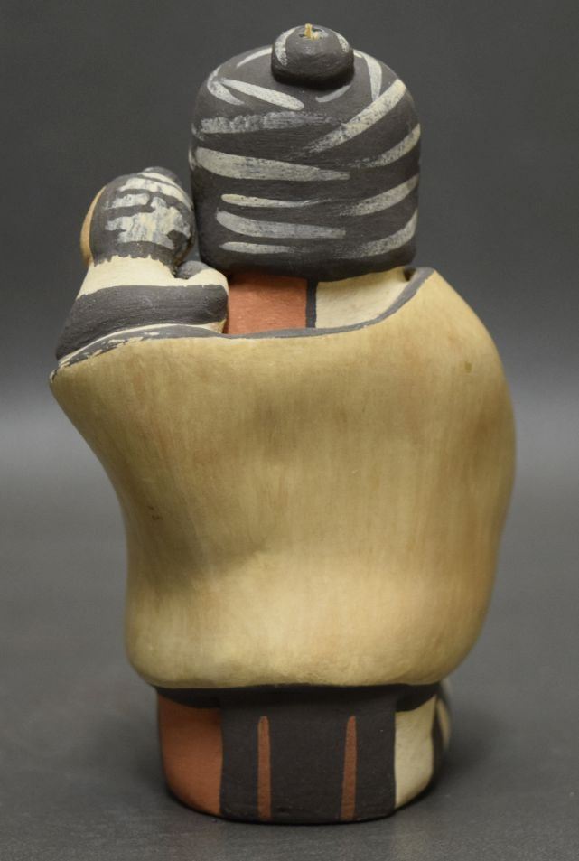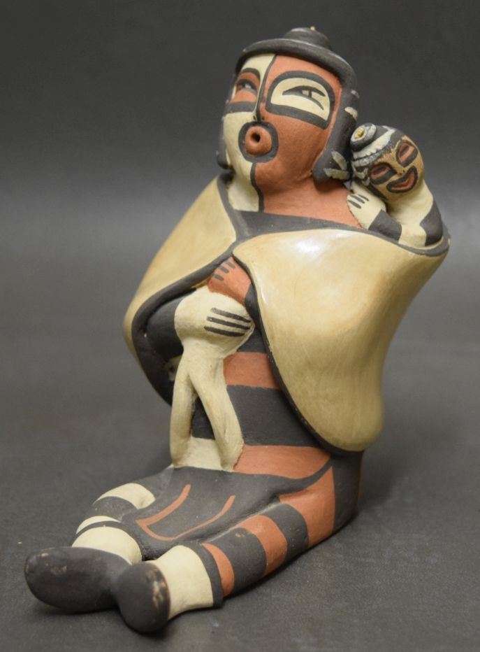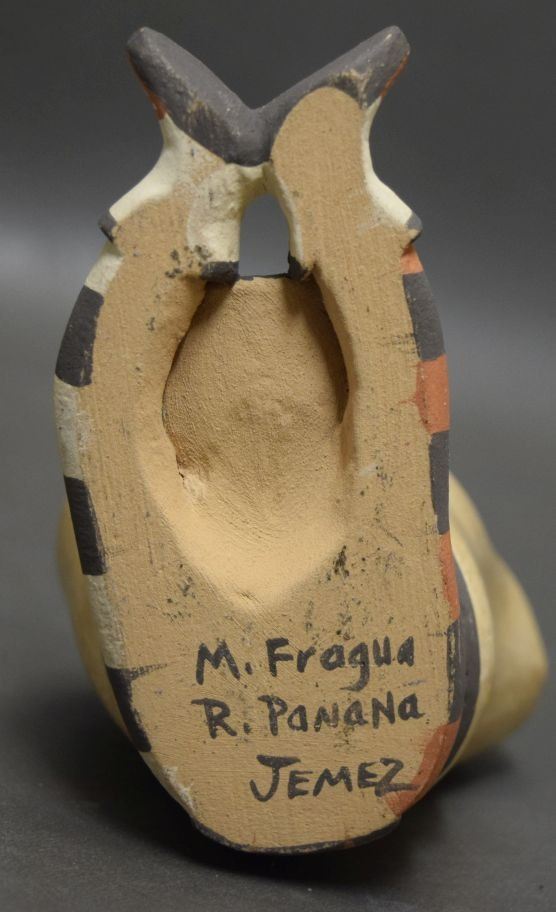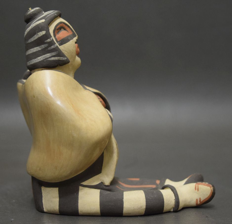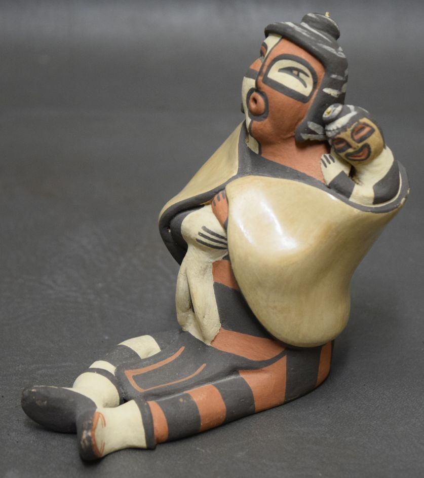 1980's Jemez Indian pottery story teller. Hand coiled painted design. 5'' x 4'' x 3''