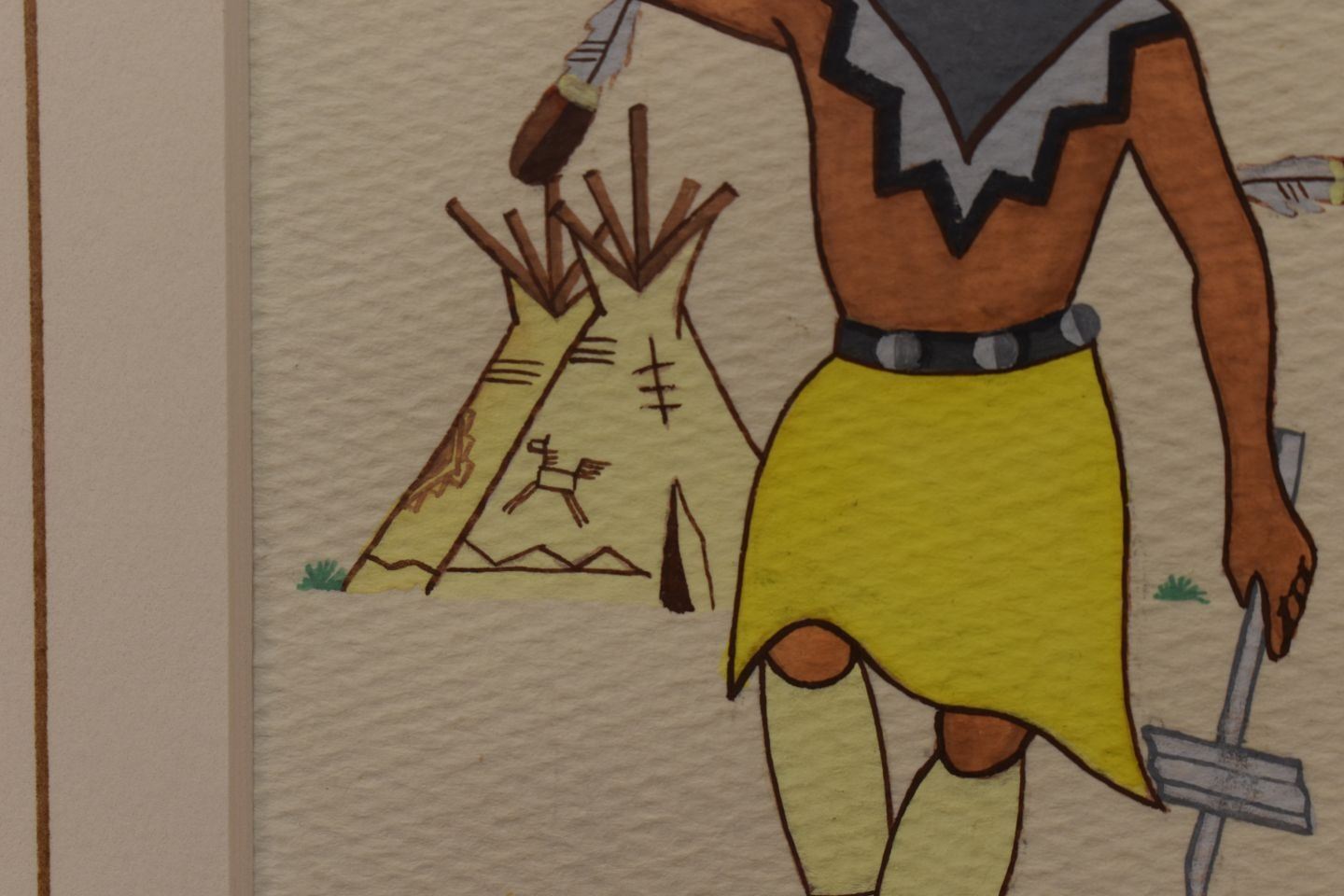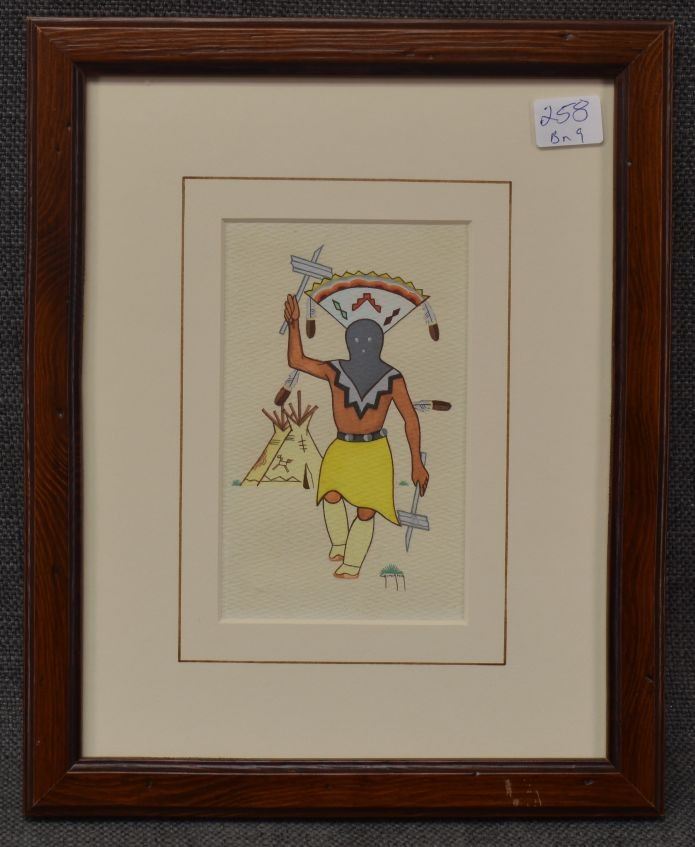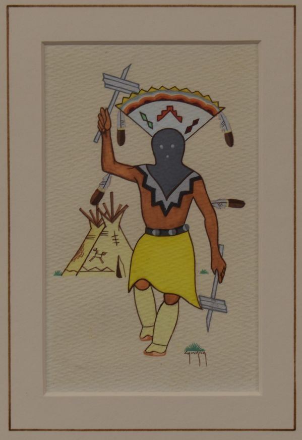 1960-70's Jemez, original hand painted on paper depicting Gan Dancer signed Chinana 5.25" x 3.25" matted and framed to 10.25" x 8.5"