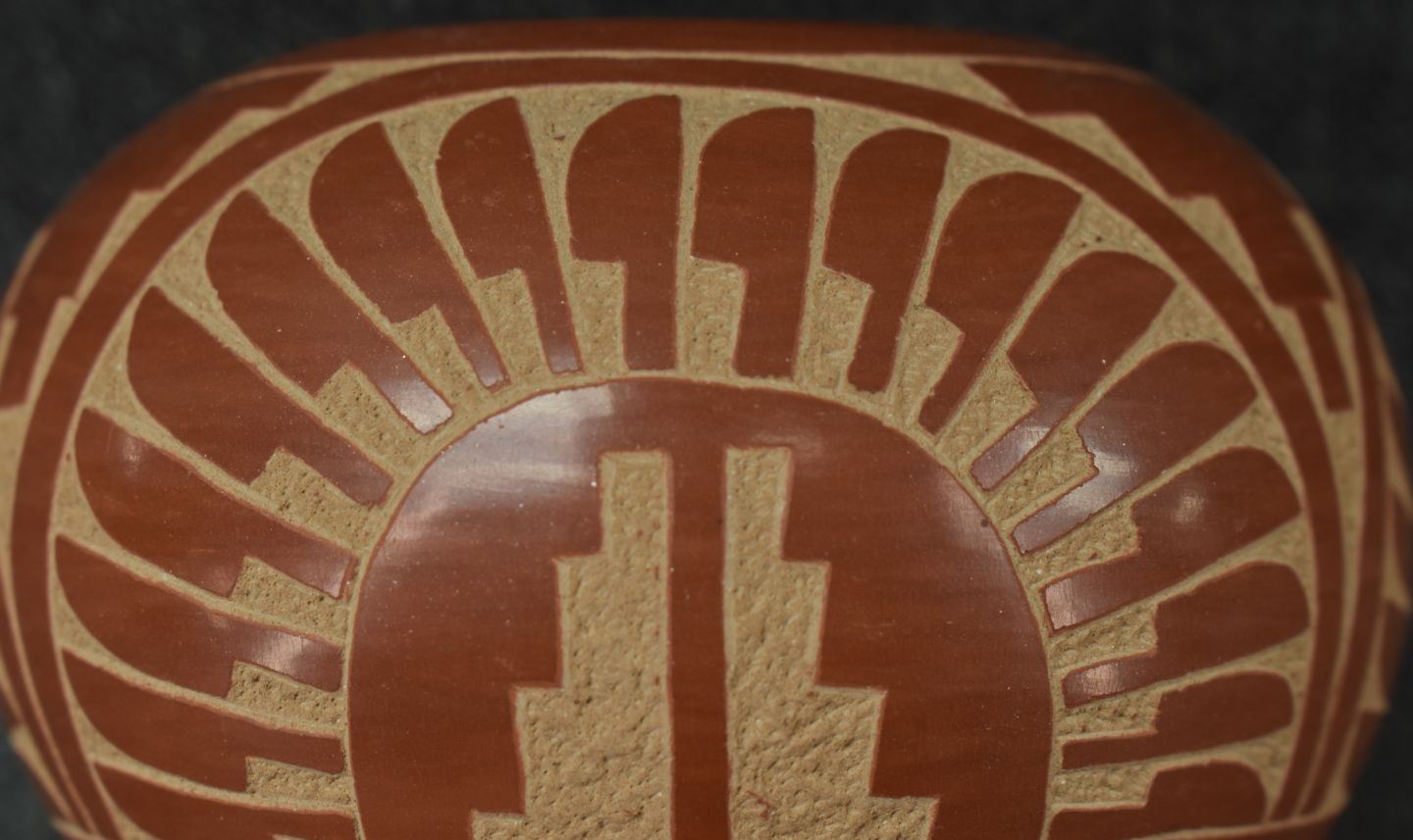1990's Jemez, hand coiled with sgraffito feather and geometric design by Alvina Yepa 3" x 4"
