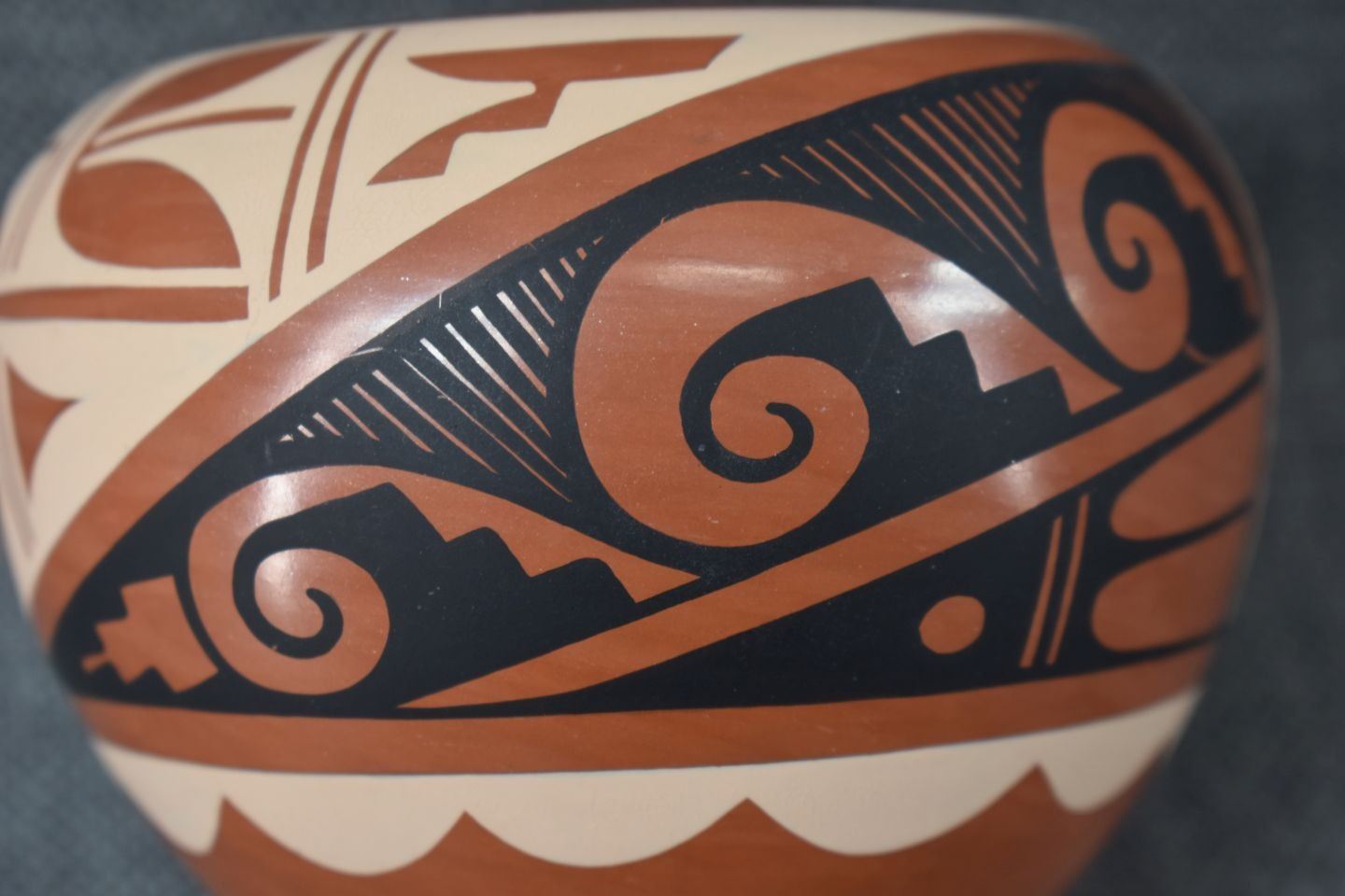 1980's Jemez, hand coiled with polychrome painted geometric design signed C.G. Loretto 3" x 4"