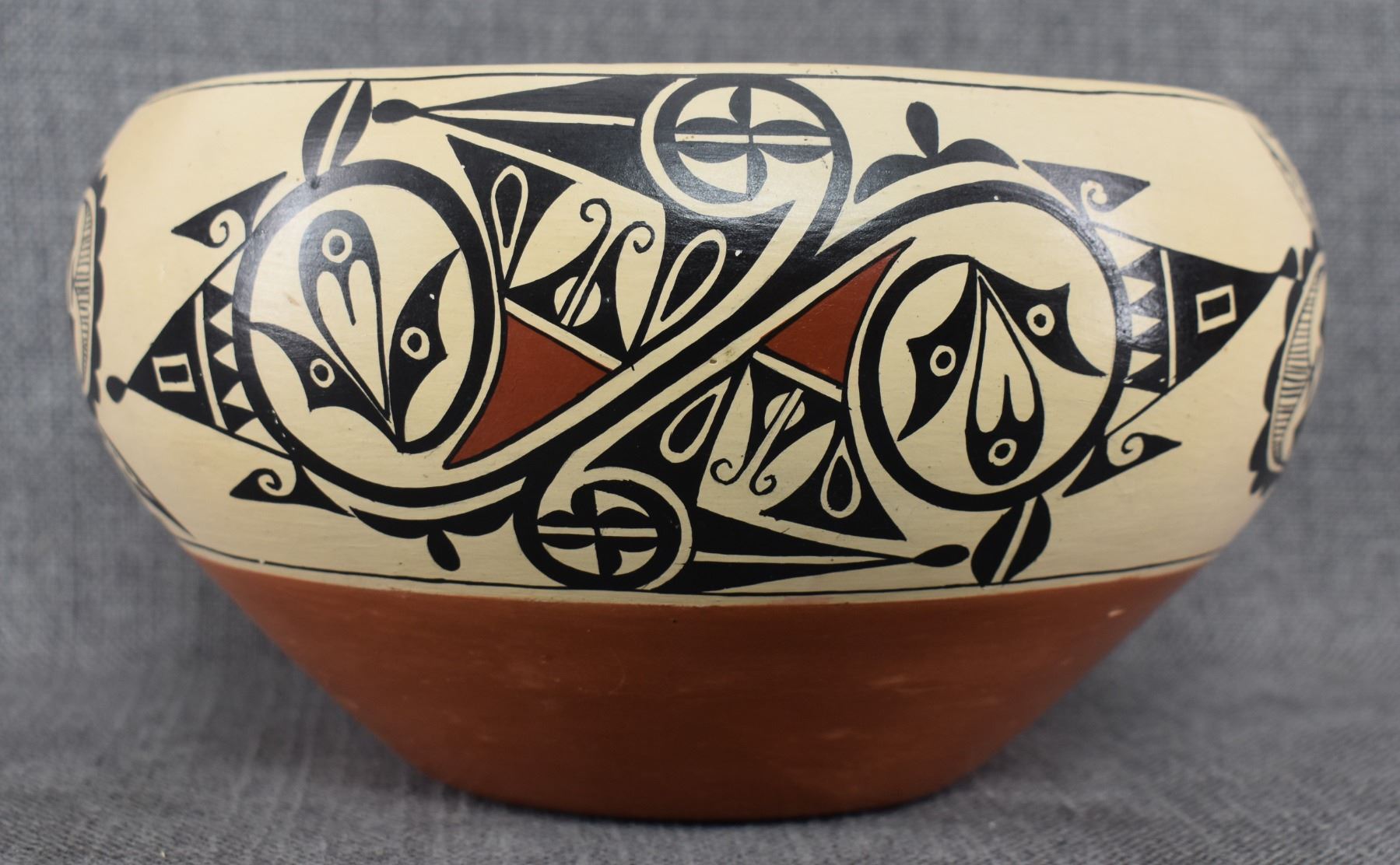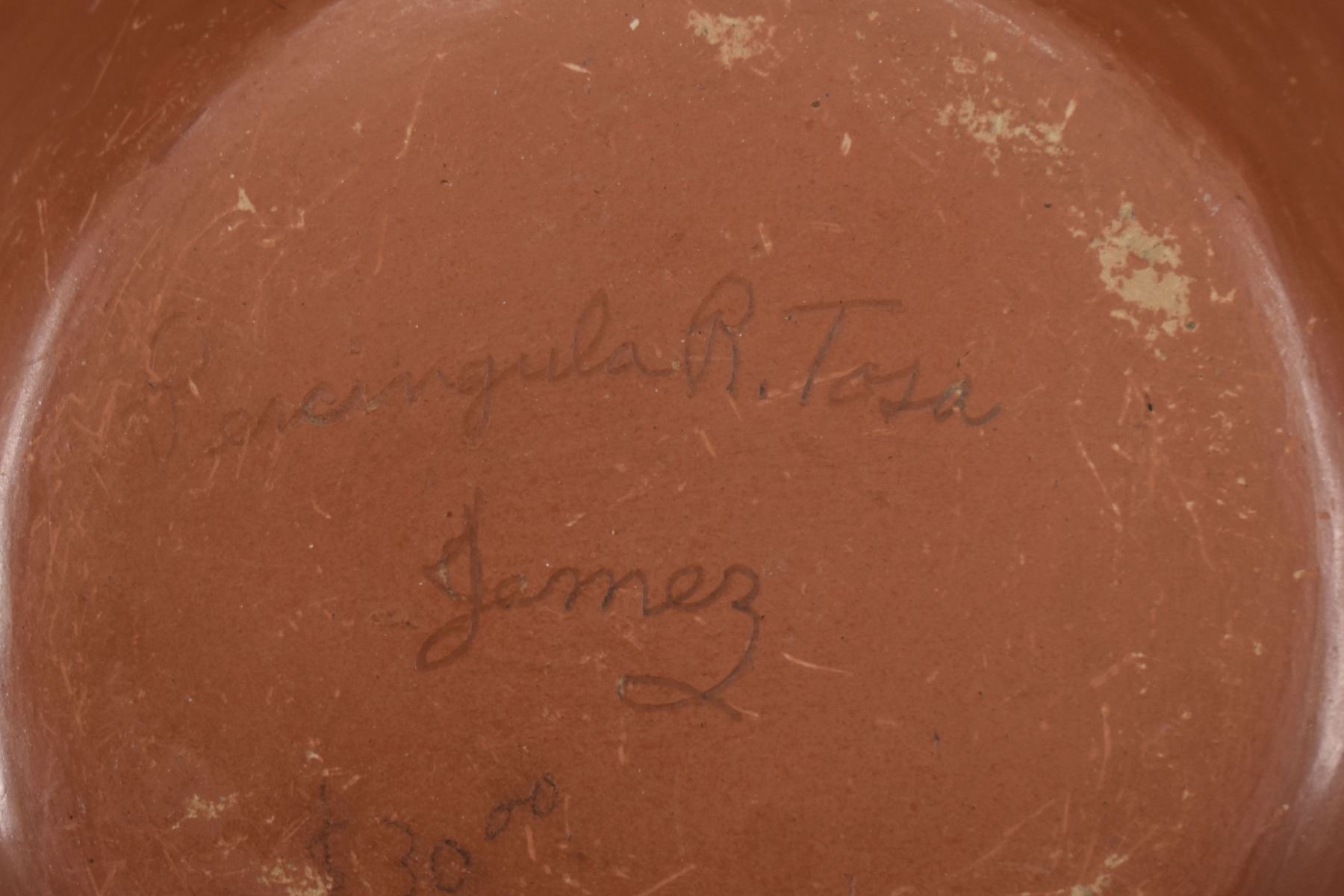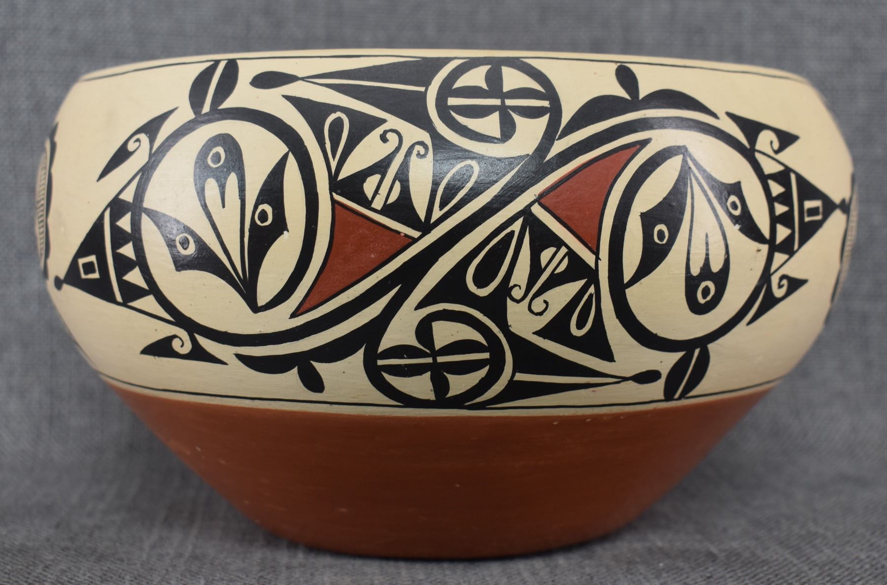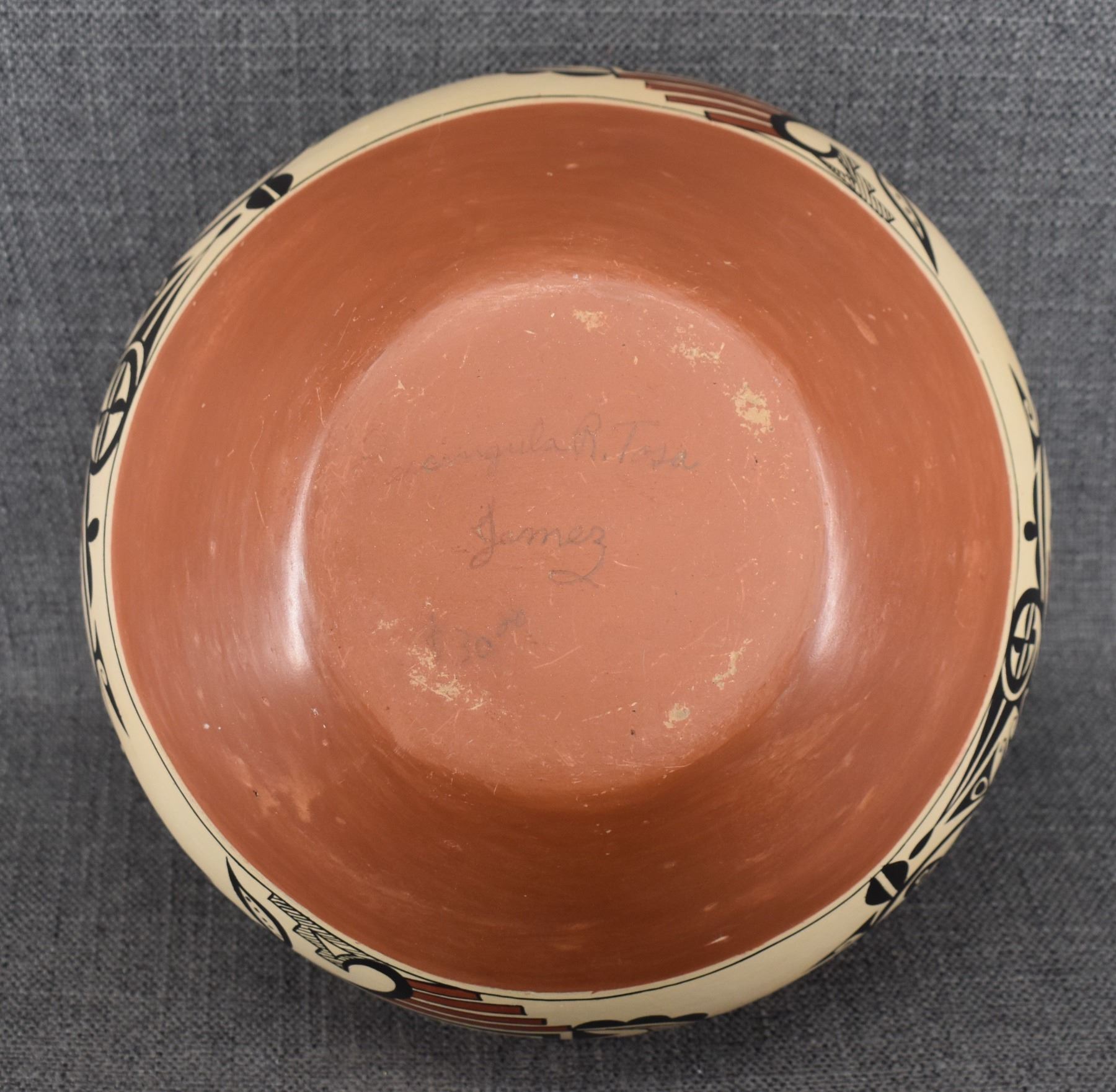 1970's Jemez. Hand coiled and painted busy design pottery bowl. Signed Percingula R Tosa. 5'' x 10''