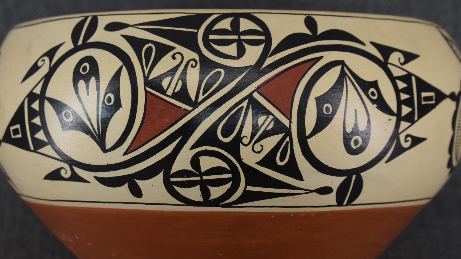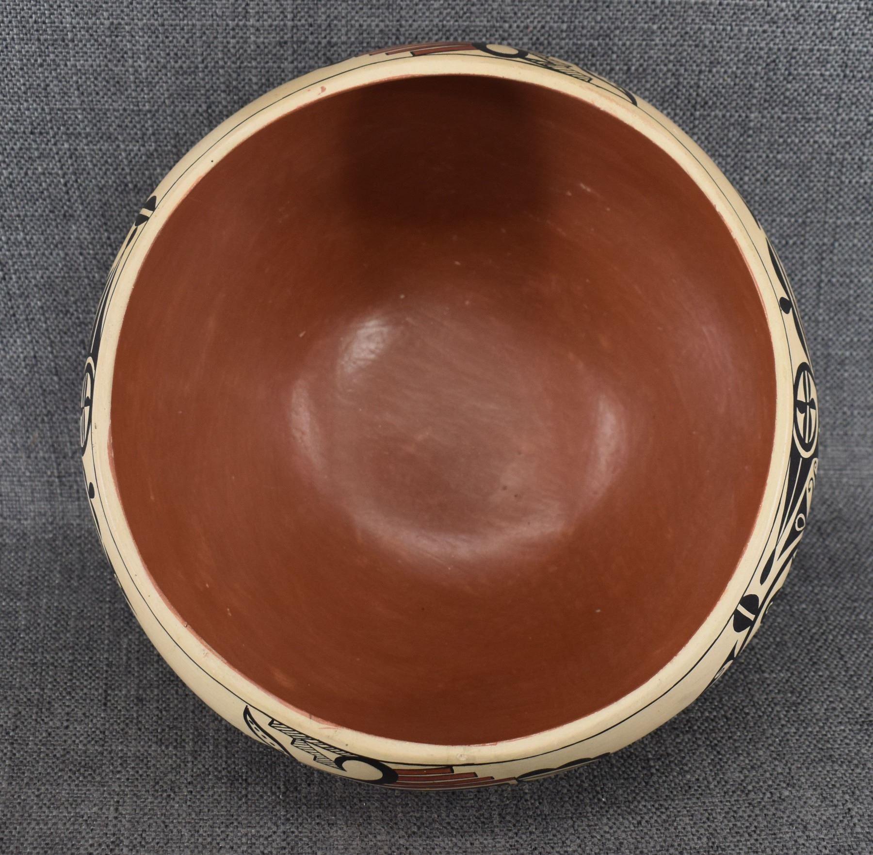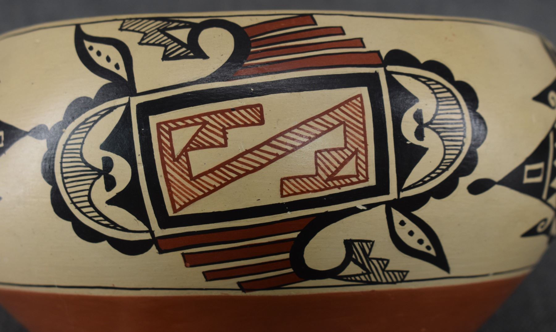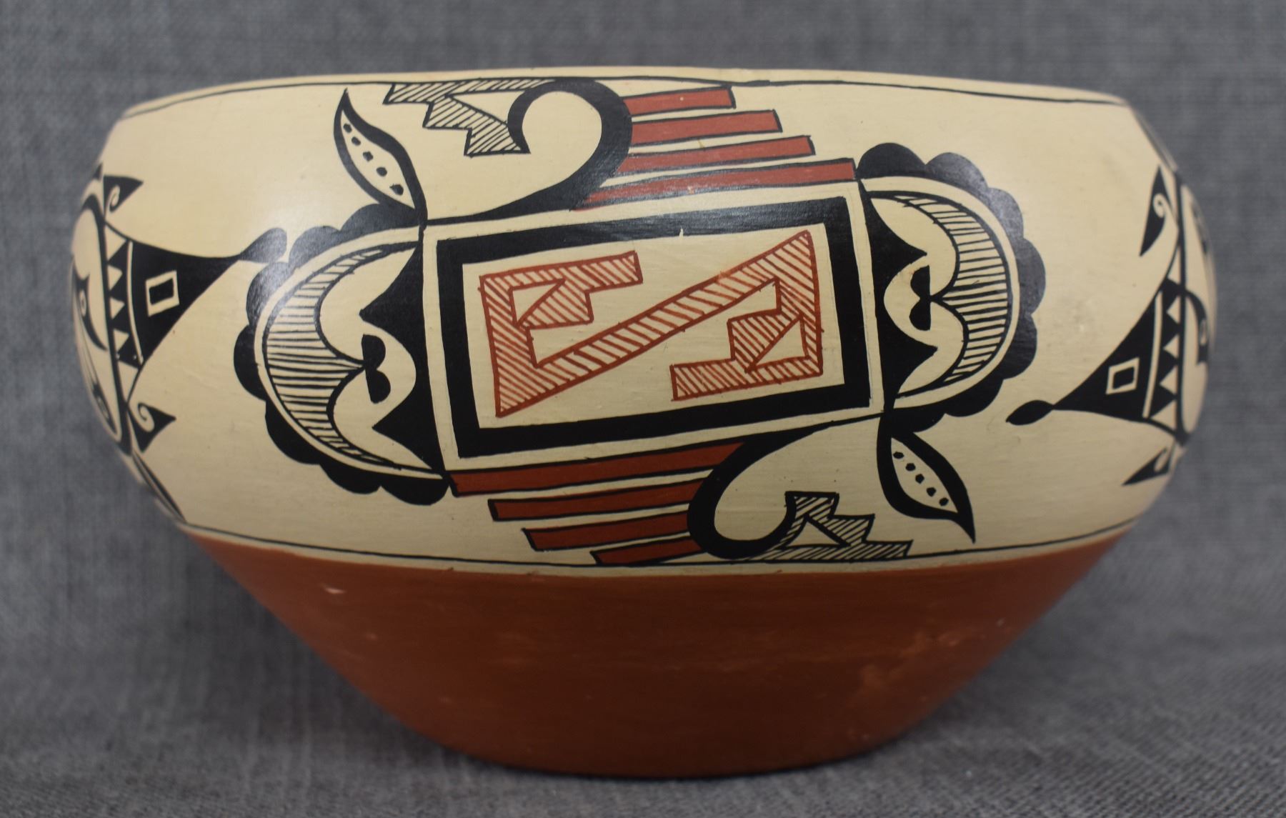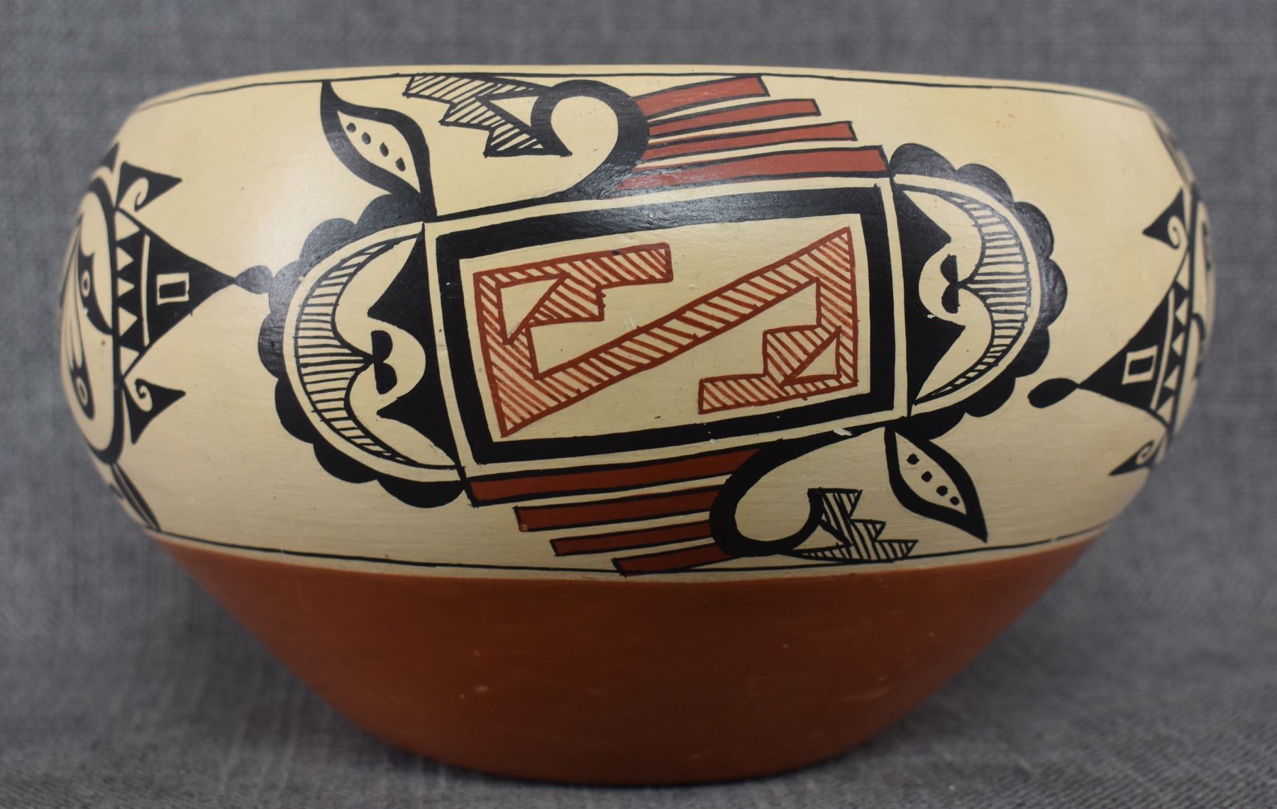1970's Jemez. Hand coiled and painted busy design pottery bowl. Signed Percingula R Tosa. 5'' x 10''
