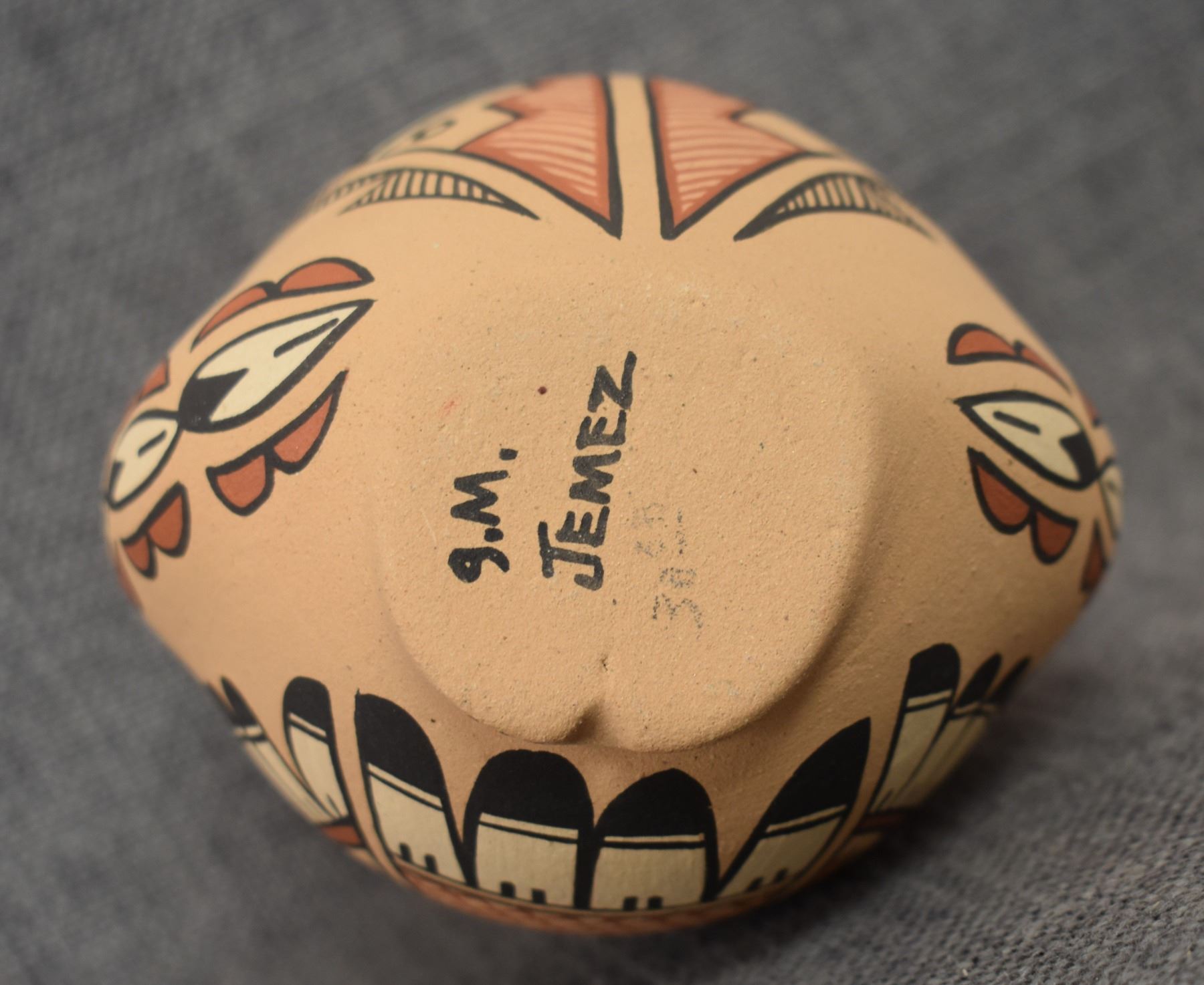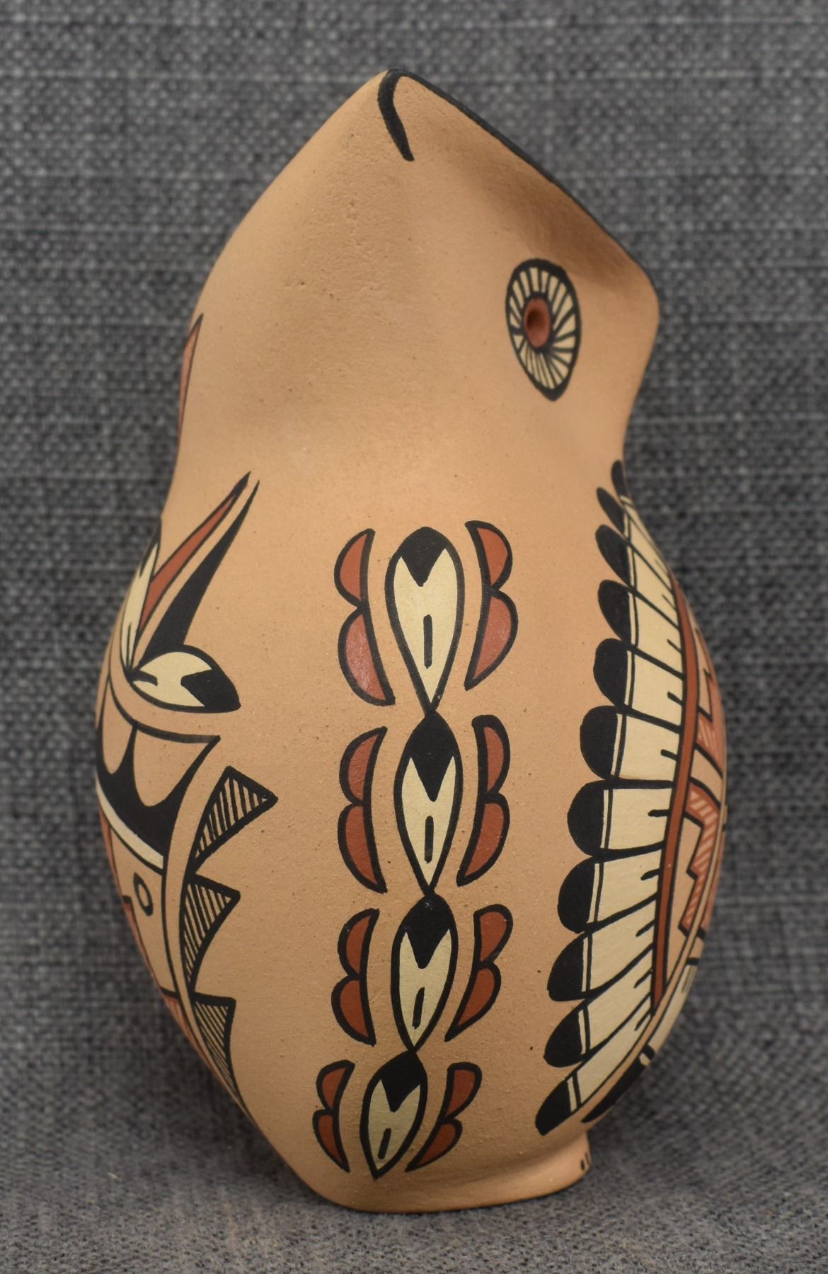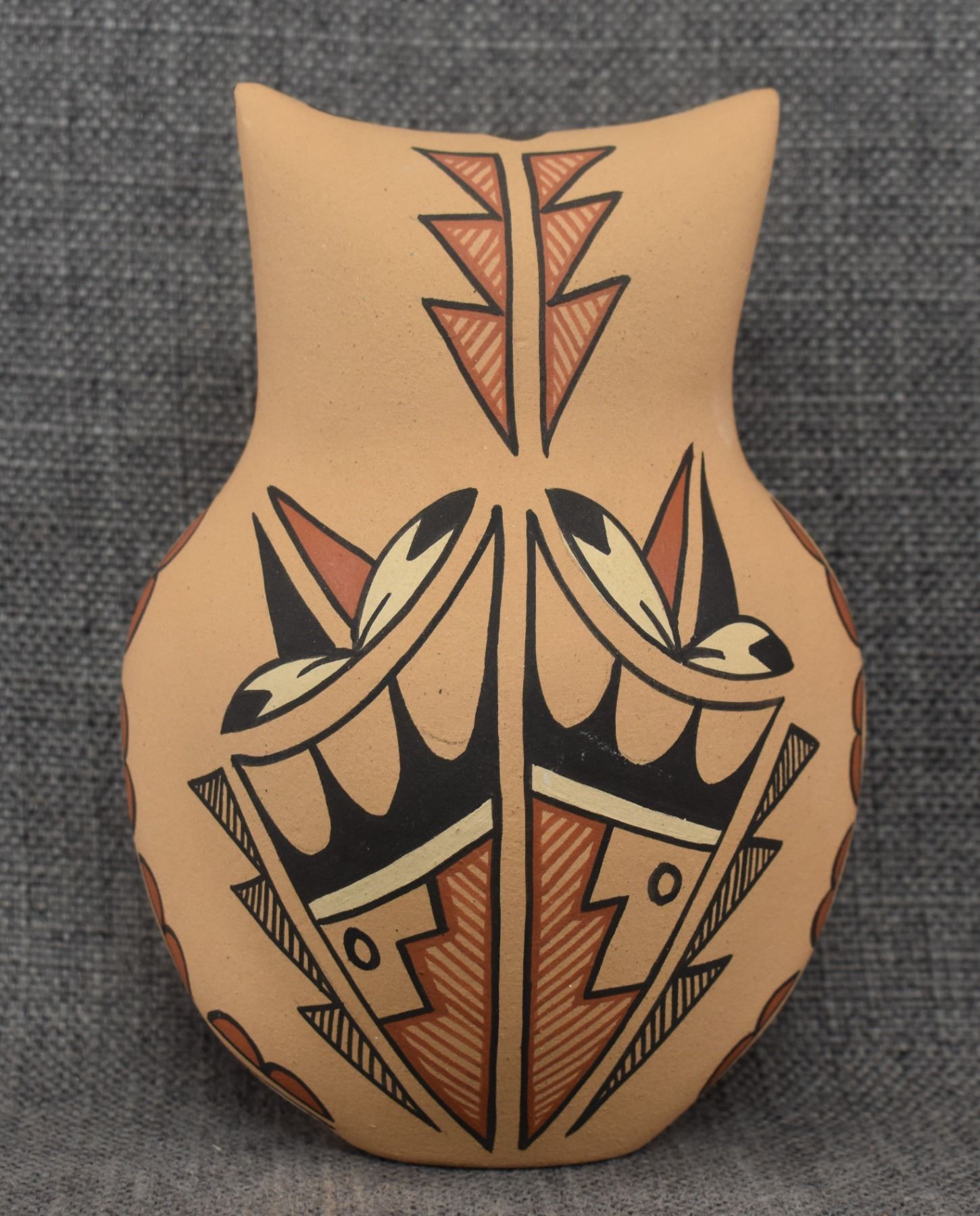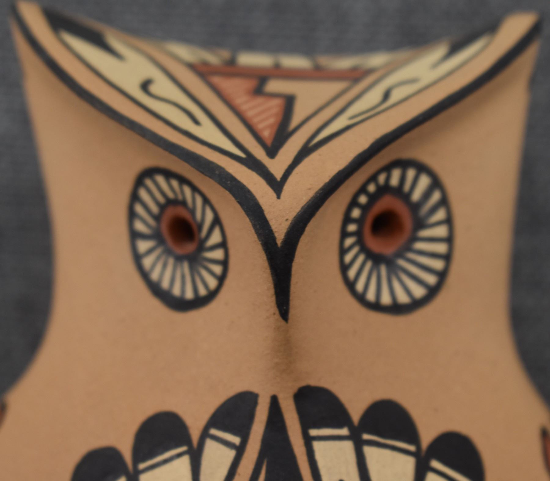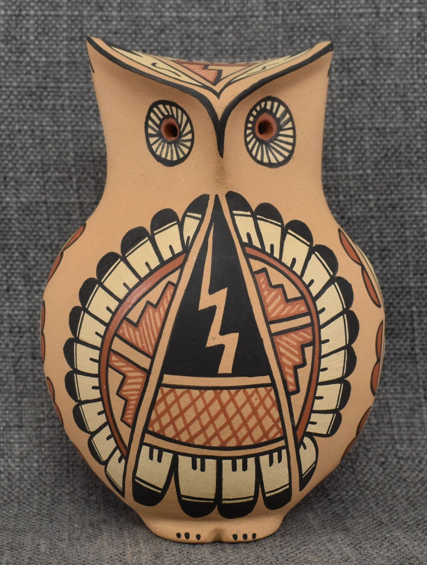 1980's Jemez. Hand coiled an painted pottery owl . Signed G.M. 6'' x 4''