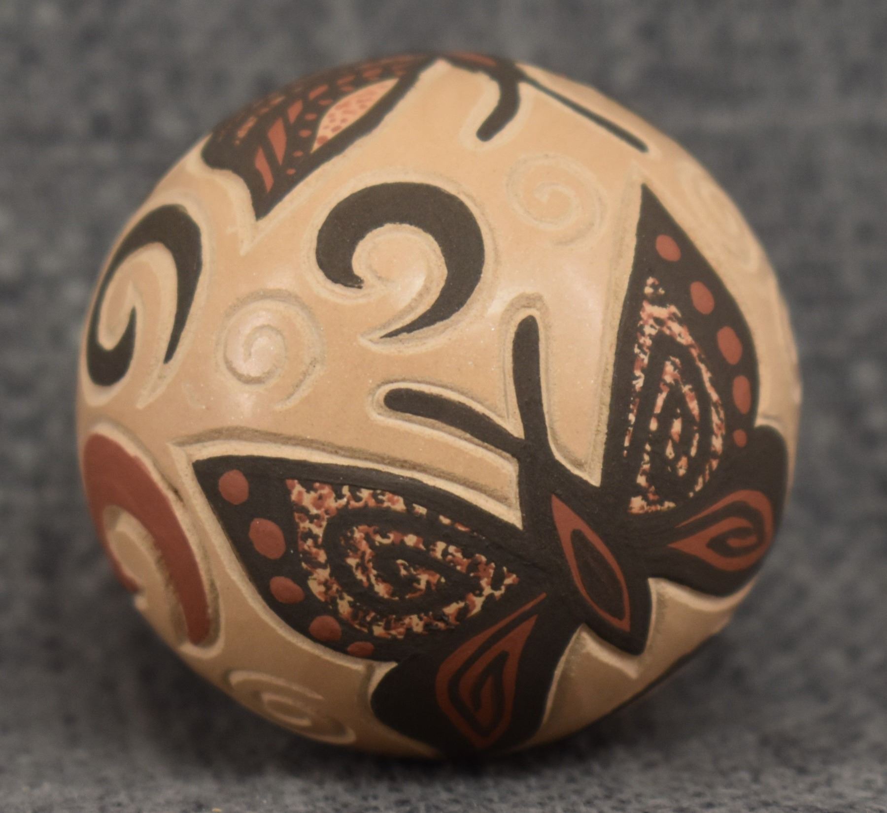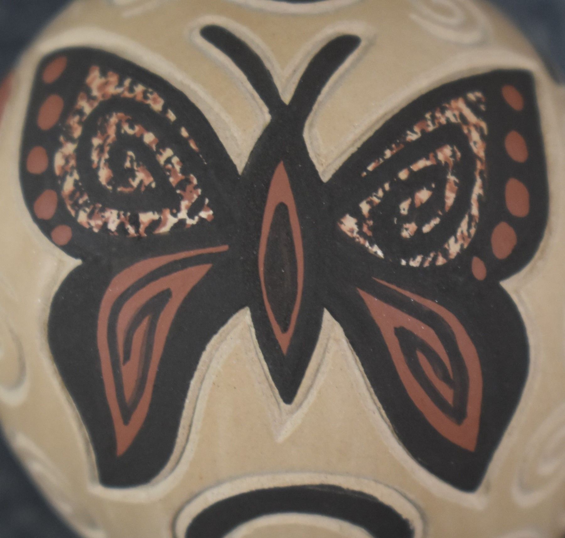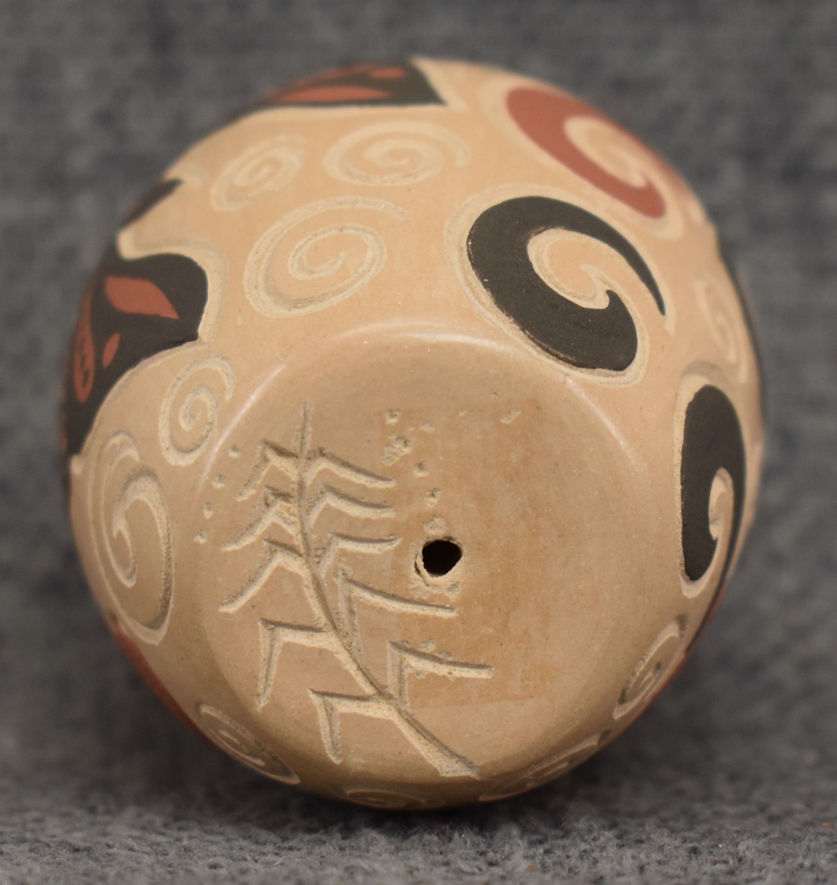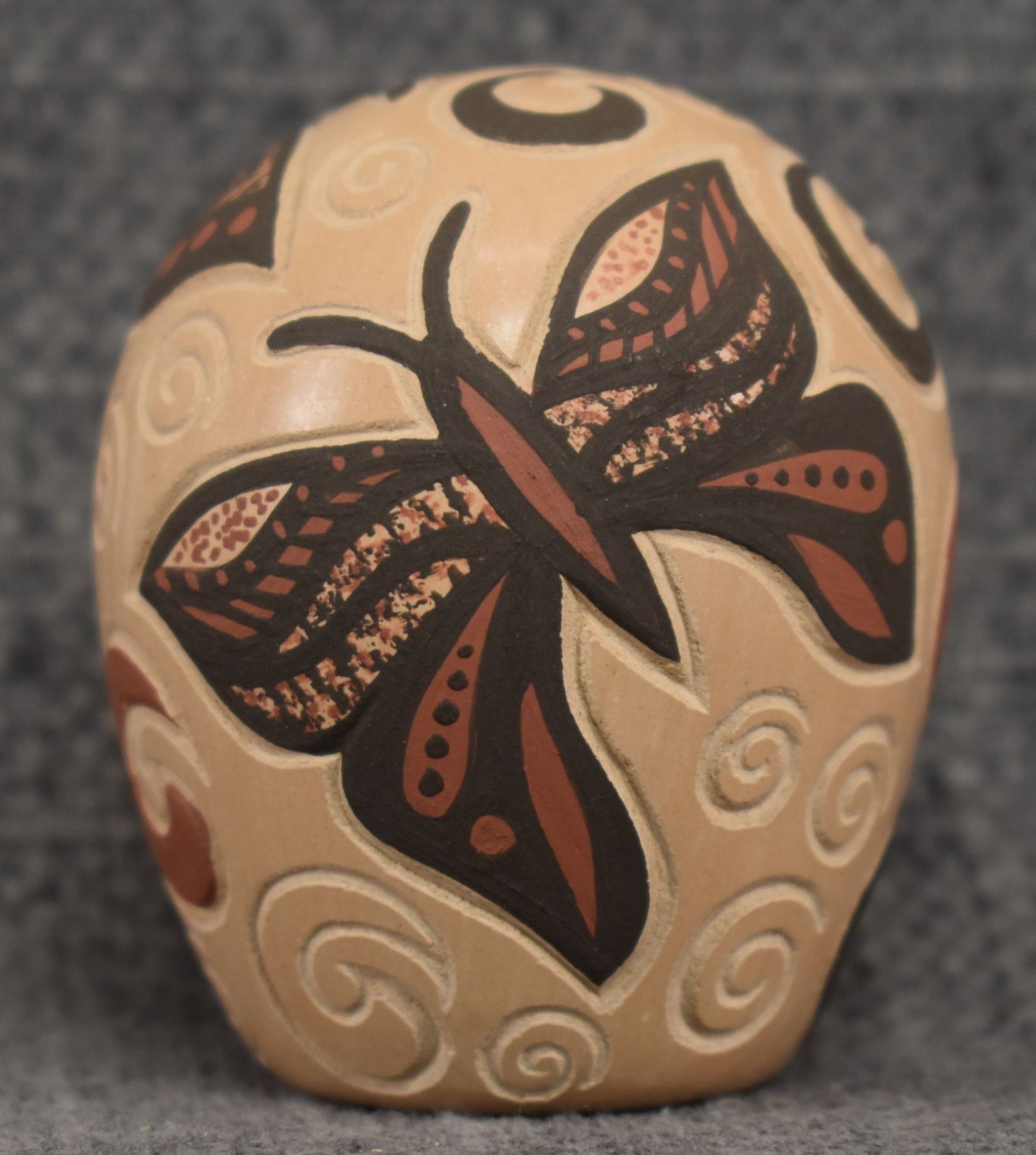 980-90's Jemez, hand coiled with carved and painted butterfly design. signed with cornstalk hallmark for Glendora Daubs 2.25" x 1.75"
