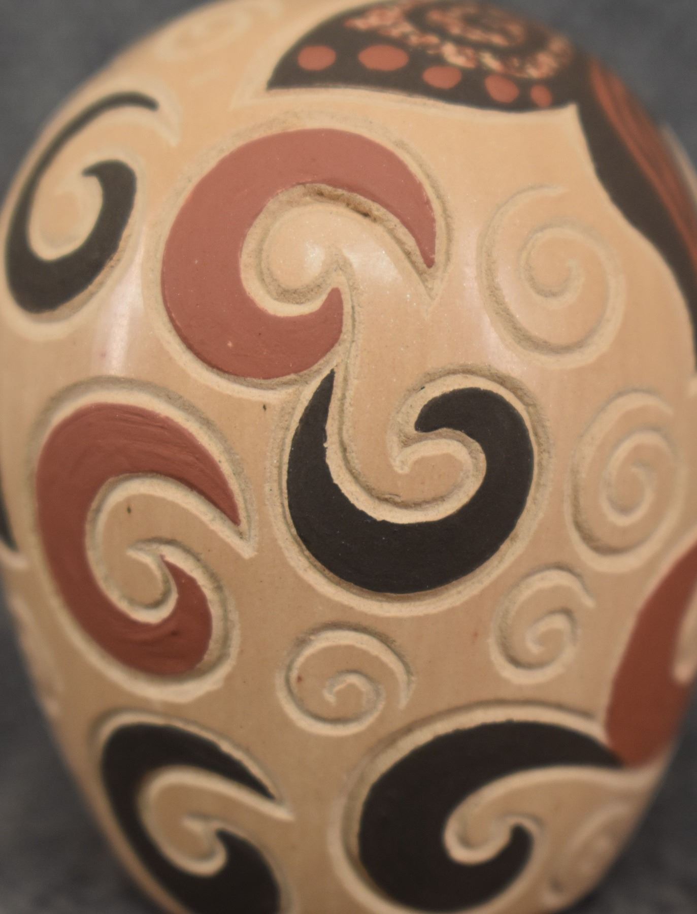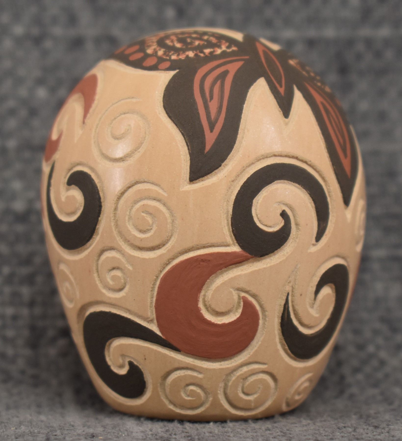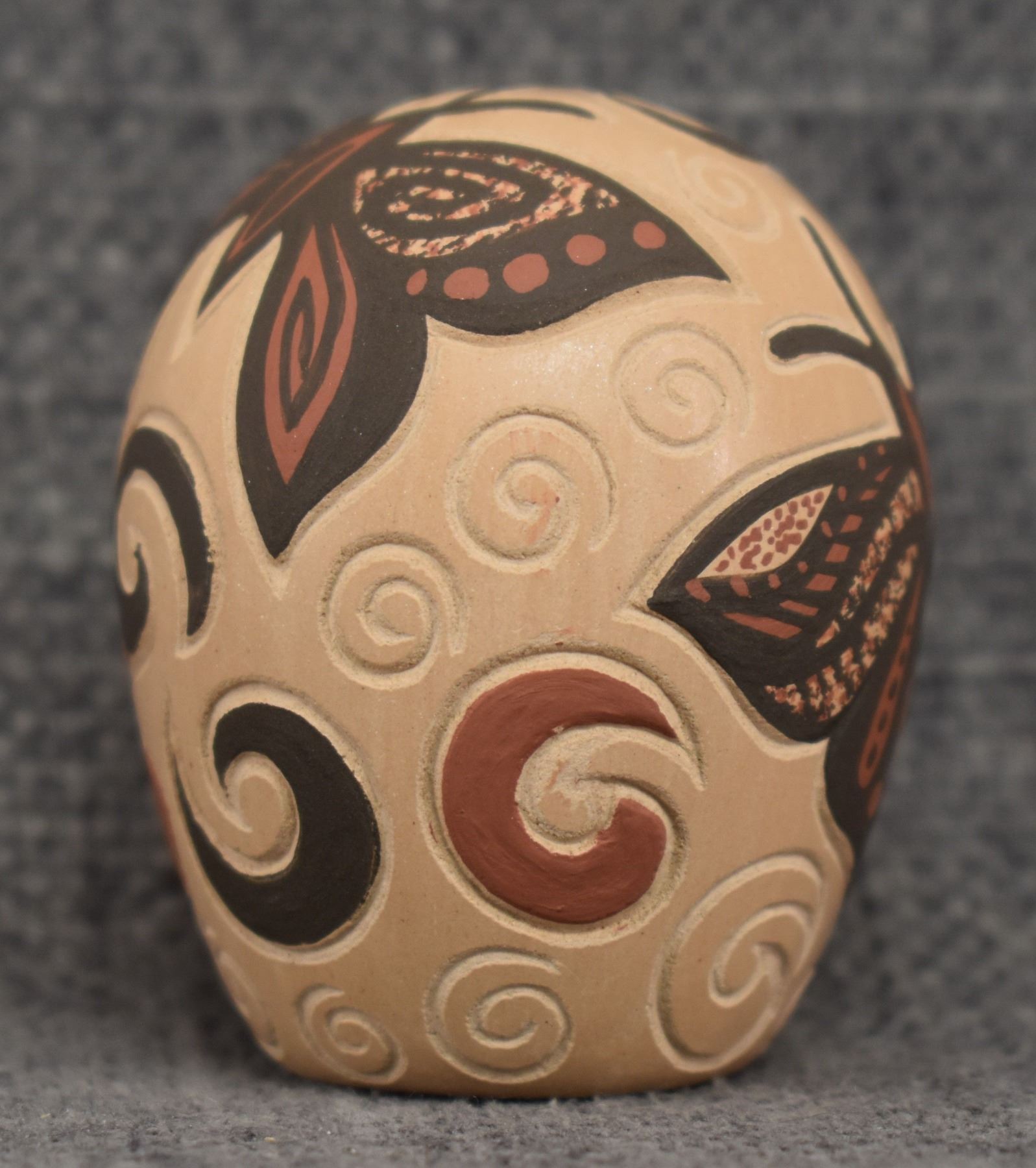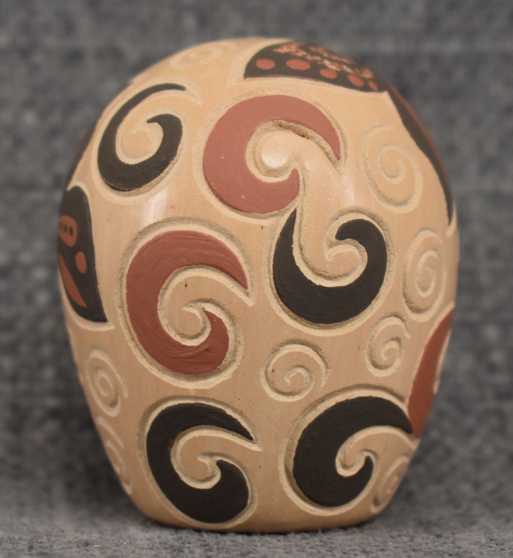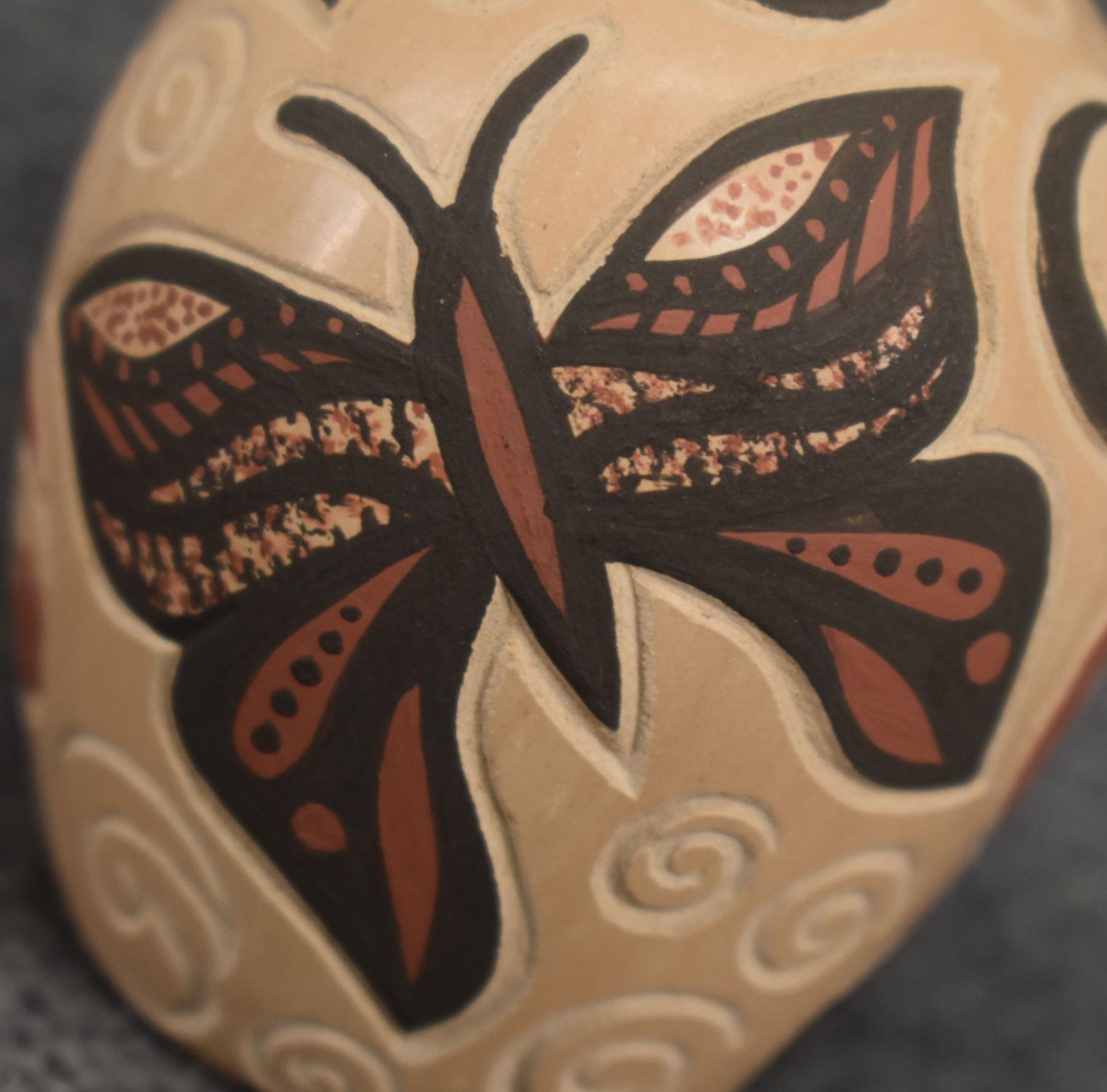 980-90's Jemez, hand coiled with carved and painted butterfly design. signed with cornstalk hallmark for Glendora Daubs 2.25" x 1.75"
