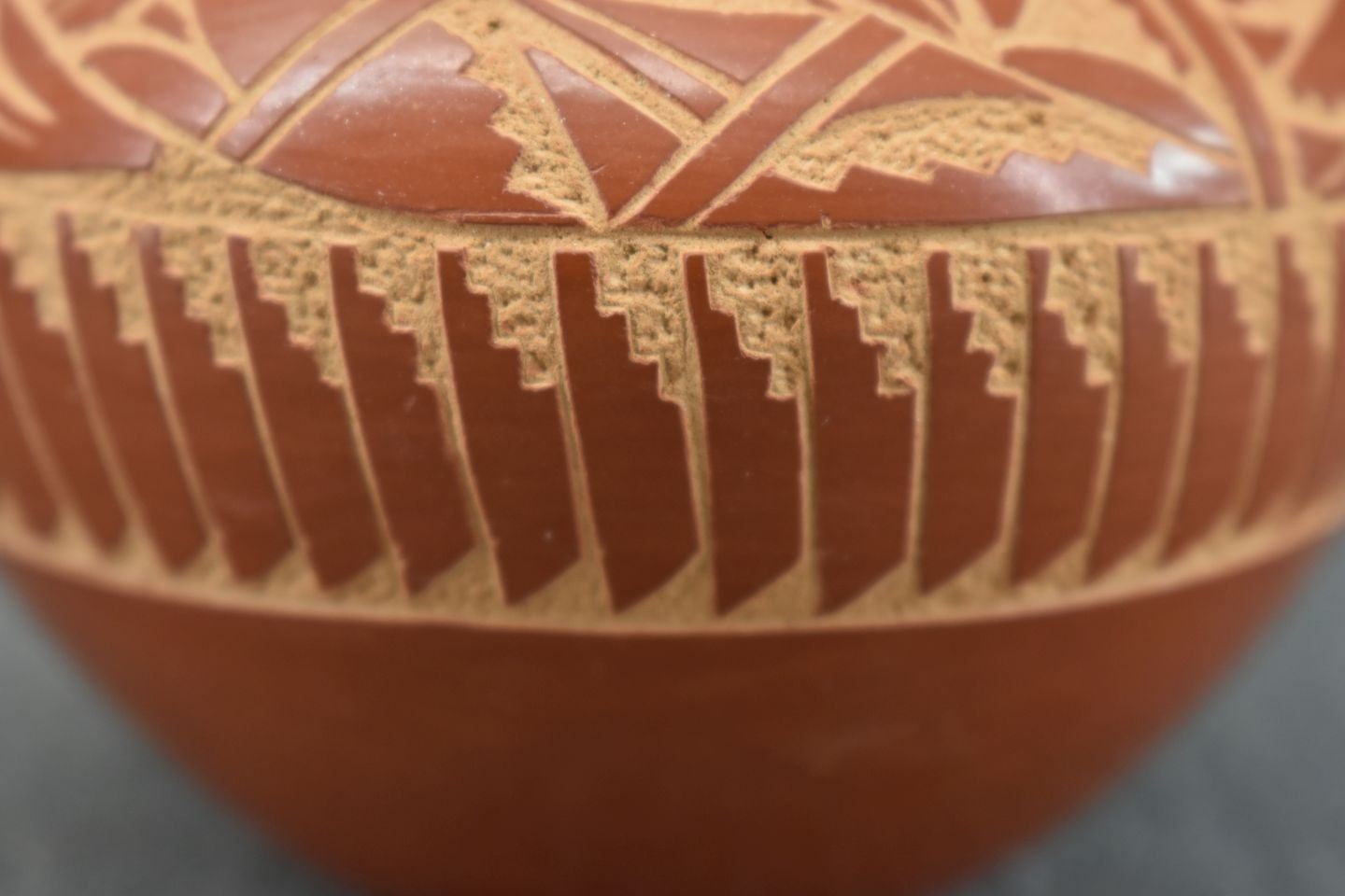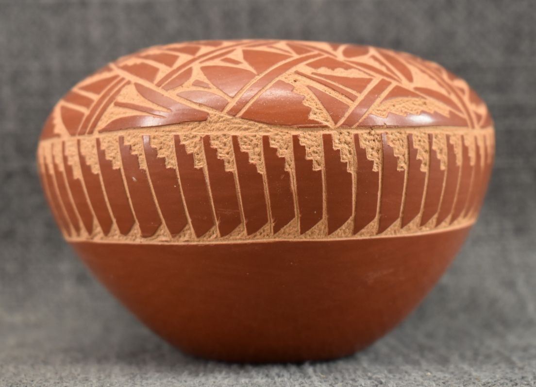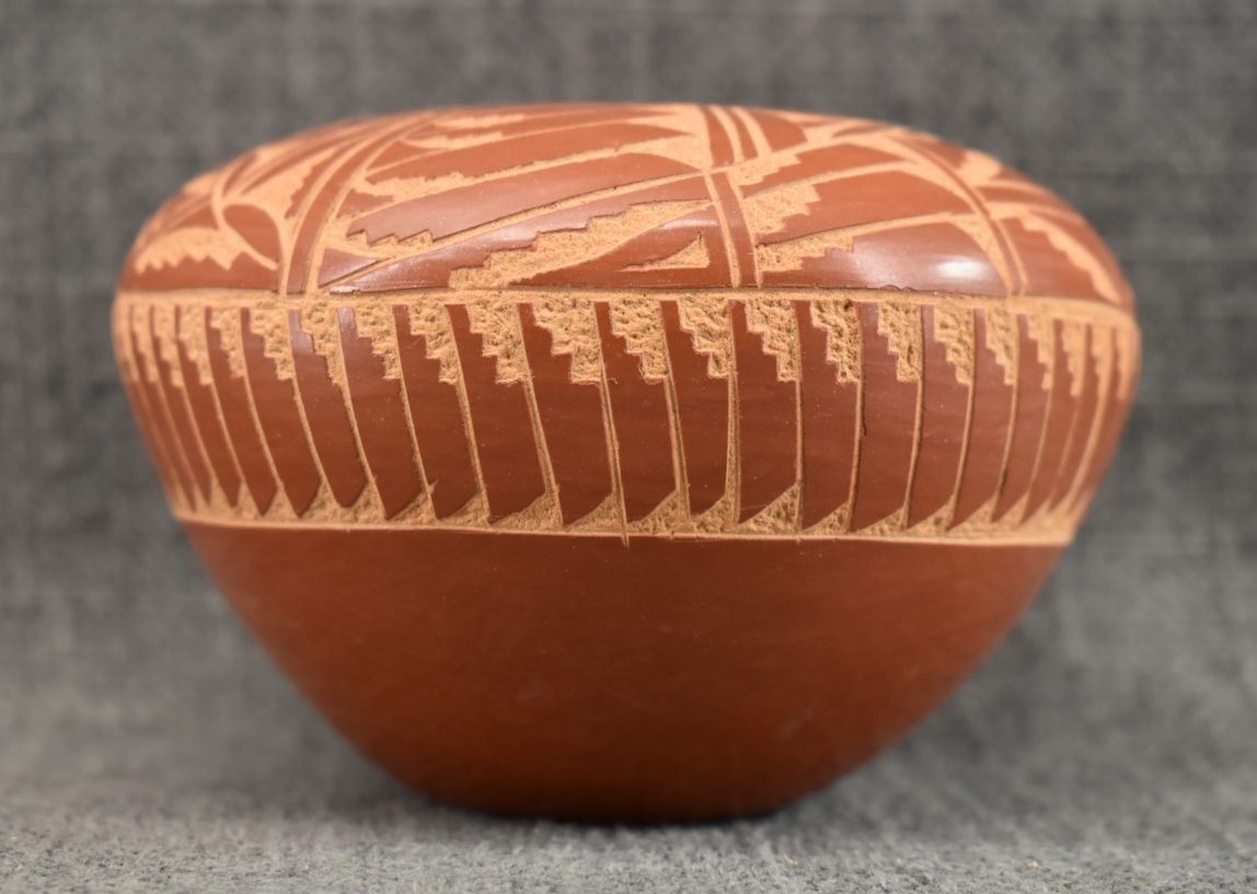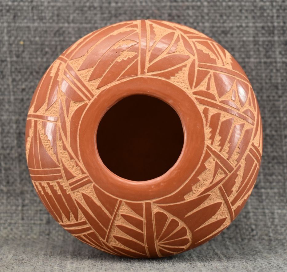 1980-90's Jemez, hand coiled with sgraffito geometric and feather design by Lorraine Chinana Walatowa 2.75" x 3.75"