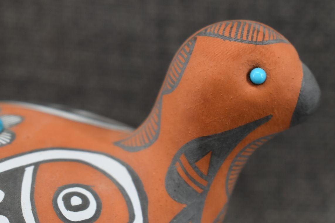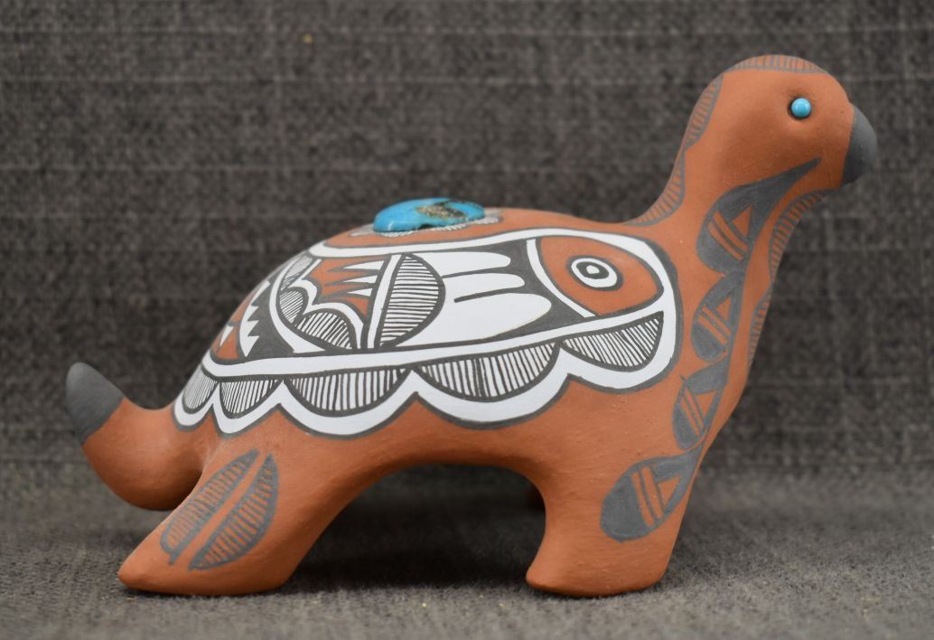 1990's Jemez, hand made and painted polychrome design with turquoise stones by Mary Small 3.25" x 3.75" x 5.75"