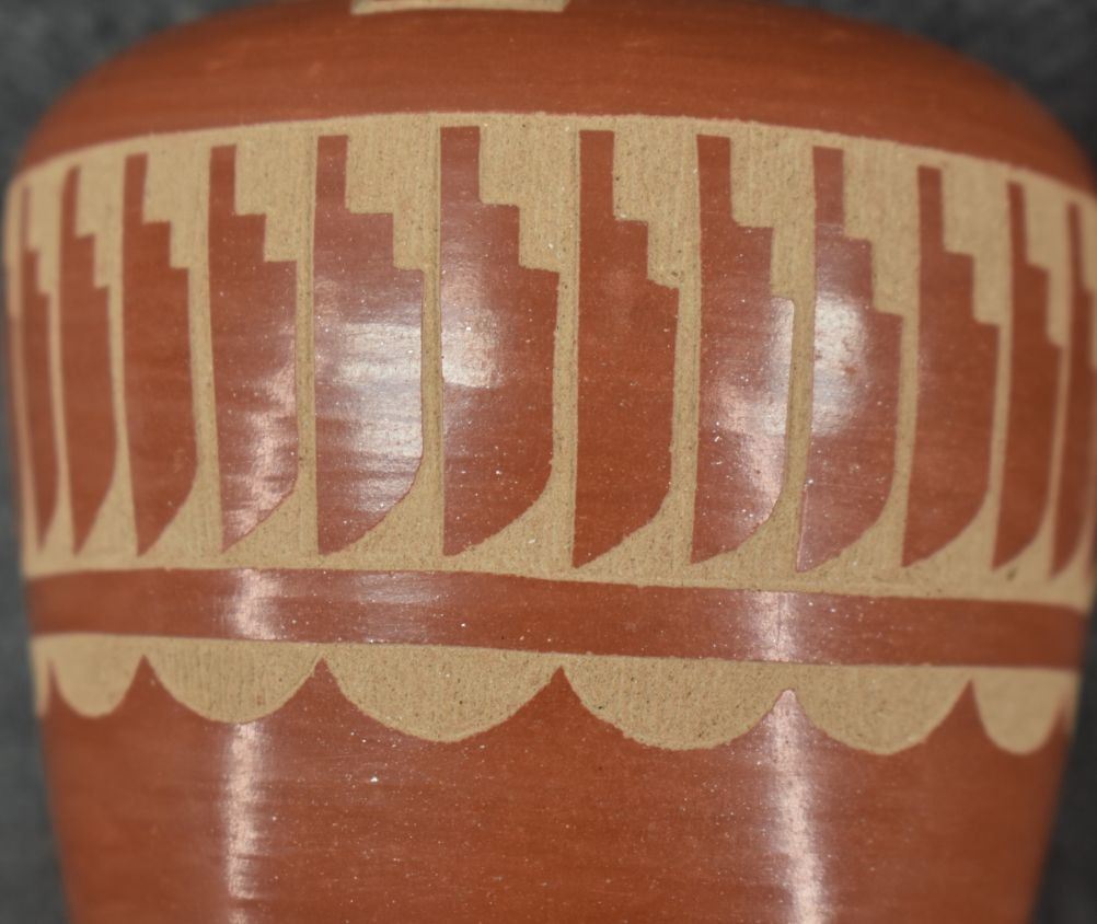 1990's Jemez, hand coiled with sgraffito feather design signed A Cajero. 2.75'' x 2.25''