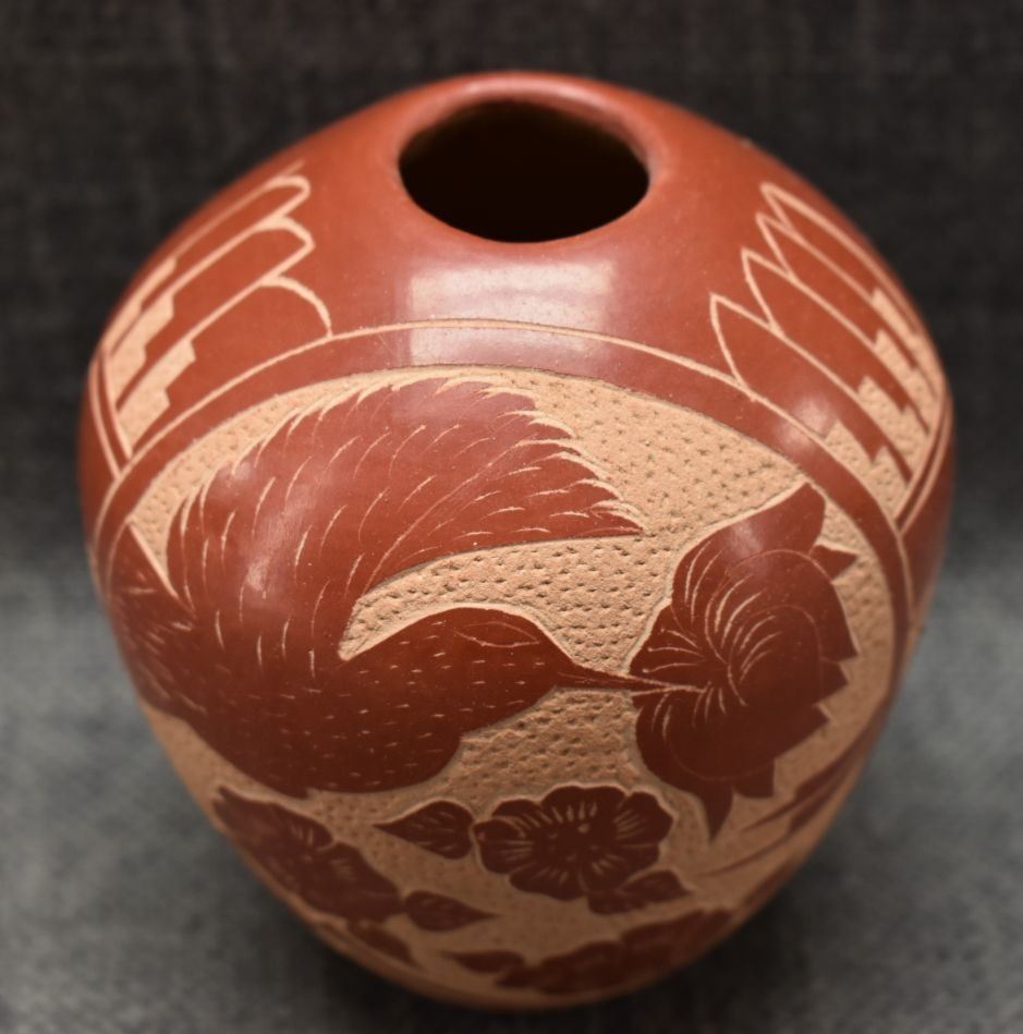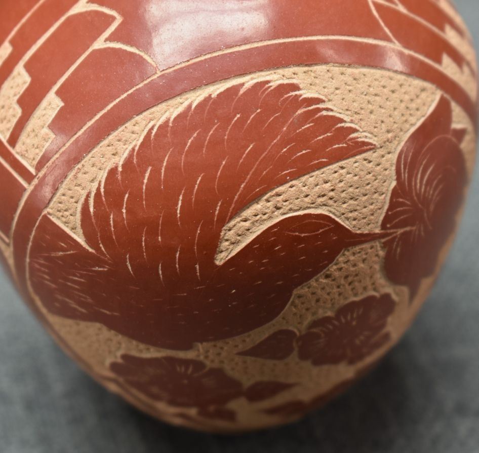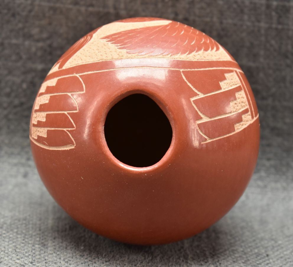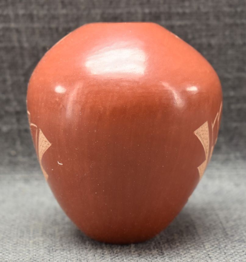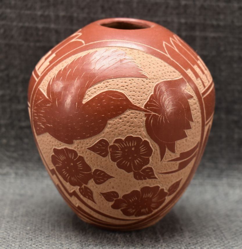 1990's Jemez, hand coiled with sgraffito hummingbird, floral, and geometric design signed Brenda Tafoya 3.5" x 3.25"