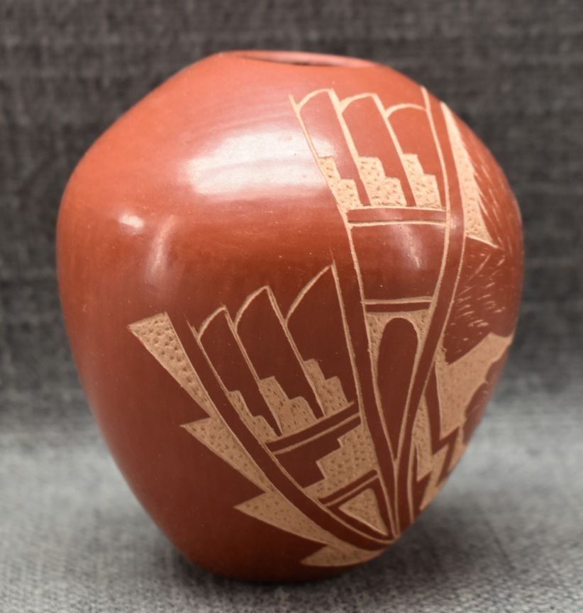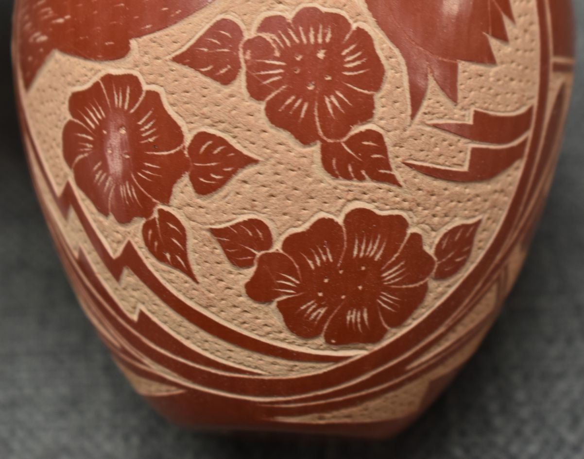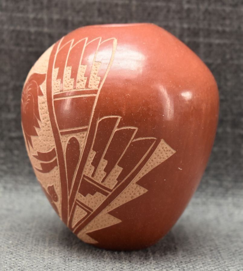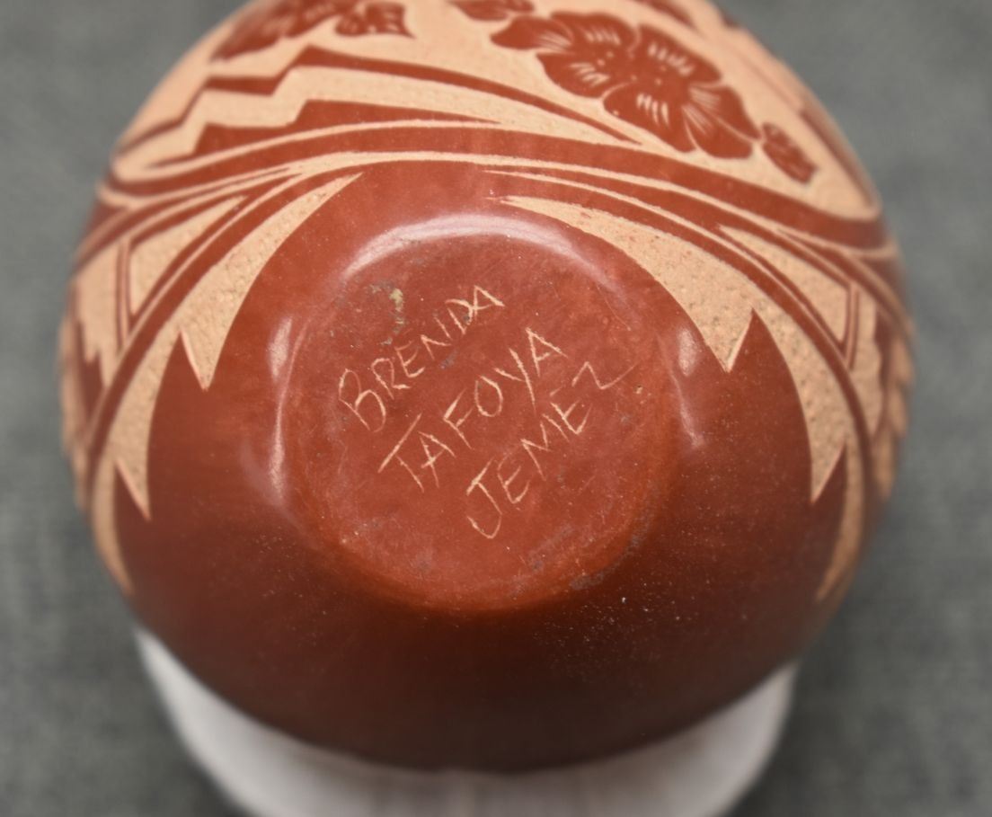 1990's Jemez, hand coiled with sgraffito hummingbird, floral, and geometric design signed Brenda Tafoya 3.5" x 3.25"