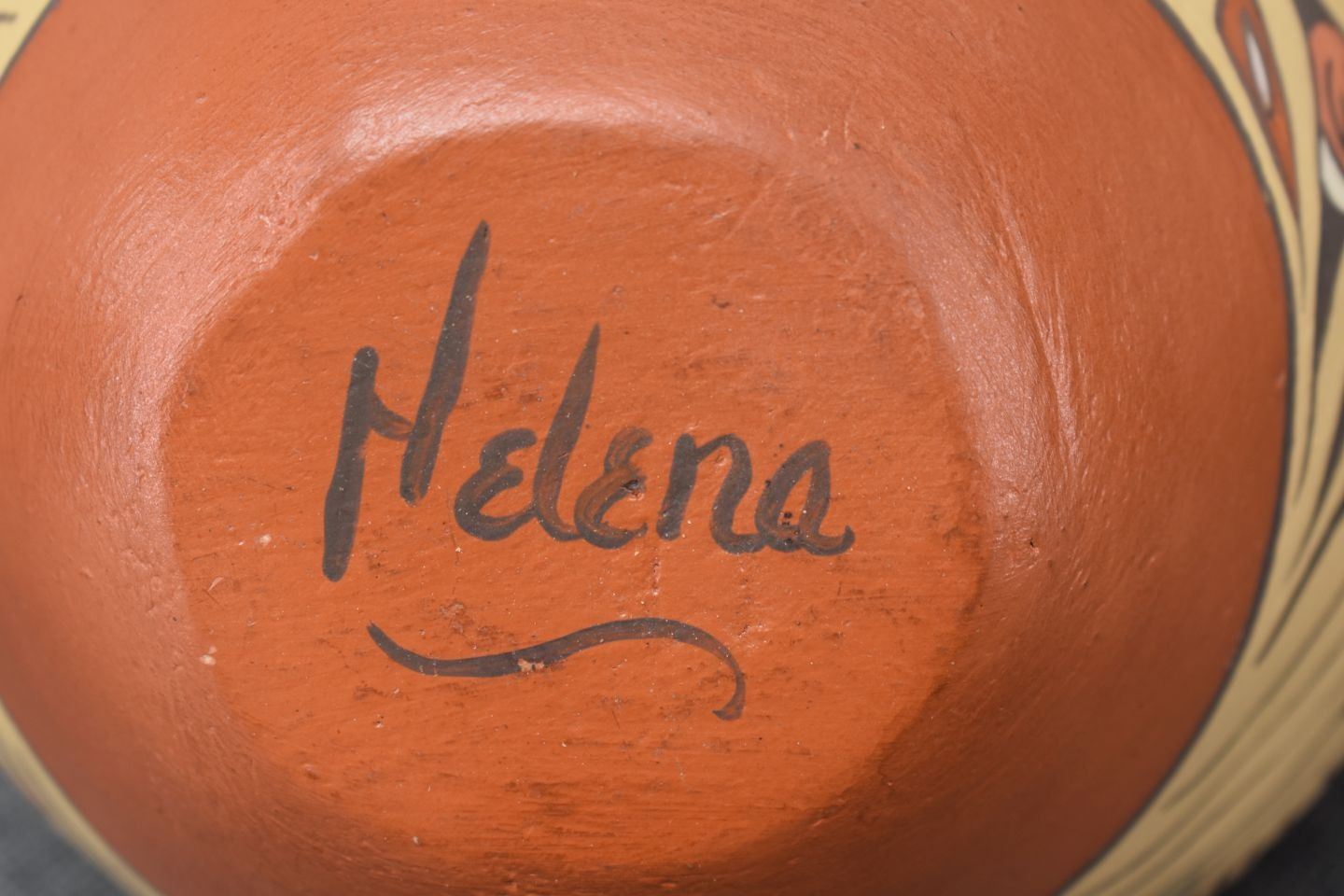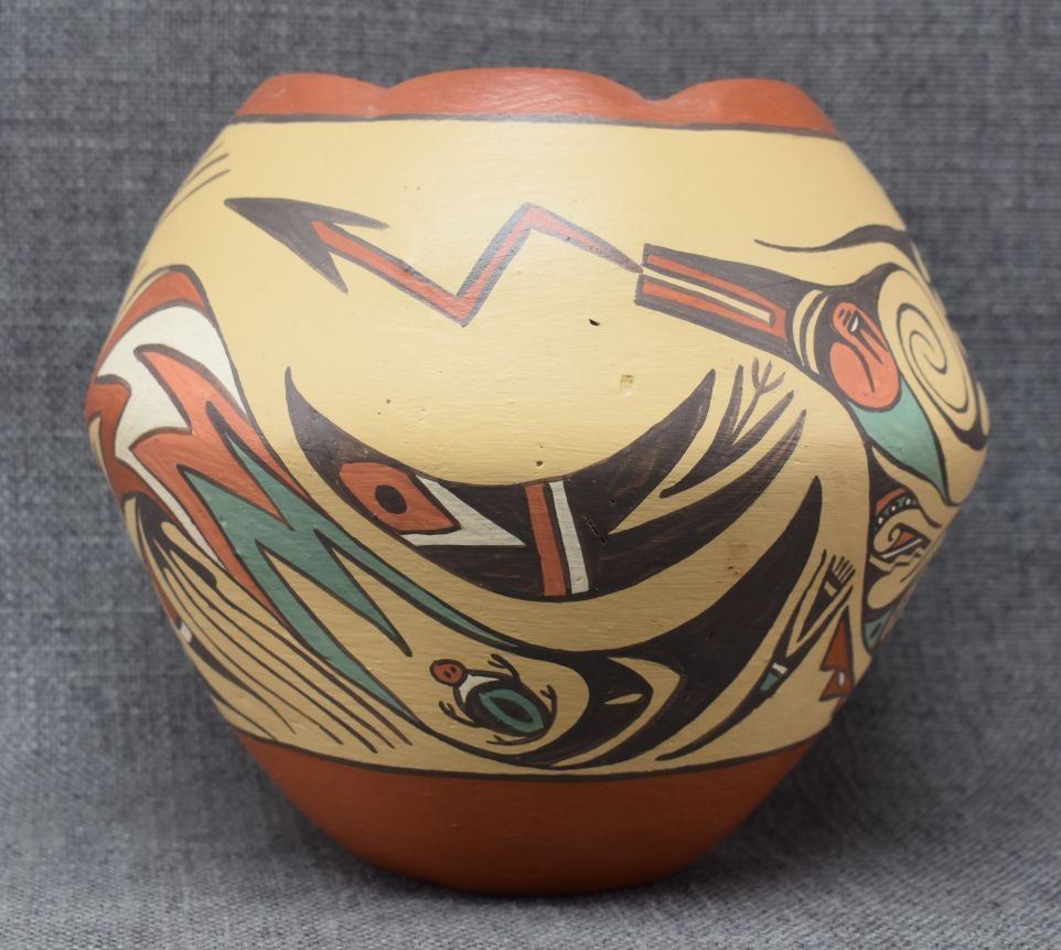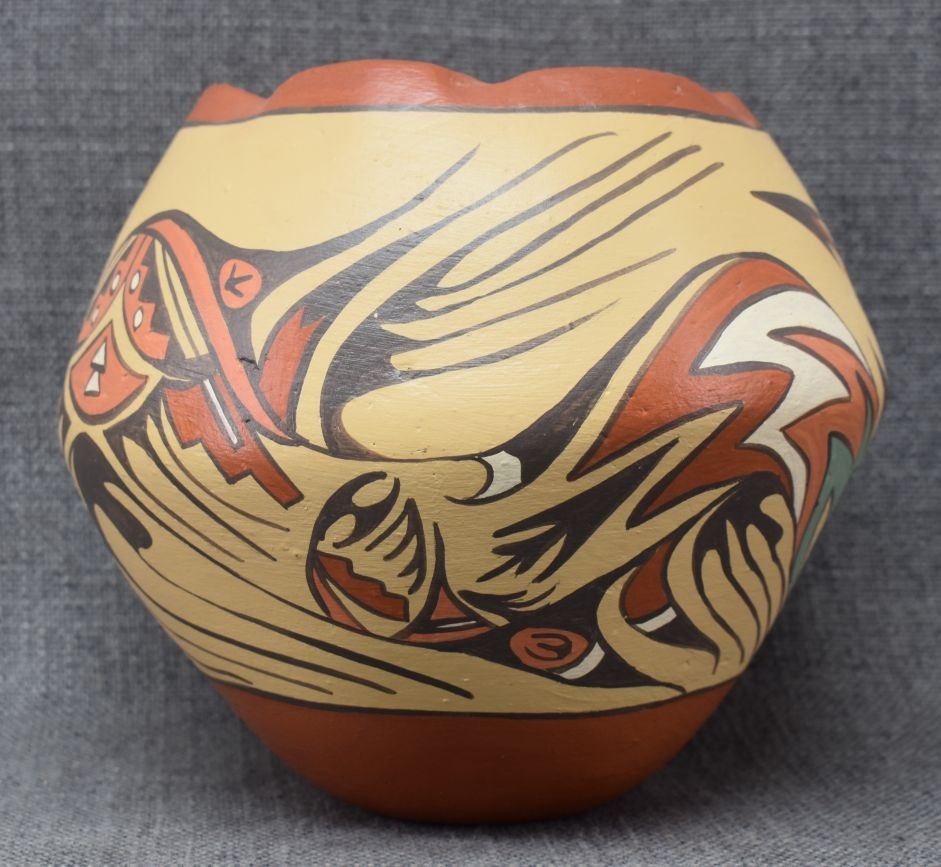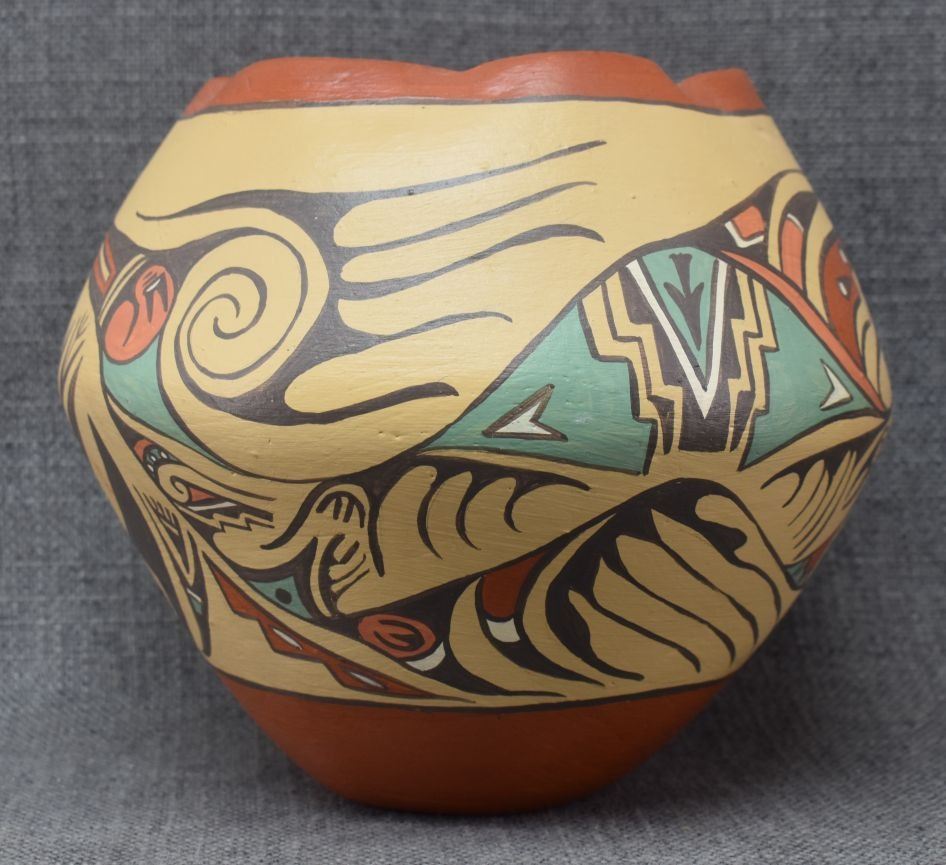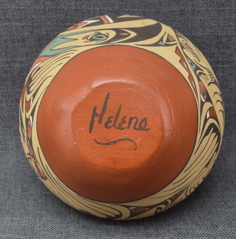 1980's Jemez, hand coiled with polychrome painted avanyu design signed Helena 6.5" x 7.25"