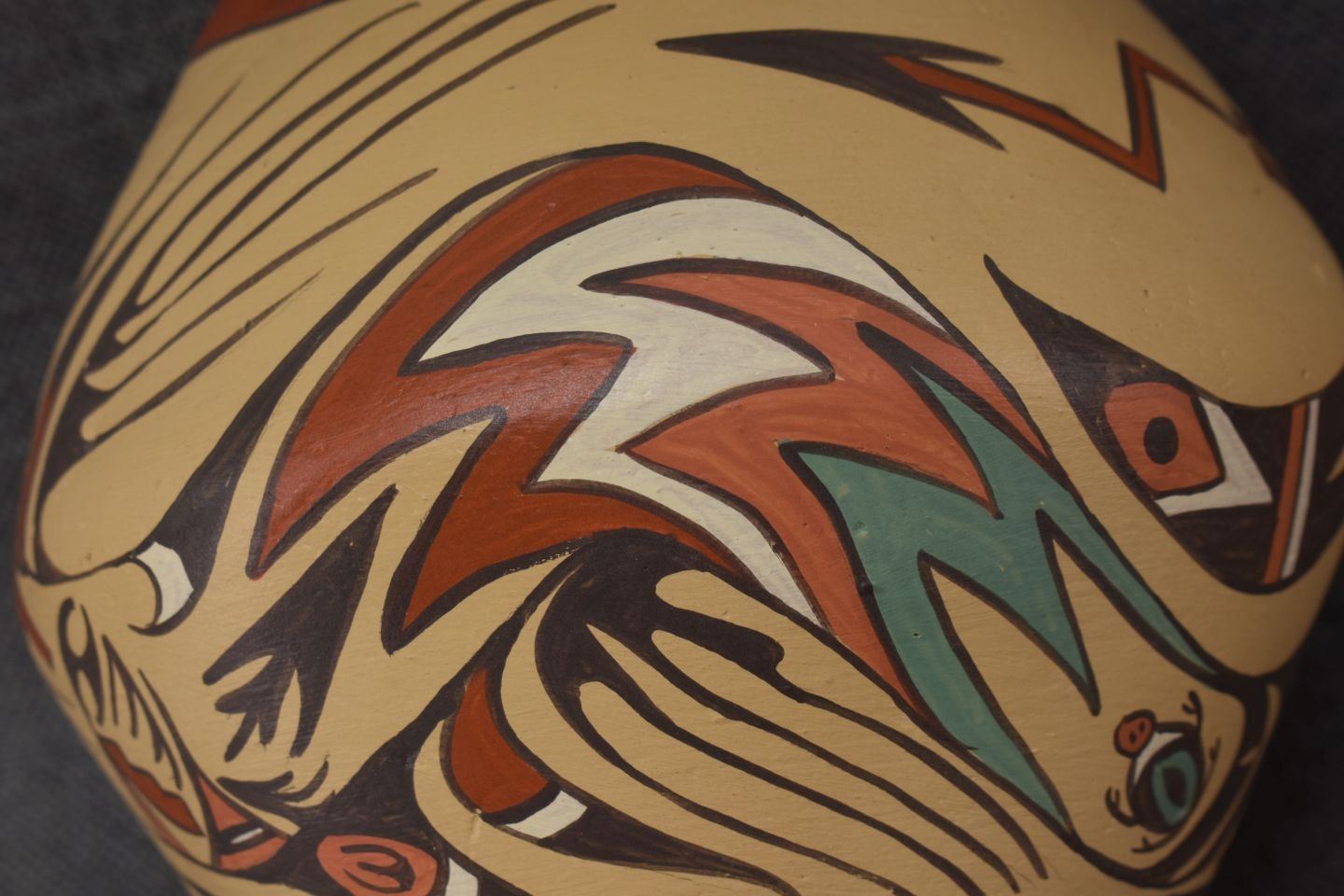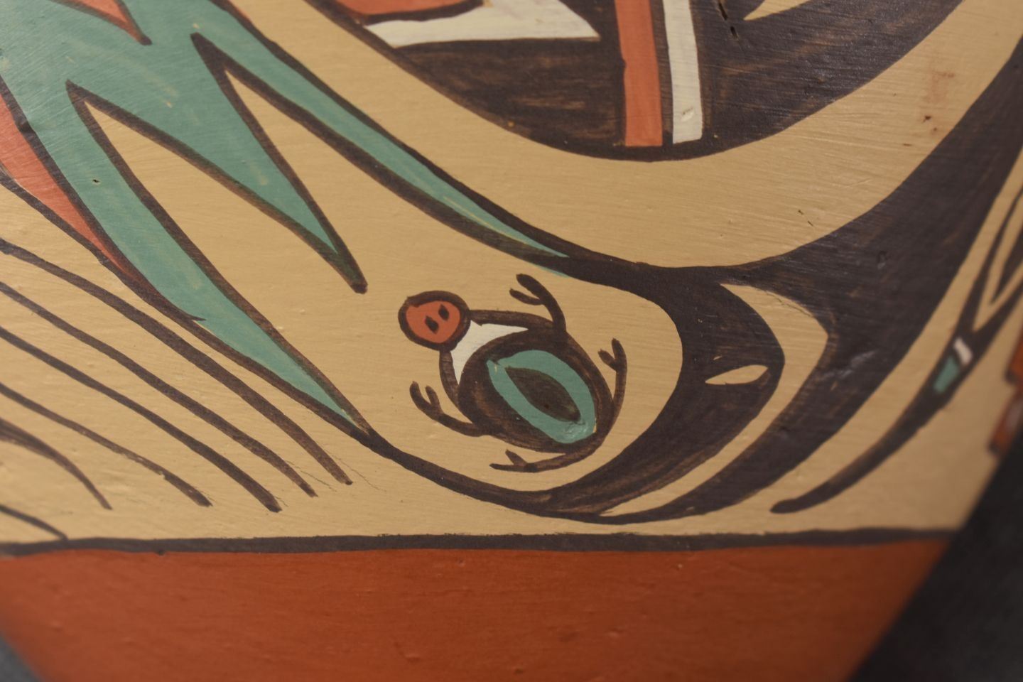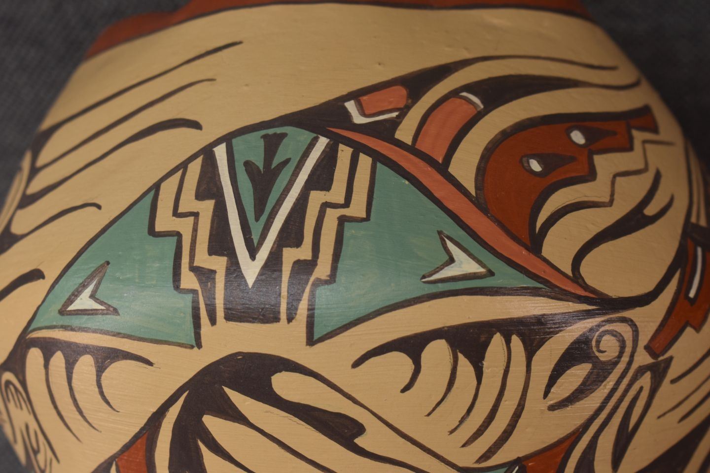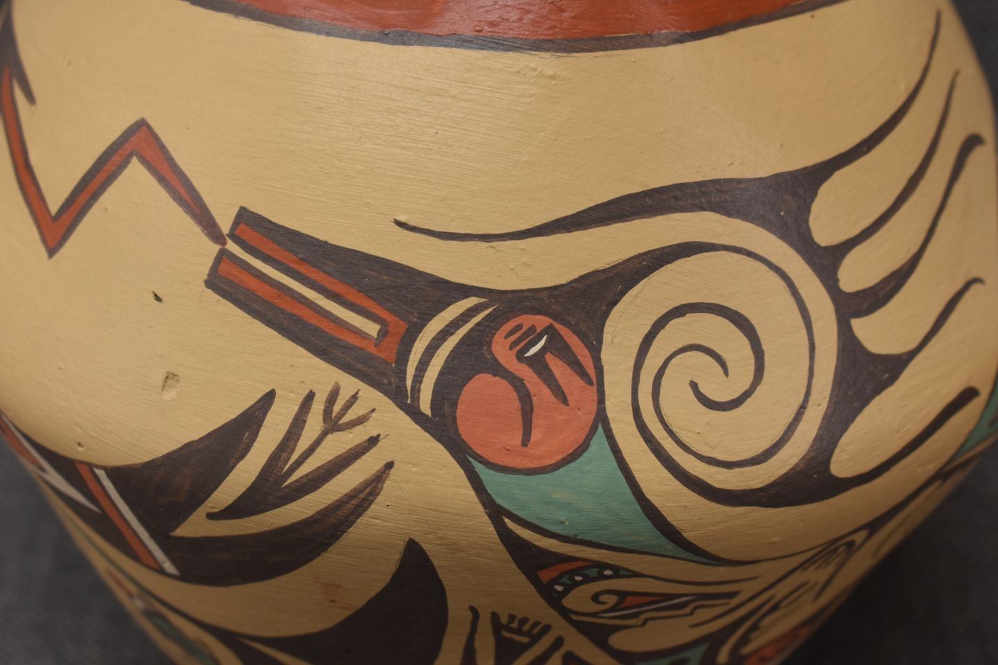 1980's Jemez, hand coiled with polychrome painted avanyu design signed Helena 6.5" x 7.25"