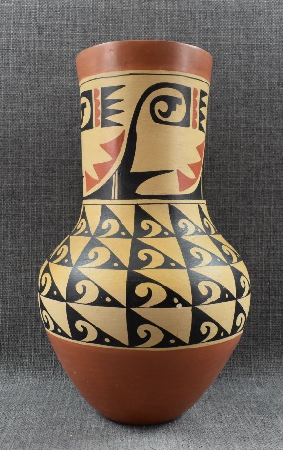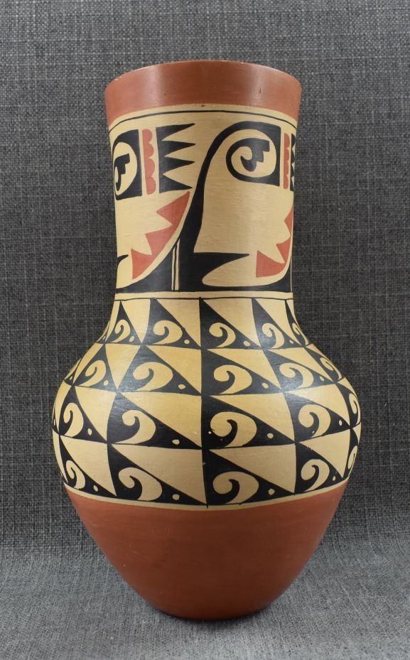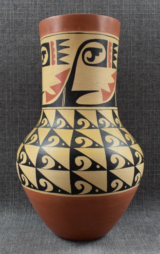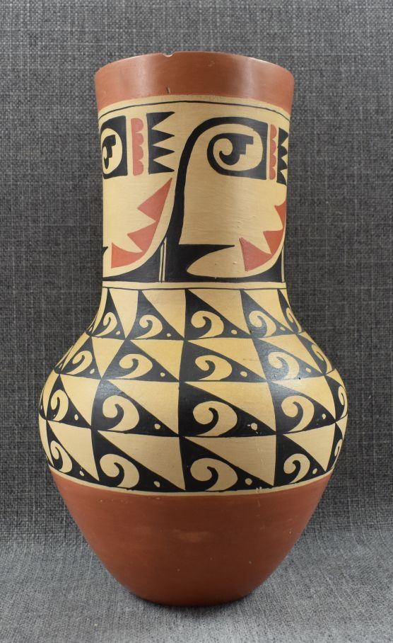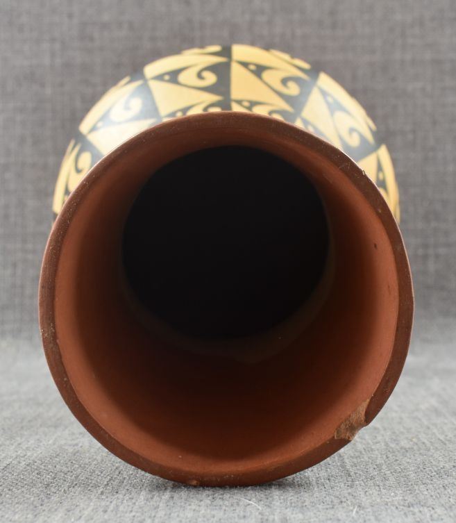 1960's Jemez Pottery hand coiled polychrome vase signed Percingula R Tosa. Has chip in rim. 12" x 6.5"