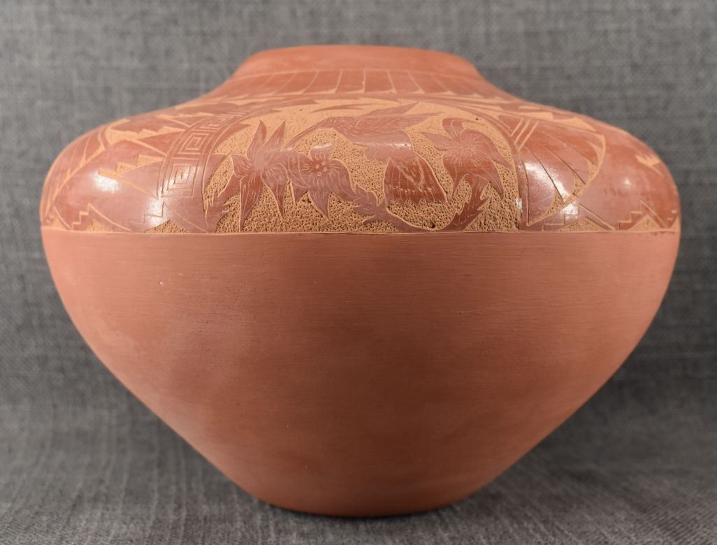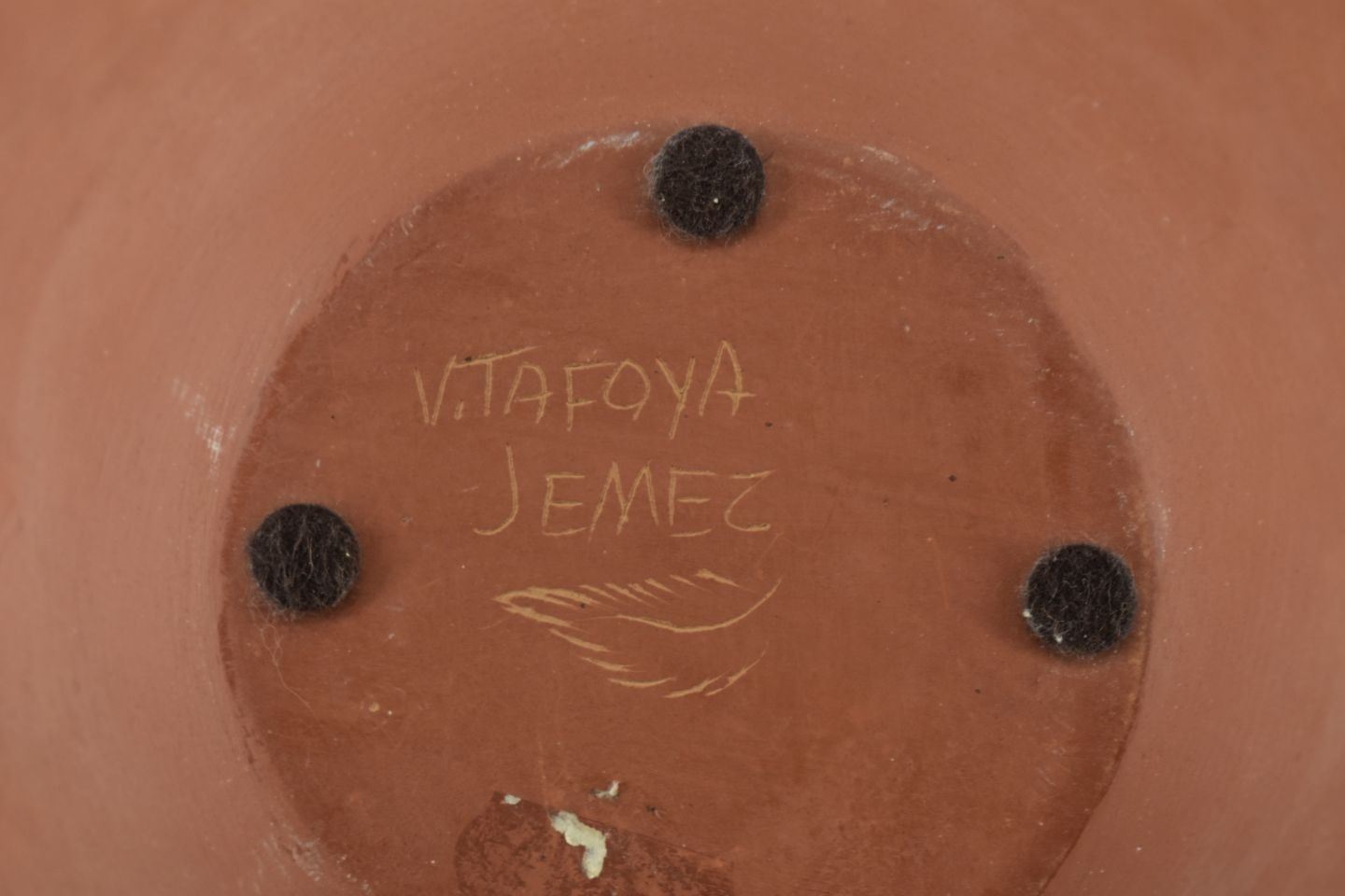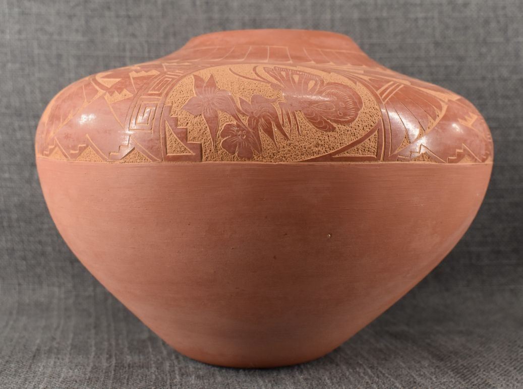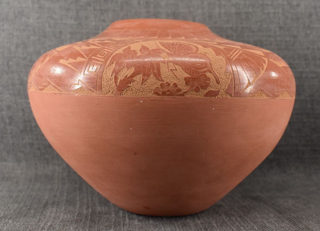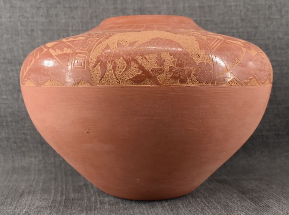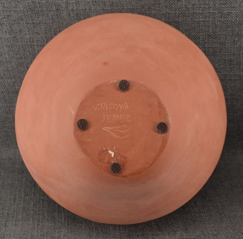 1980's Jemez. Hand coiled and sgraffito design pottery vase, signed V. Tafoya. 6.5'' x 9'' has unusual finish