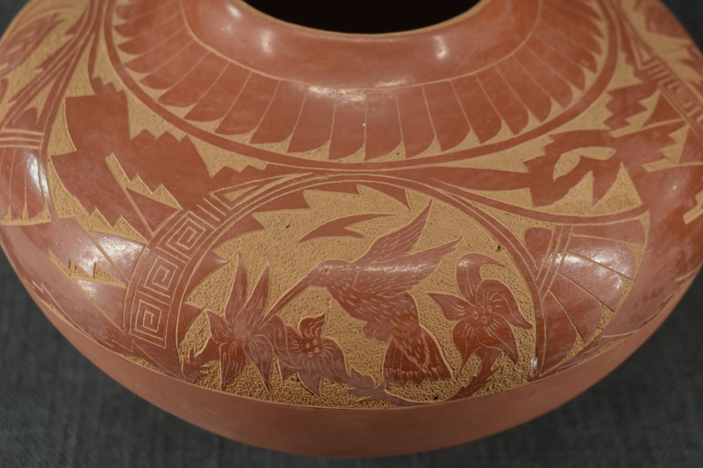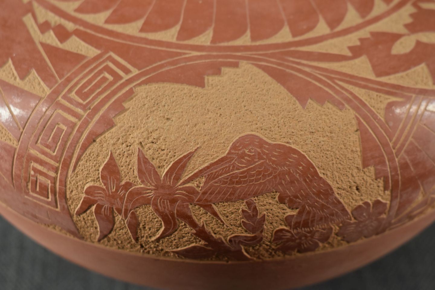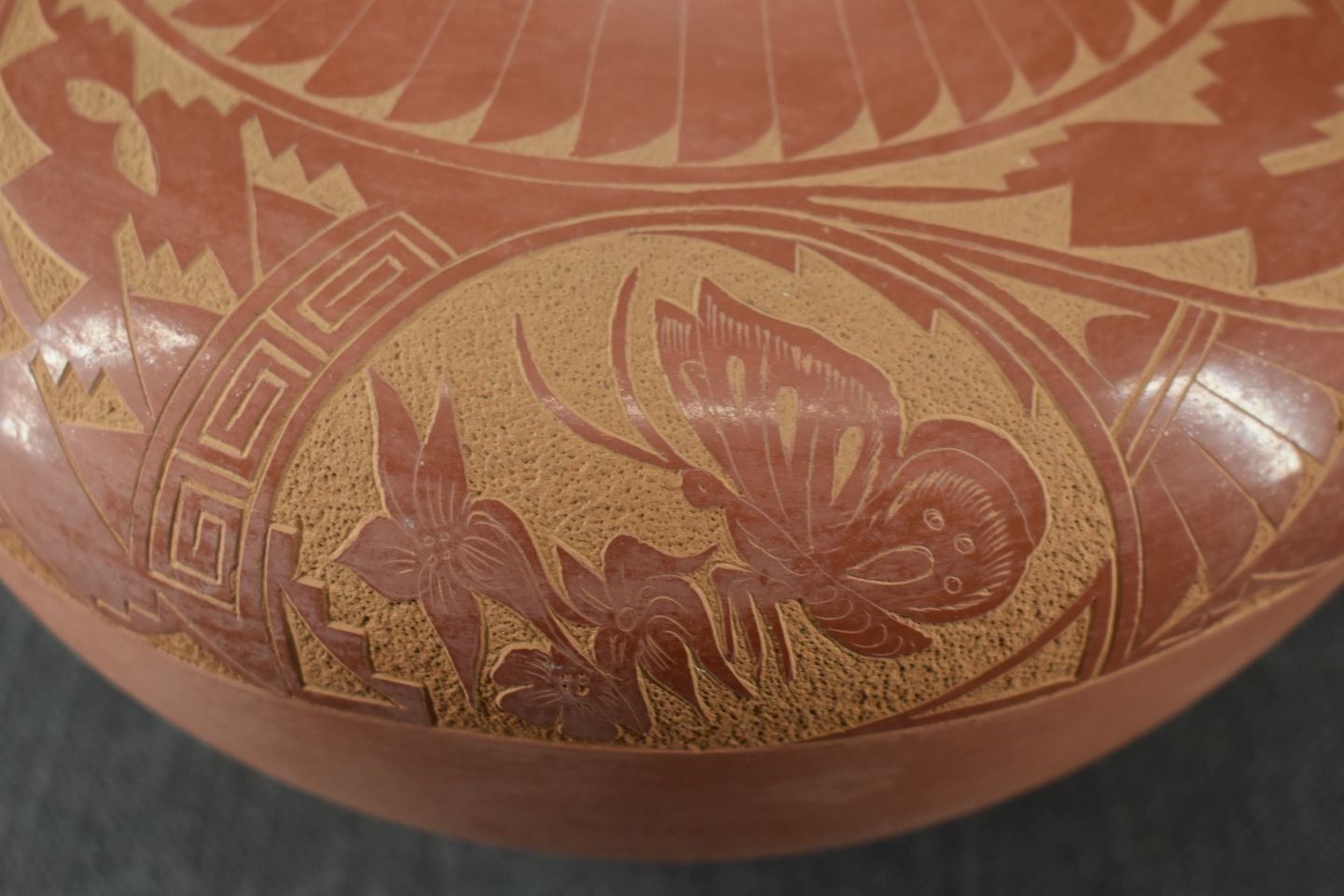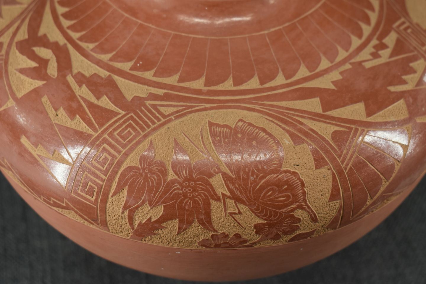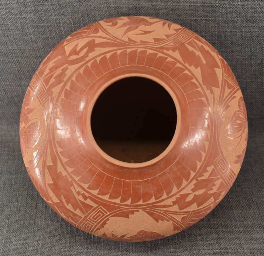1980's Jemez. Hand coiled and sgraffito design pottery vase, signed V. Tafoya. 6.5'' x 9'' has unusual finish