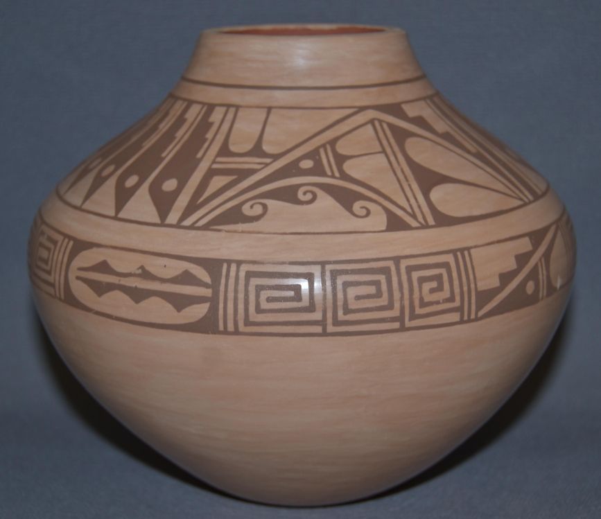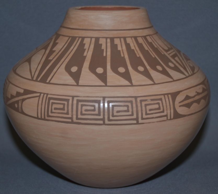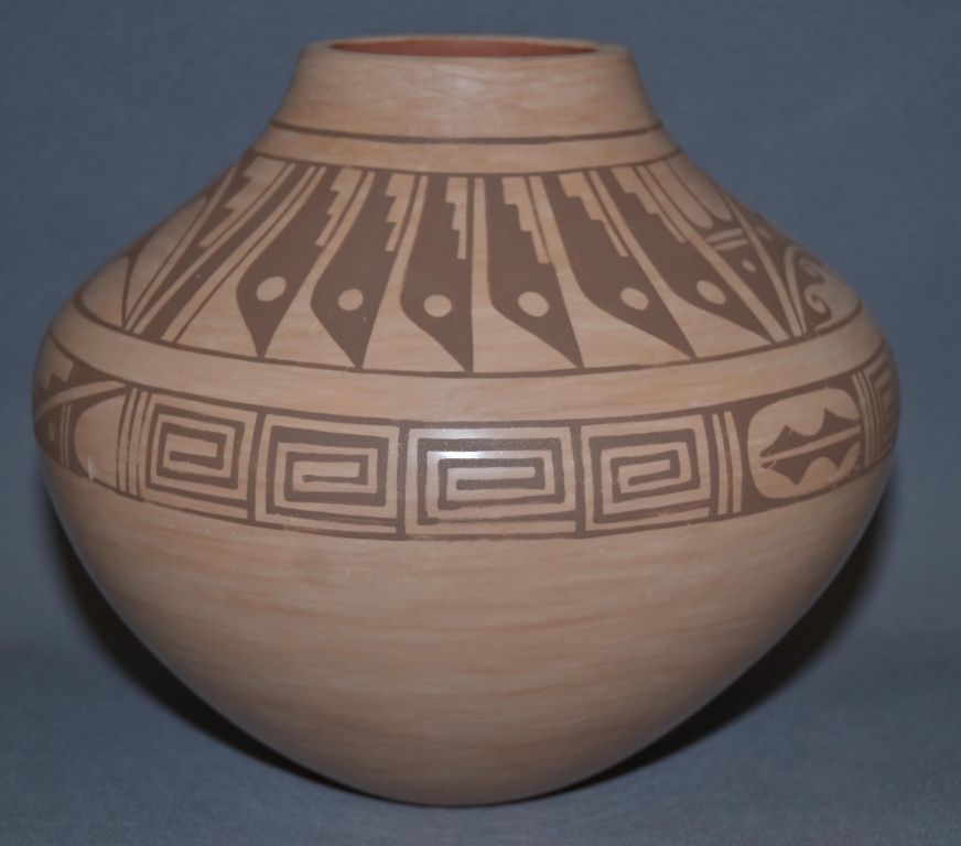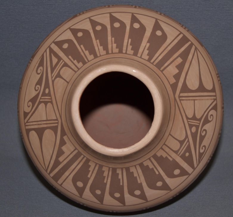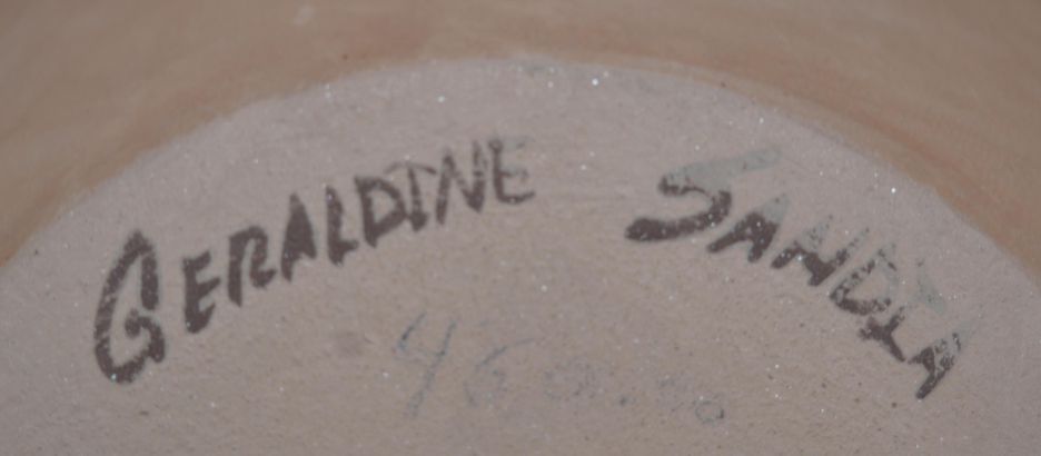 contemporary brown on tan feather and geometeric design minor paint rubbing signed Geraldine Sandia 6.5"x7.5"
