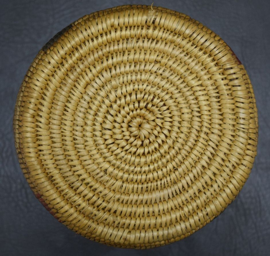 1960's hand woven polychrome geometric design basket. 6'' x 9'' x 8''