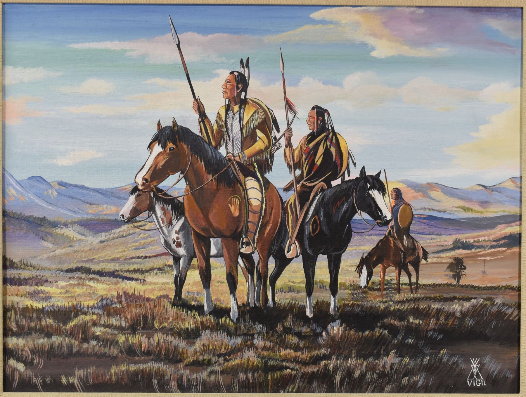 1960's Jicarilla. Original on artist board. Depicting native warriors, signed Frank Vigil 18'' x 24'' frame size 23'' x 29''