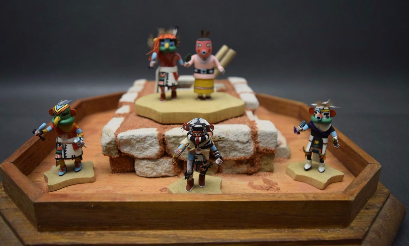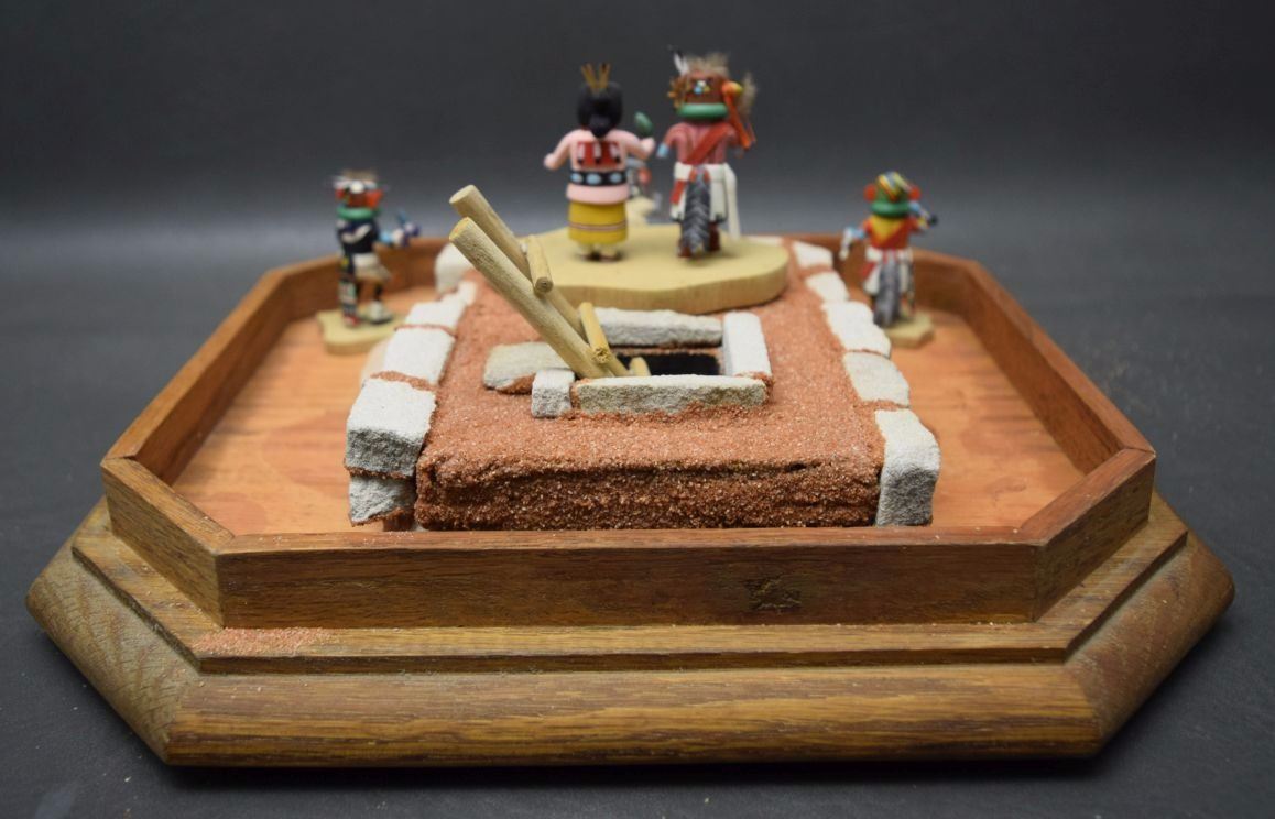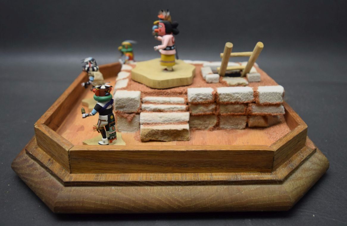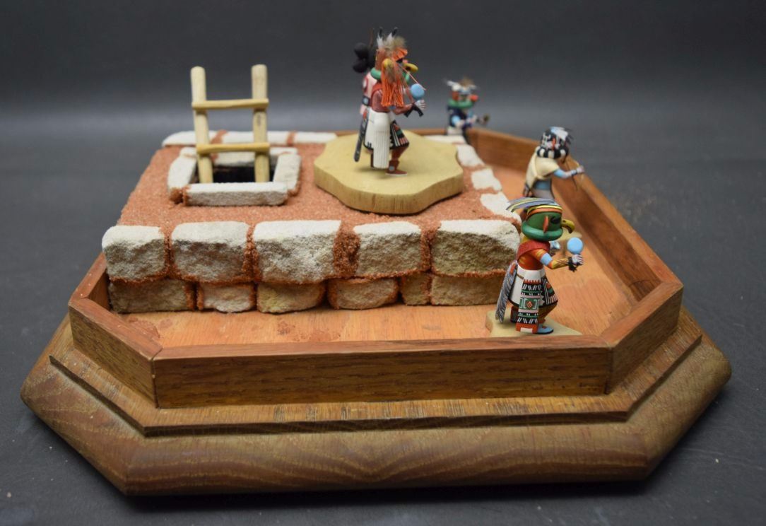 1988 five hand carved cotton wood kachinas all approx. 2'' tall and kiva with glass lid 7'' x 10'' x 10'' all signed Stewart Dukepoo