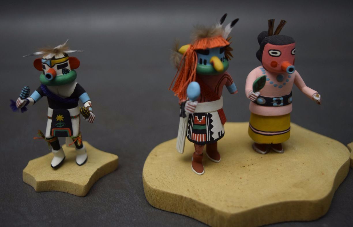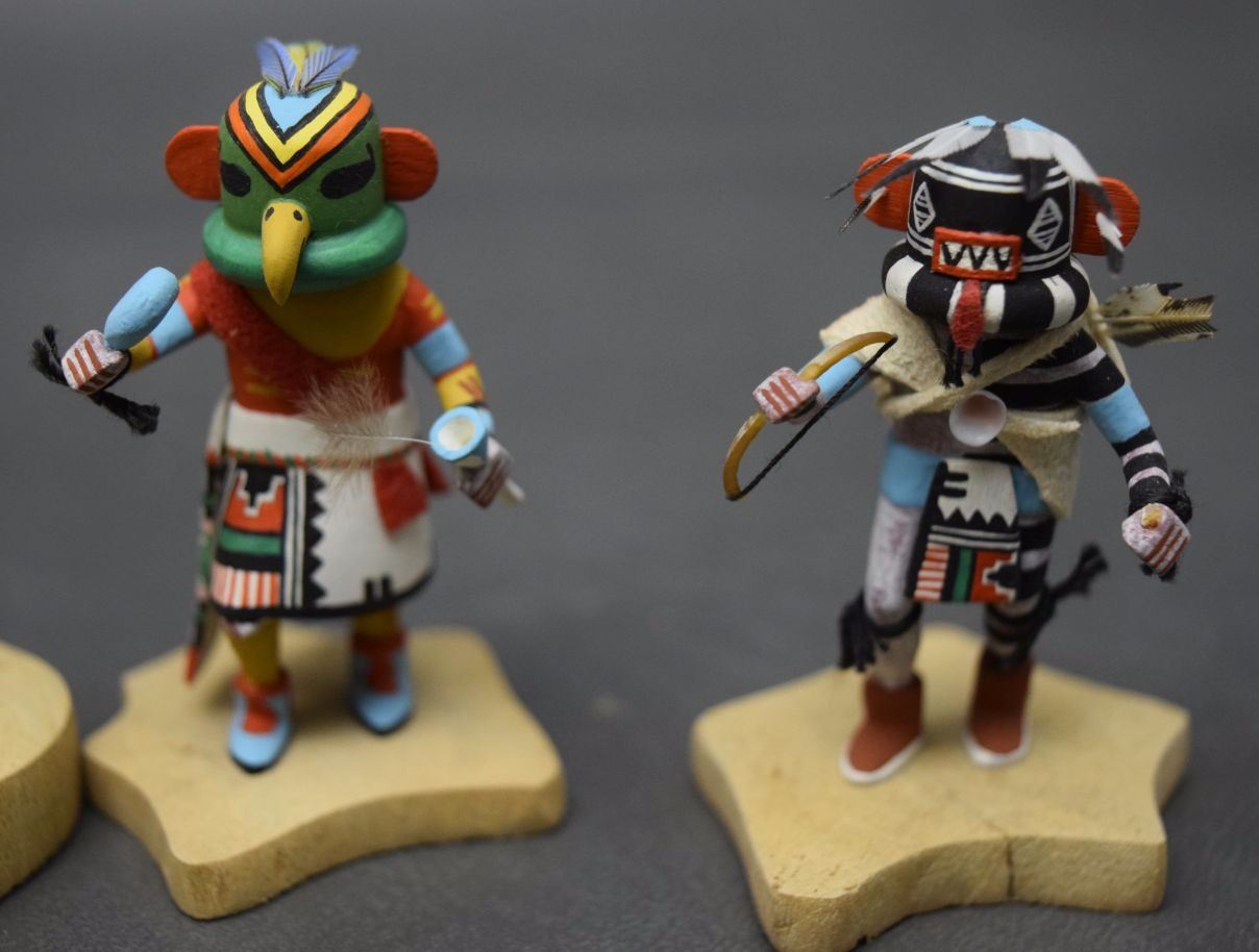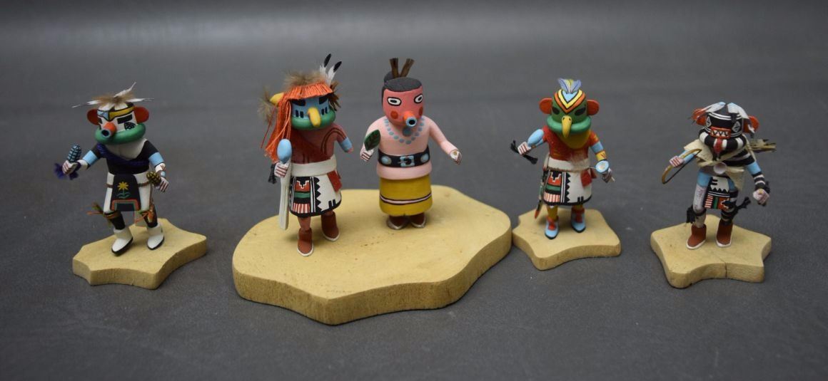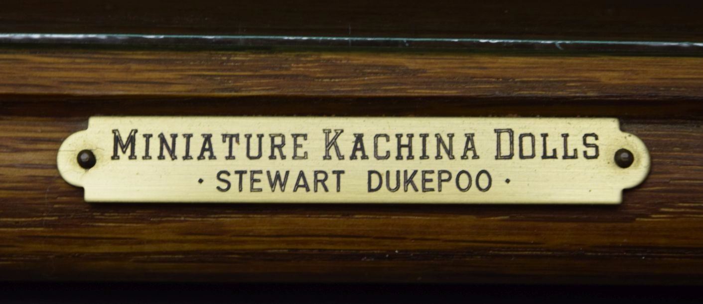 1988 five hand carved cotton wood kachinas all approx. 2'' tall and kiva with glass lid 7'' x 10'' x 10'' all signed Stewart Dukepoo
