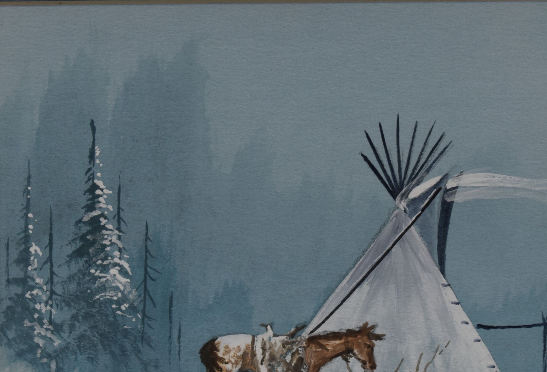 1983 Kiowa Indian. Original on paper depicting native camp, signed Whitebuffalo. 7'' x 5'' frame size 13'' x 11''