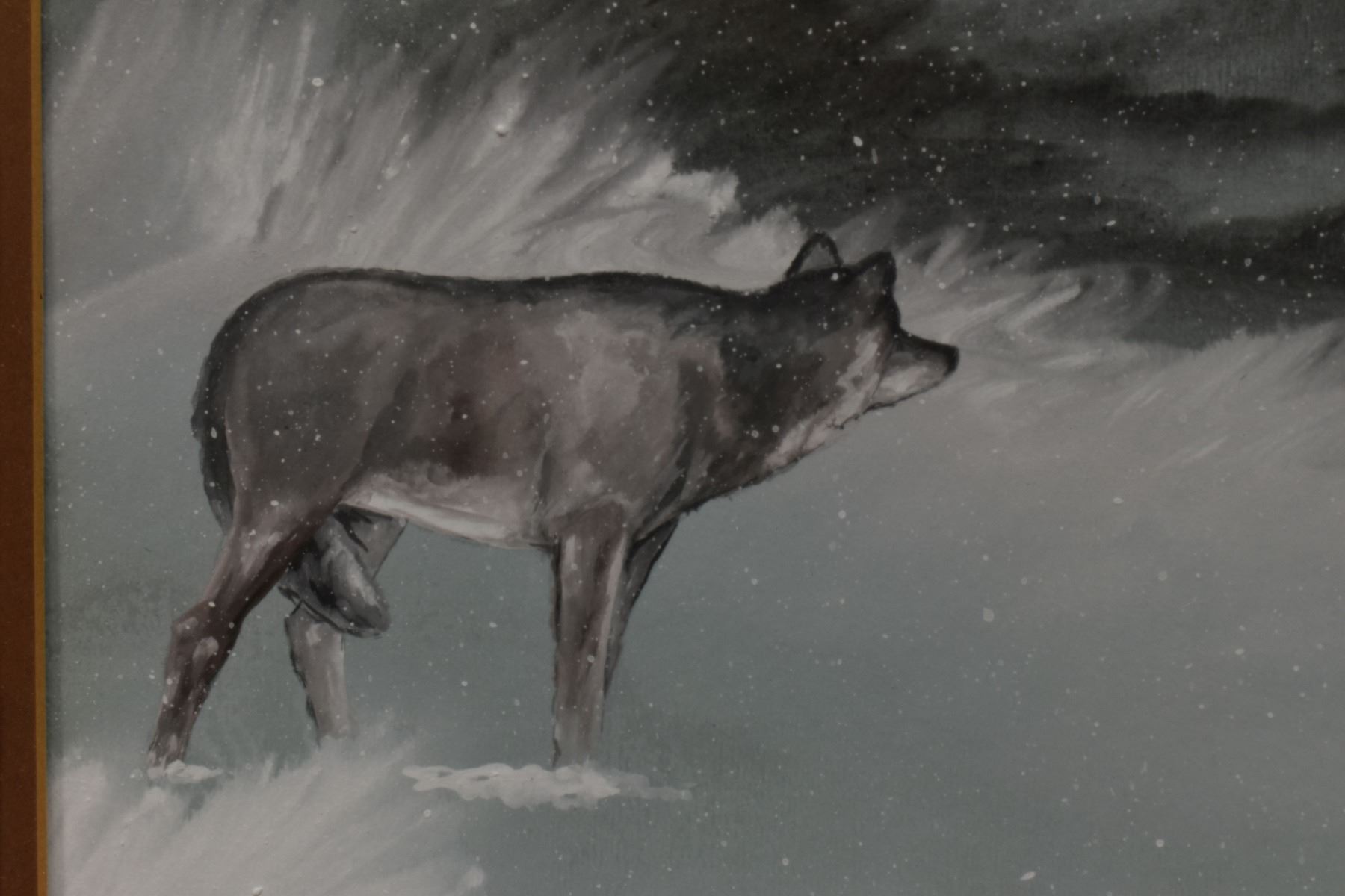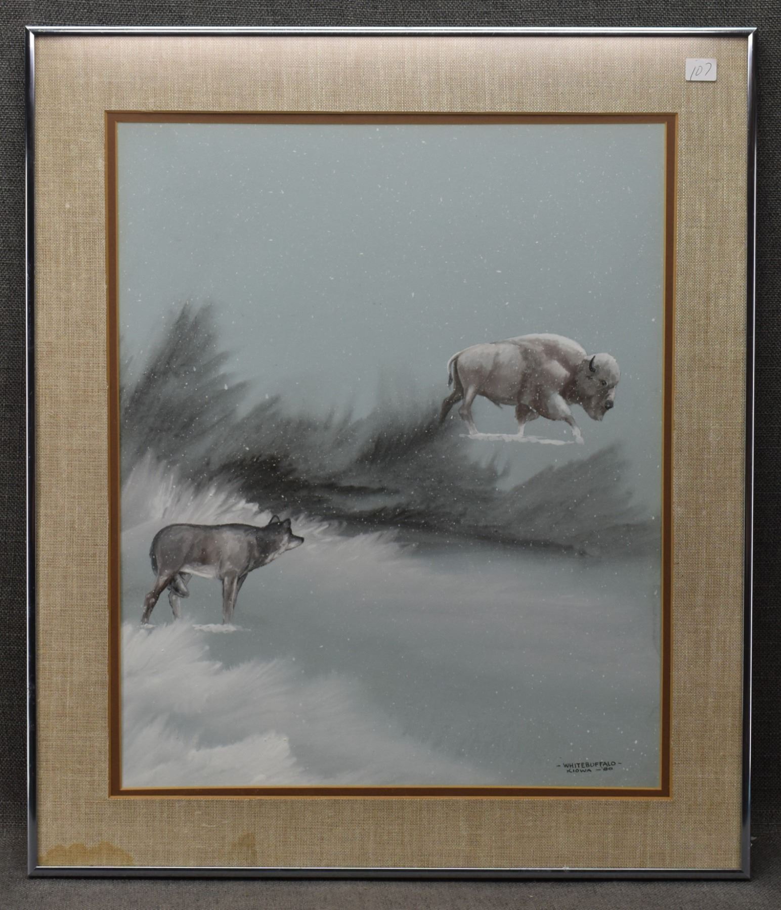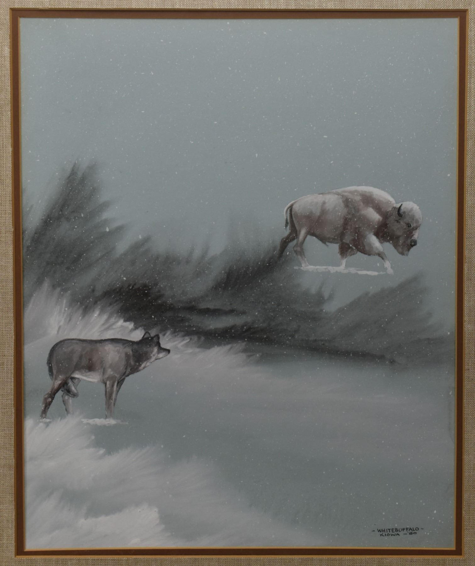 1980 Kiowa, original hand painted on paper of Buffalo and wolf in snow signed whitebuffalo 19" x 15"frame size 24" x 20"