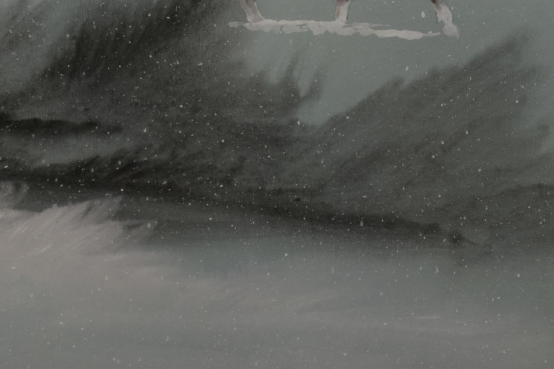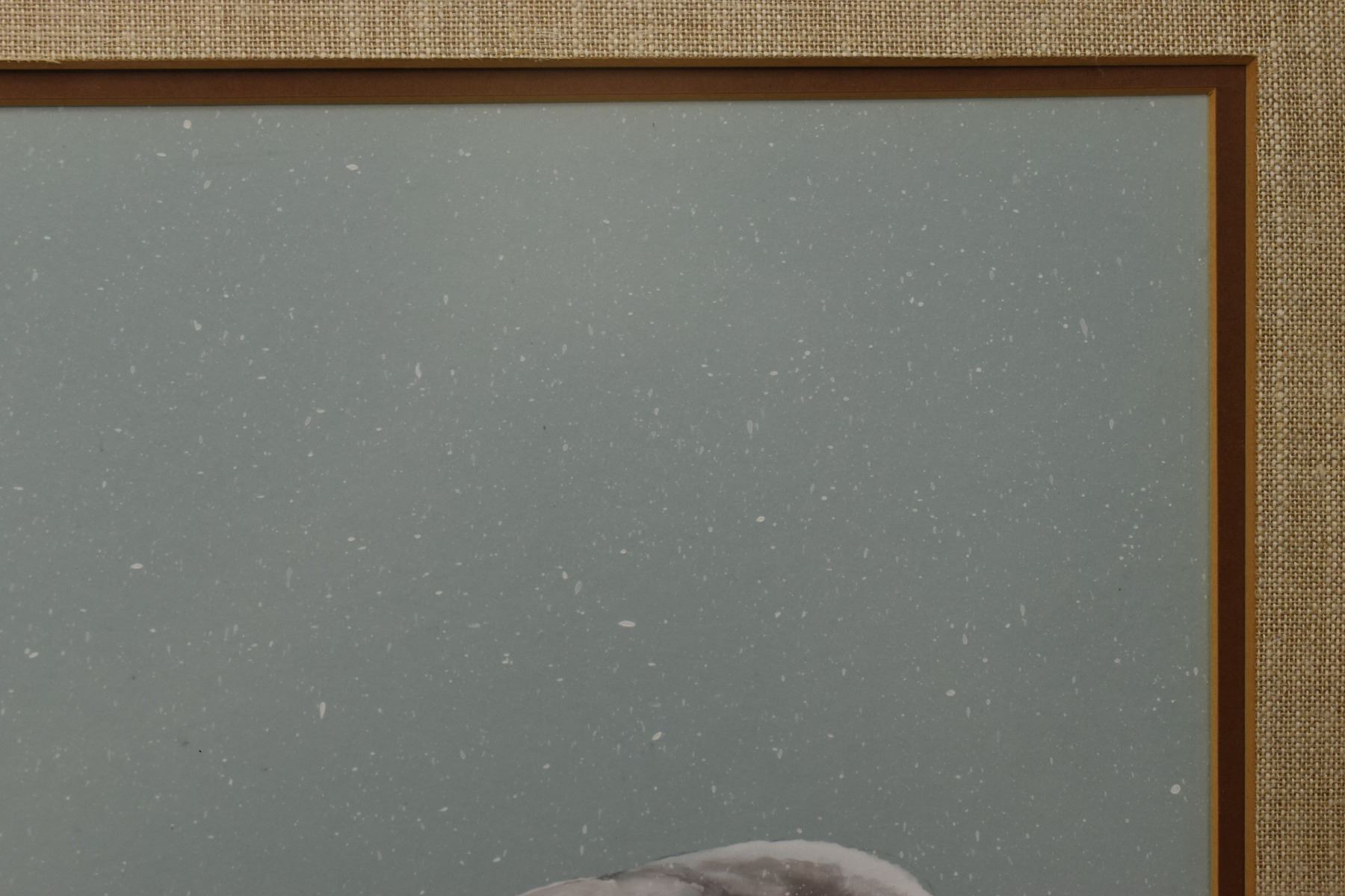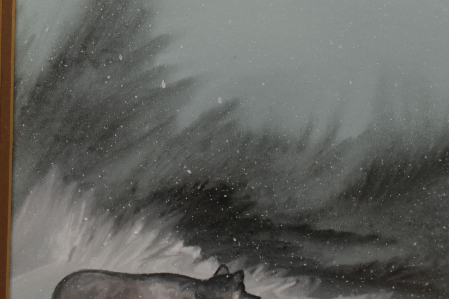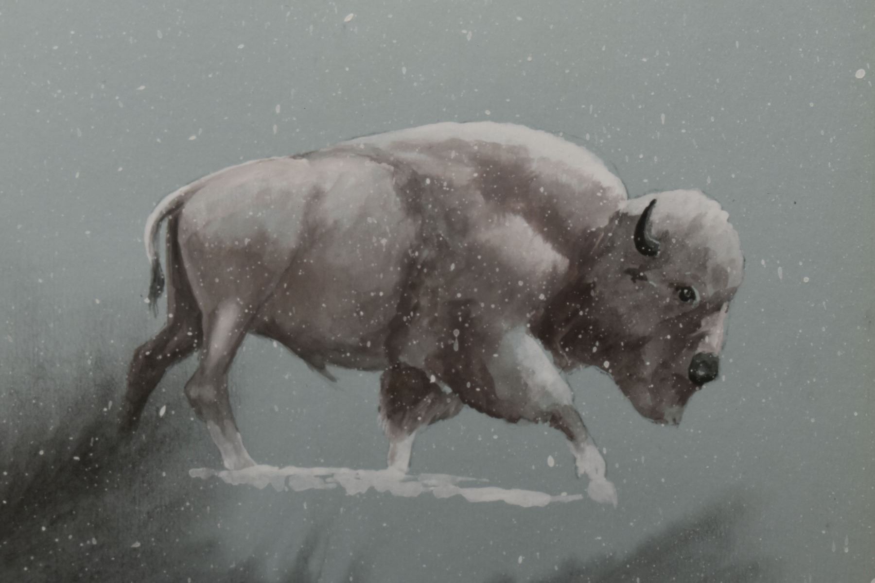 1980 Kiowa, original hand painted on paper of Buffalo and wolf in snow signed whitebuffalo 19" x 15"frame size 24" x 20"