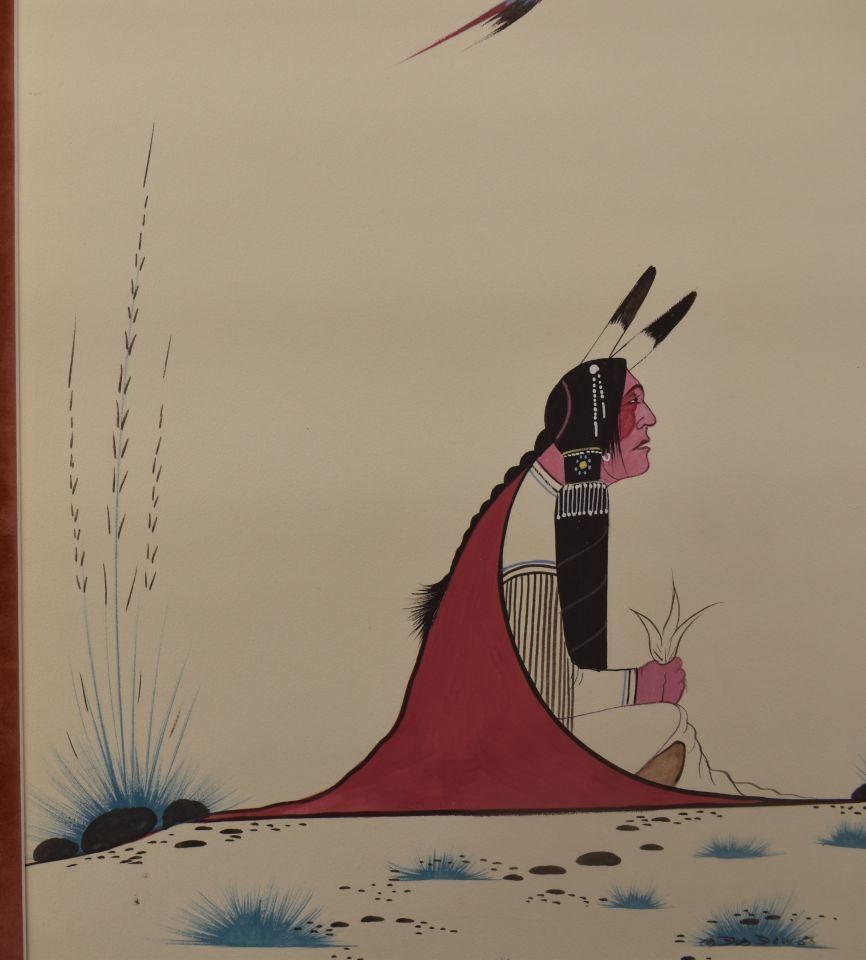 1968 Kiowa, original hand painted on paper of sitting man signed Big Bow 18.5" x 14.5" matted to 24" x 20"