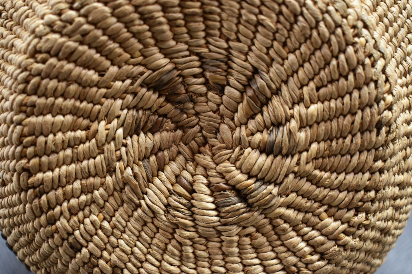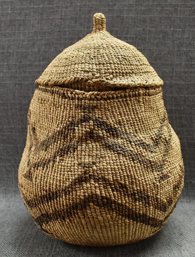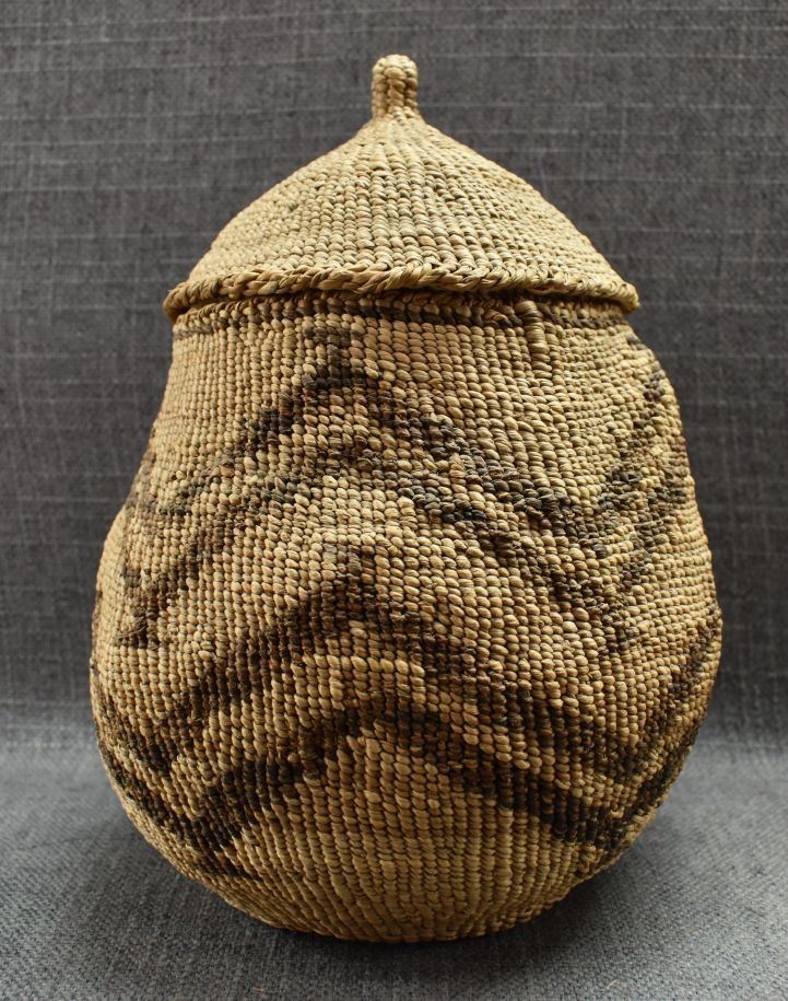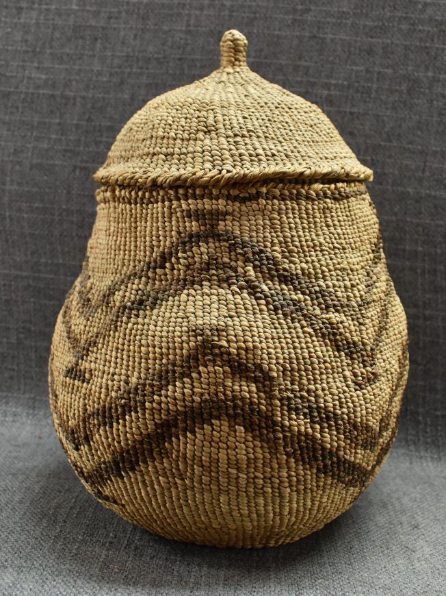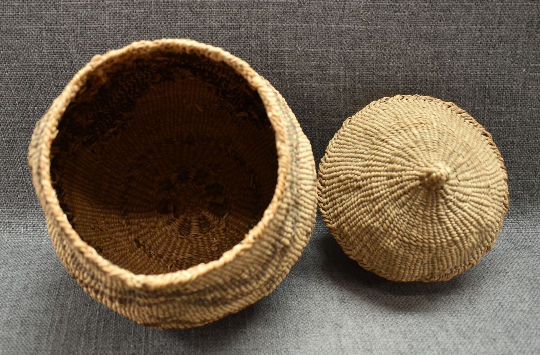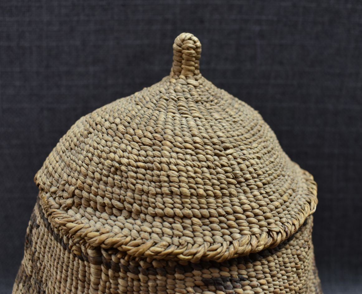 1900's Klamath. Hand woven design lidded basket. 10'' x 7''