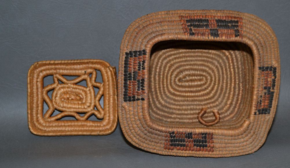 1920's hand woven container with lid has damage to loop and polychrome cross design on sides 4.5" x 7.5" x 6.5"