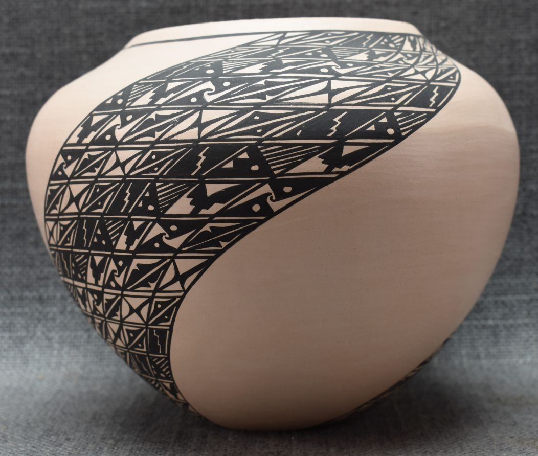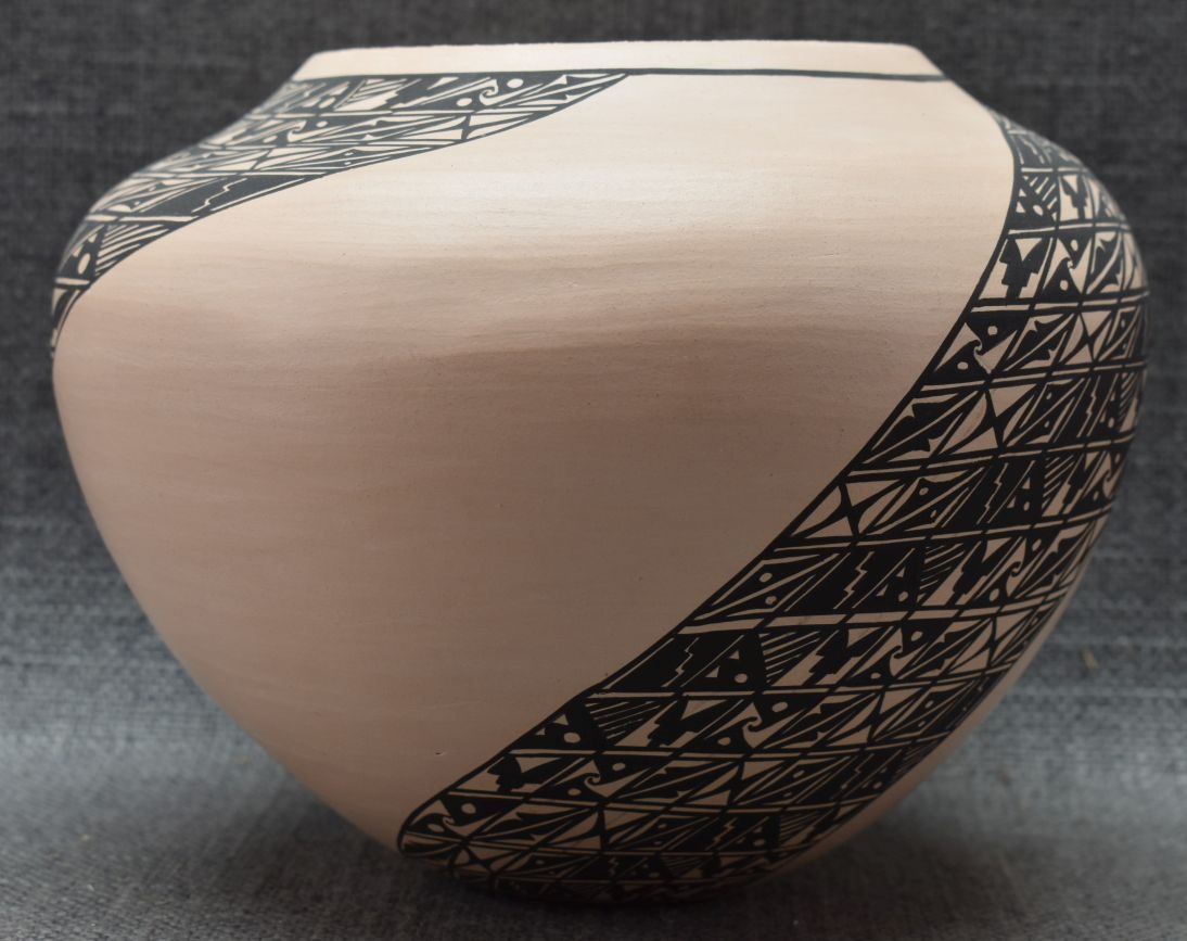 2000's Laguna Acoma Indian. Hand coiled and painted design pottery jar. Signed Galleria Tamaya. 5'' x 7''