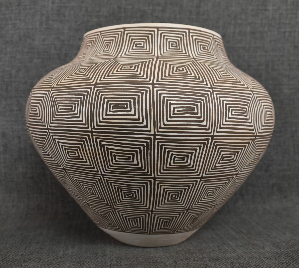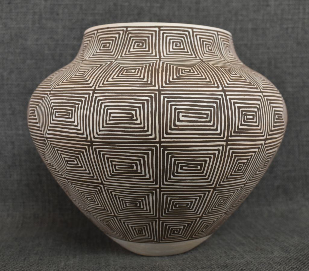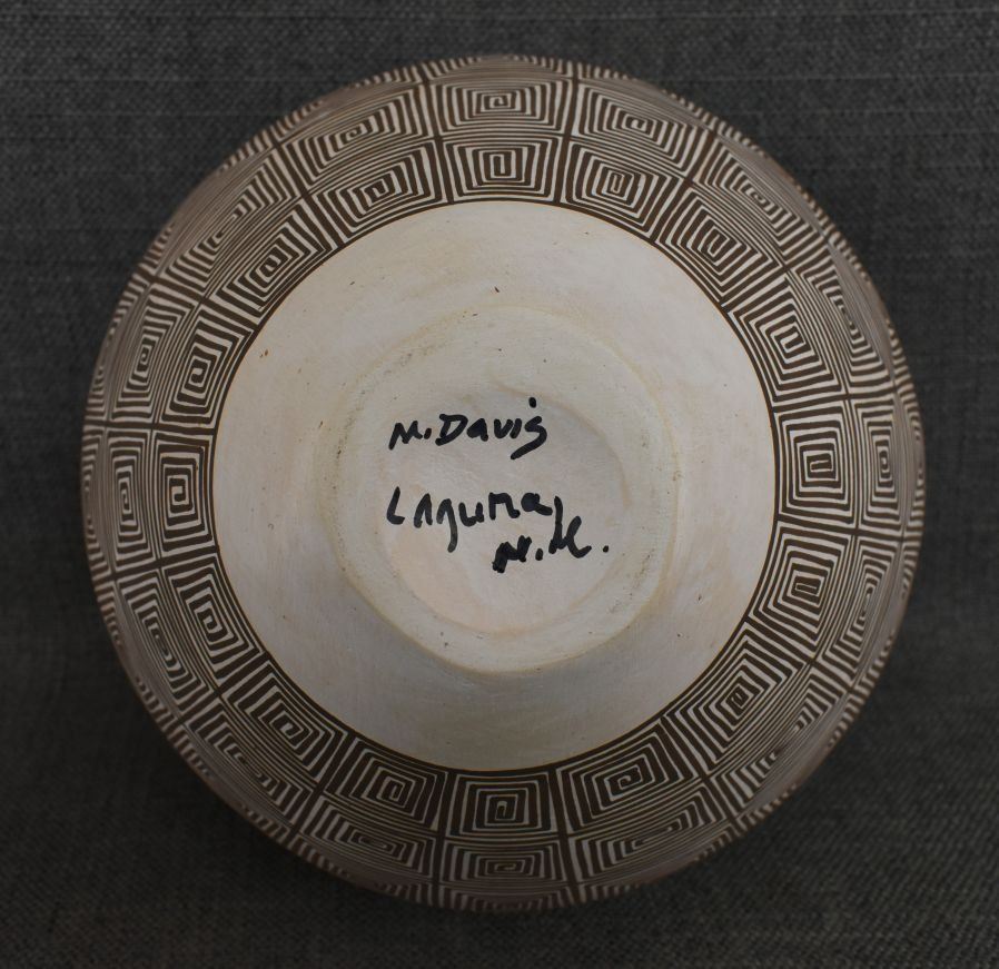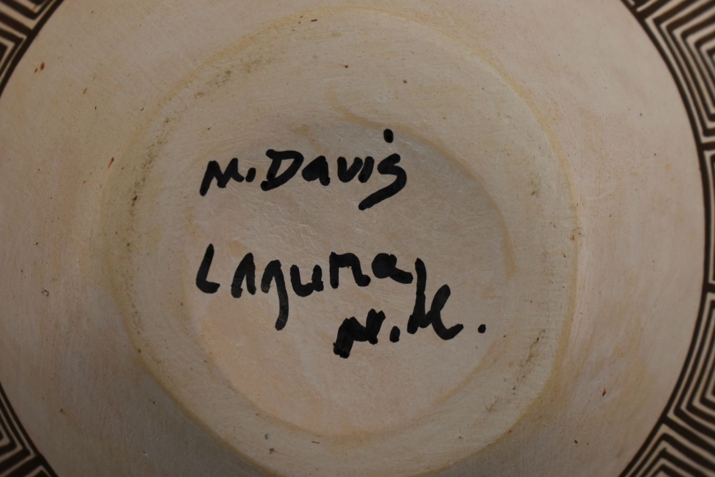1980's Laguna. Hand coiled and painted fine line design pottery jar. Signed M. Davis. 7'' x 8.5''