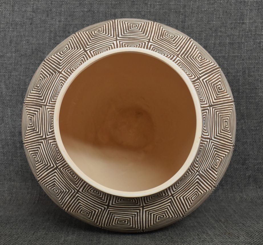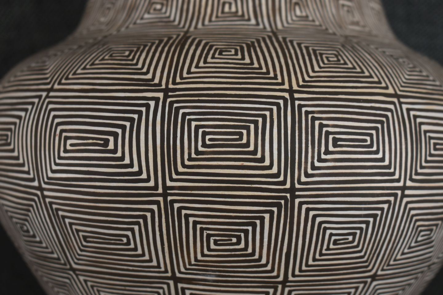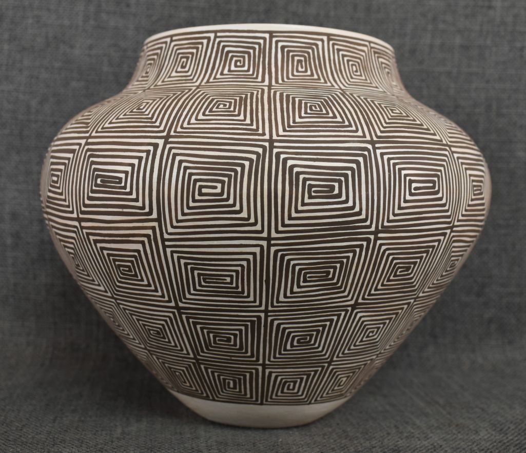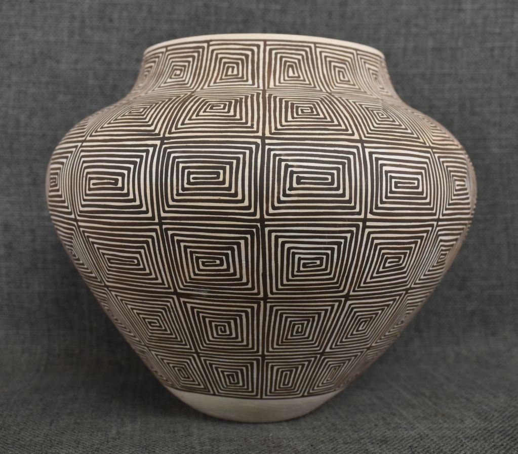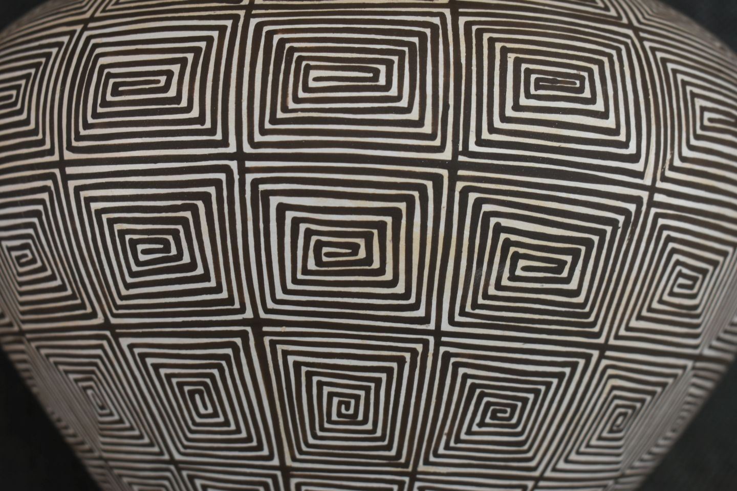 1980's Laguna. Hand coiled and painted fine line design pottery jar. Signed M. Davis. 7'' x 8.5''