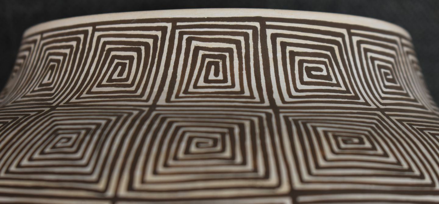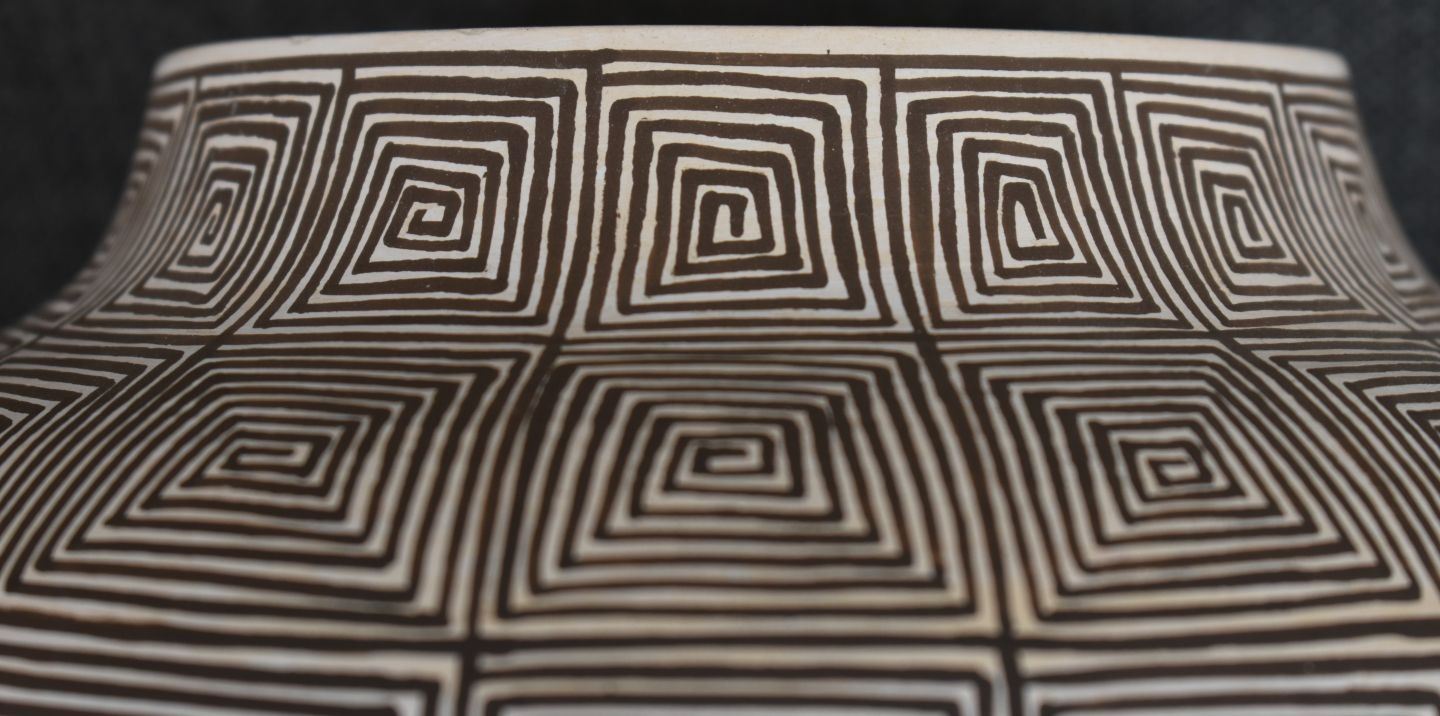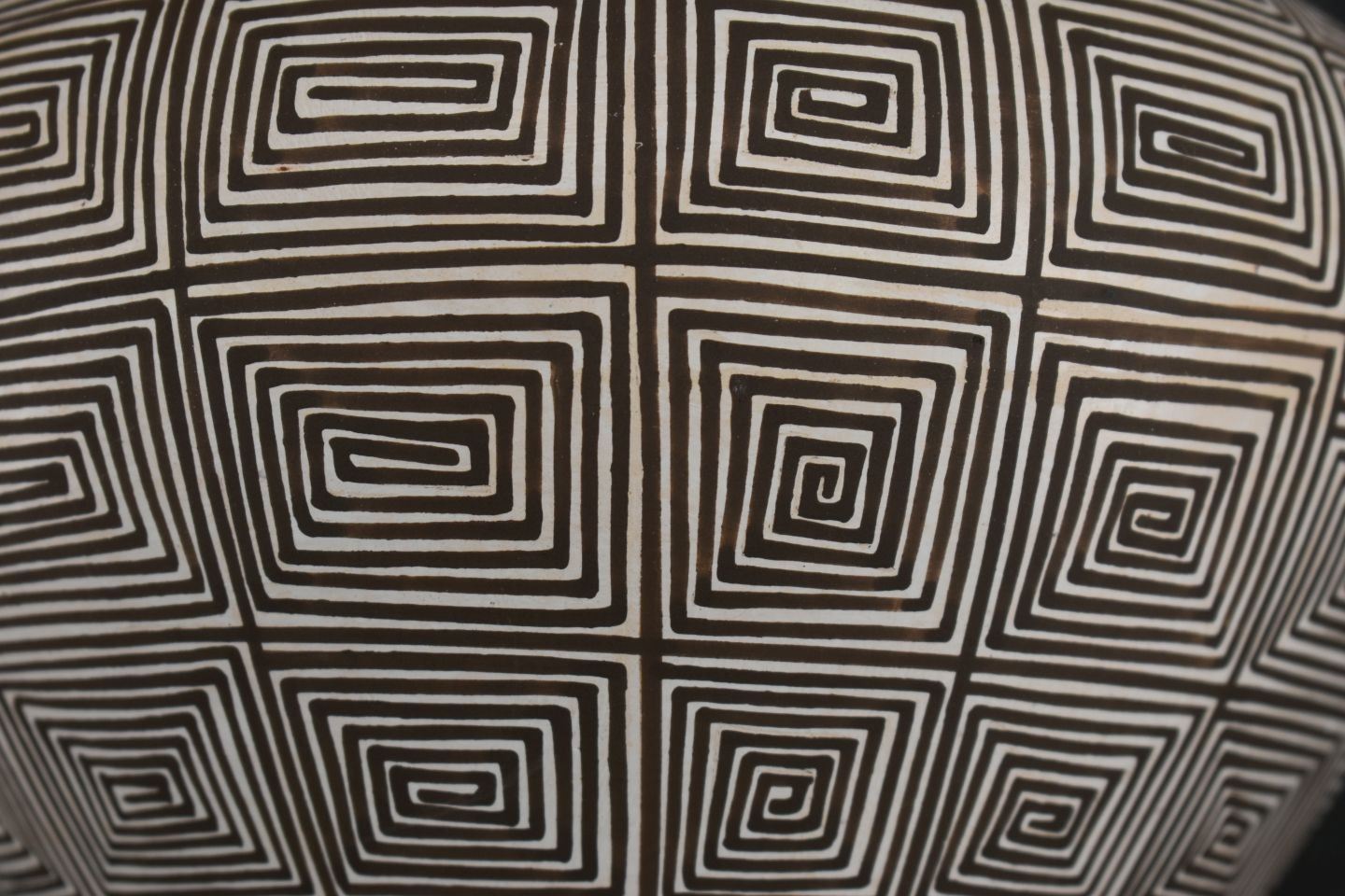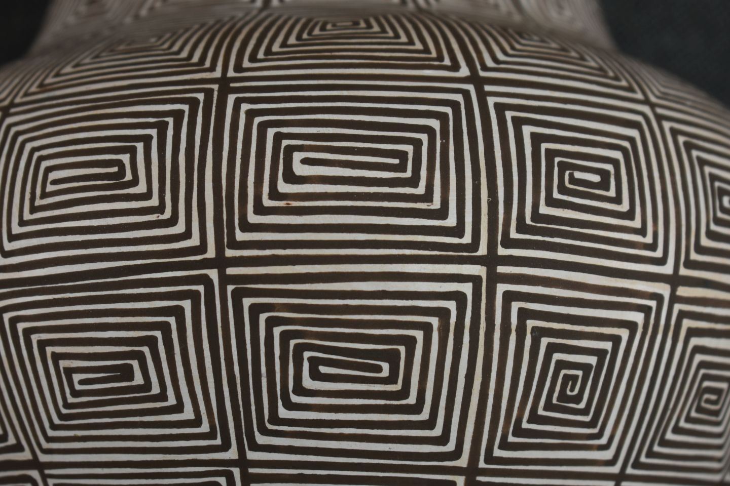 1980's Laguna. Hand coiled and painted fine line design pottery jar. Signed M. Davis. 7'' x 8.5''
