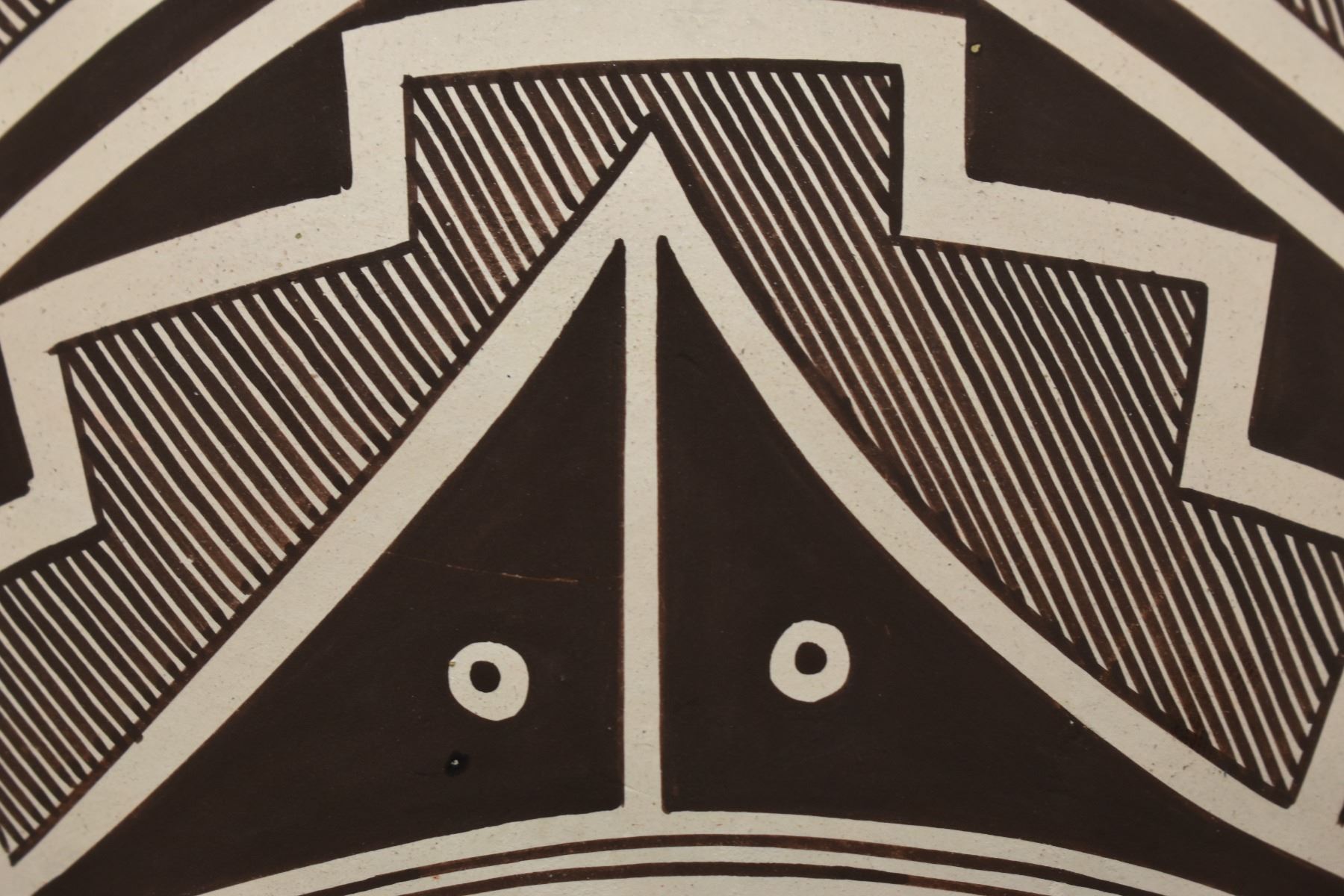 1980s 90s Laguna. Hand coiled busy hand painted black on white design signed Myron Sarracino. 10'' x 10''