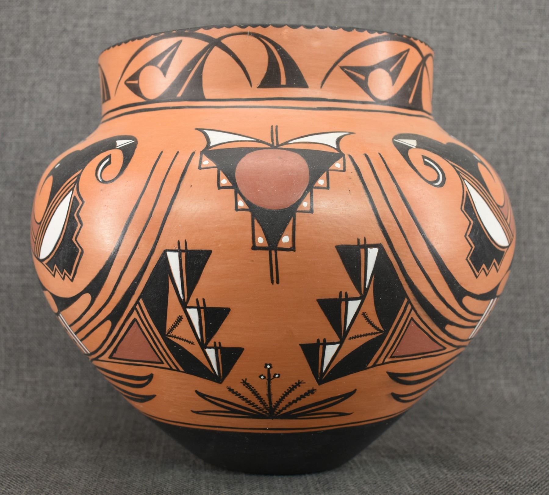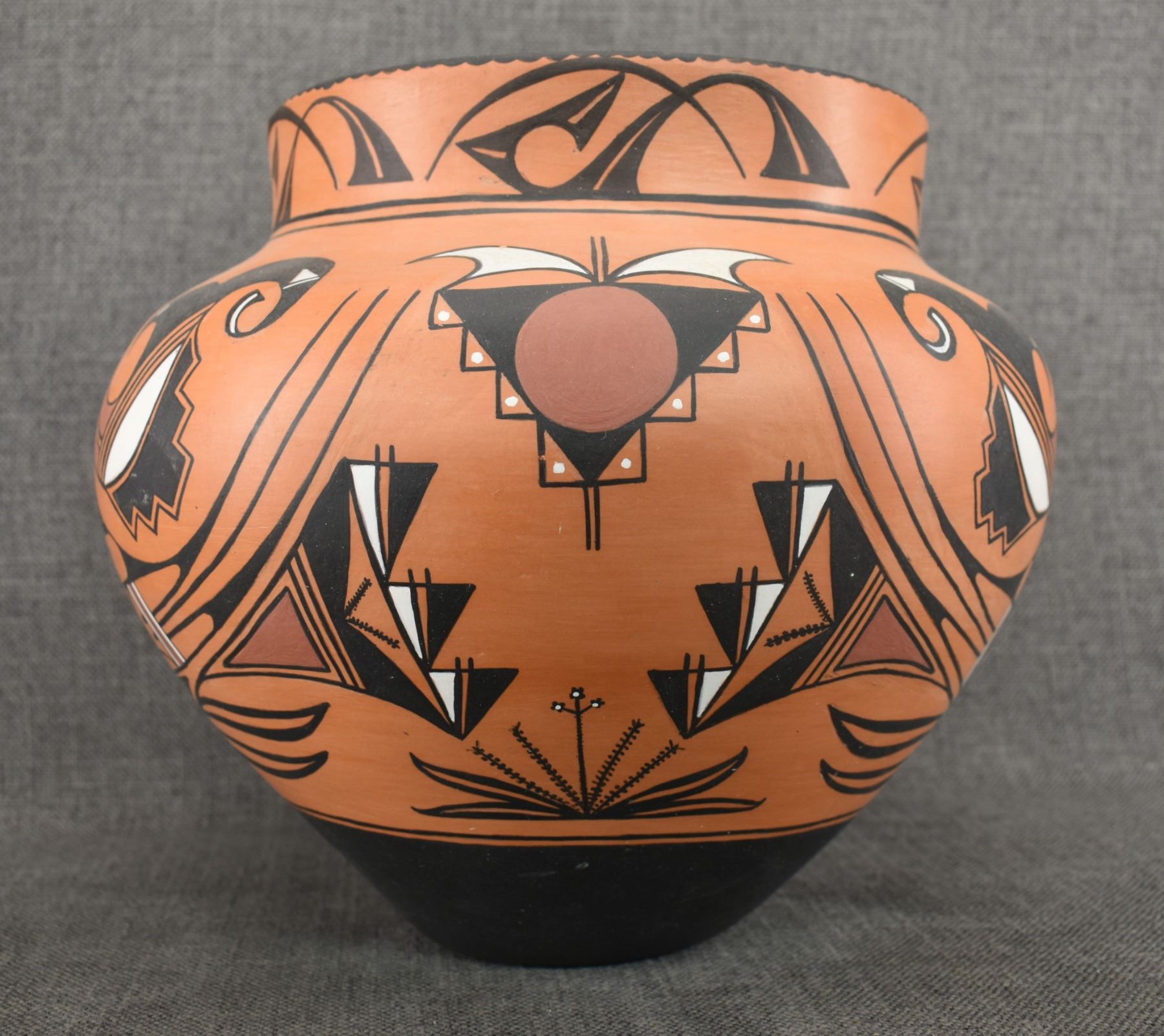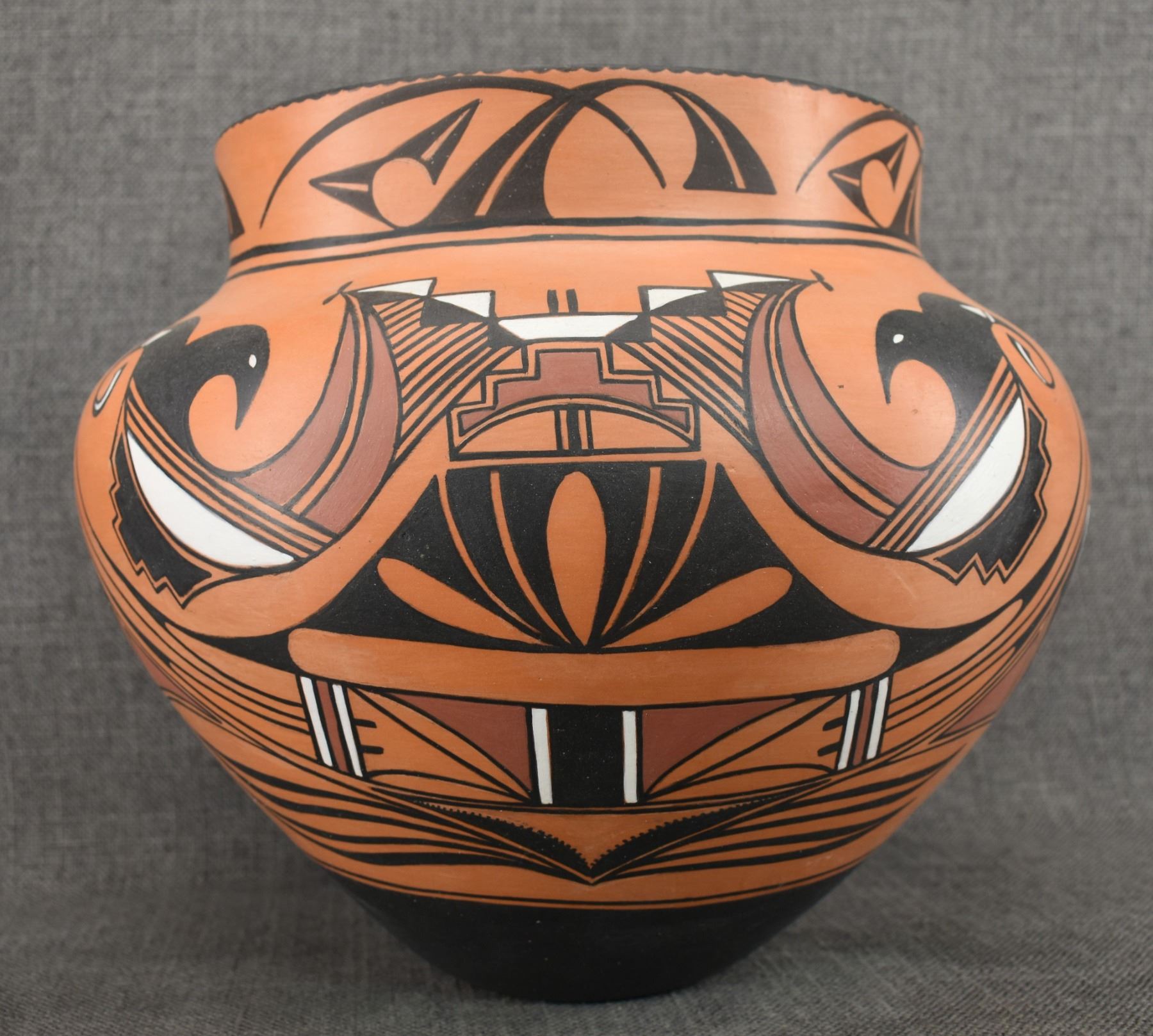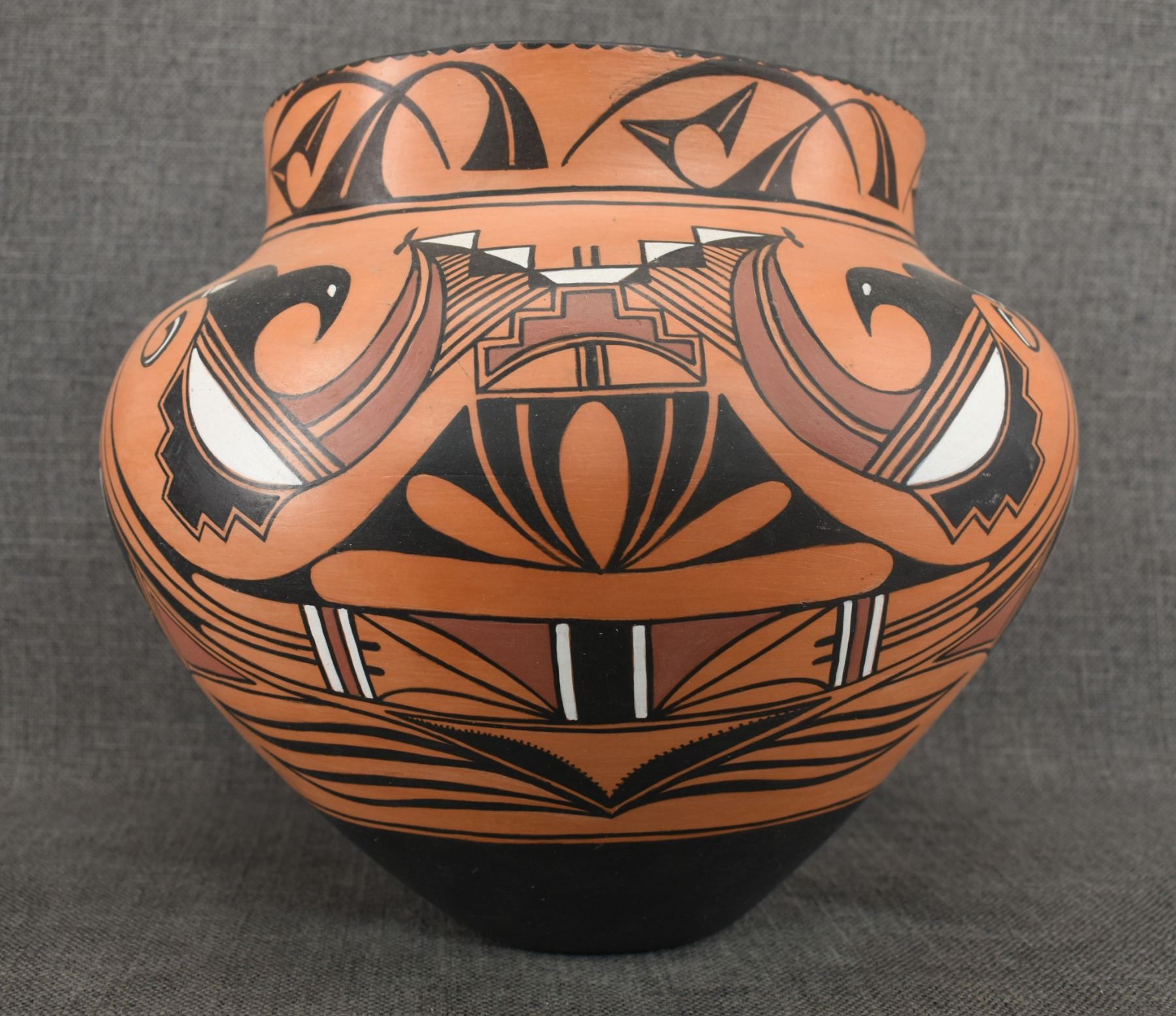 1990-2000's Laguna, hand coiled with polychrome painted design by Vincent Lewis Jr. 10.25" x 11.5"