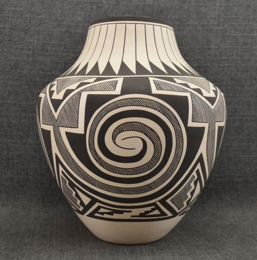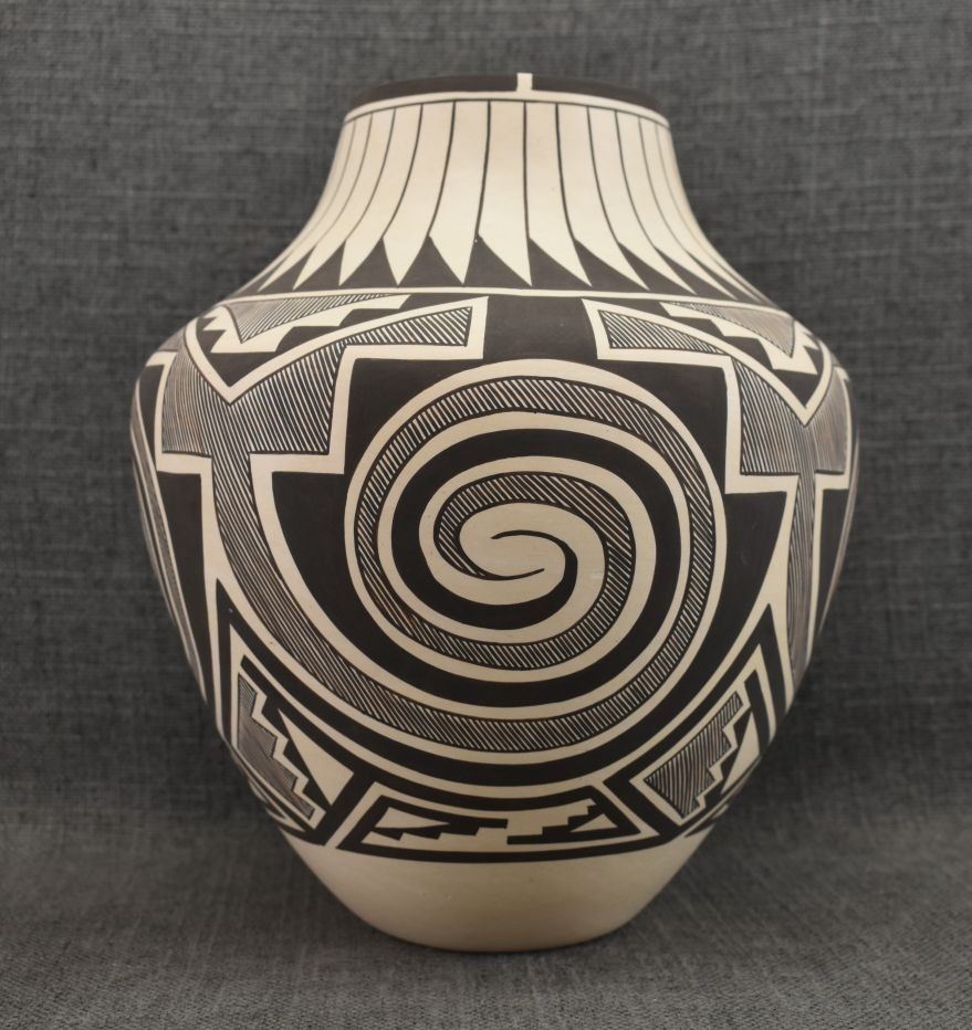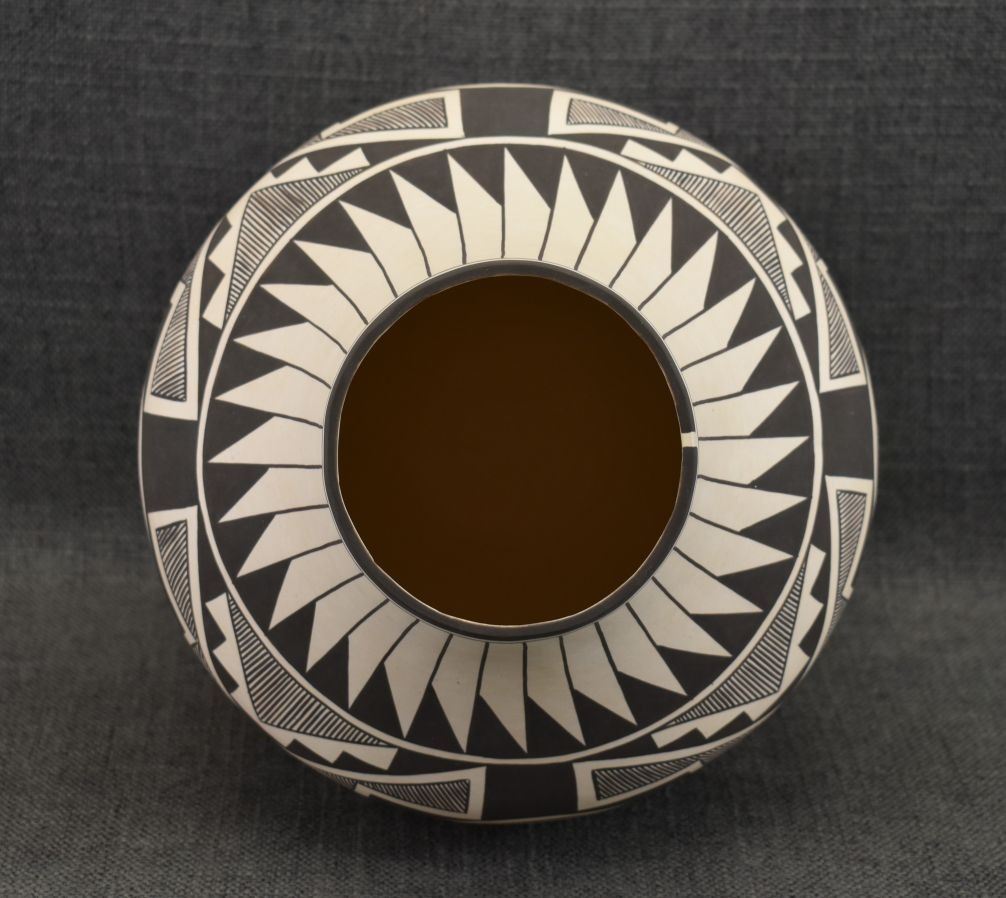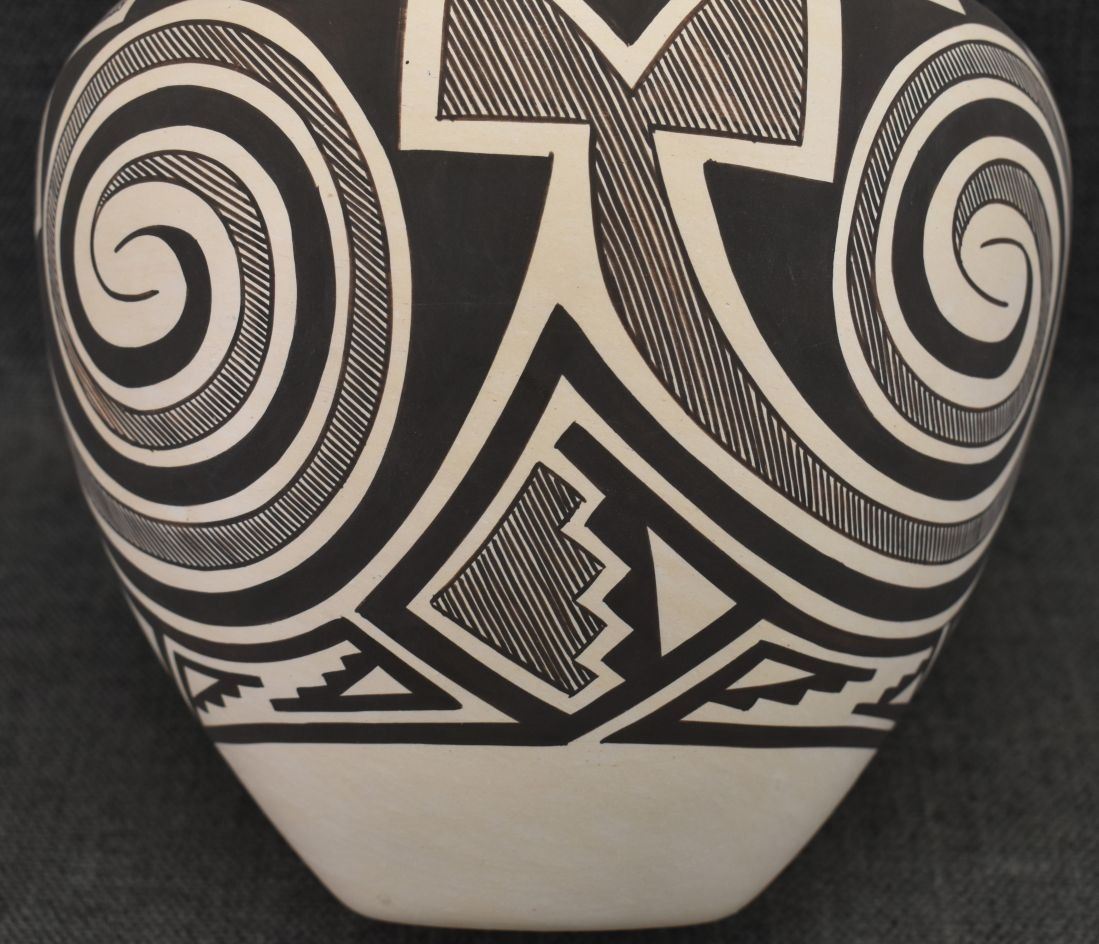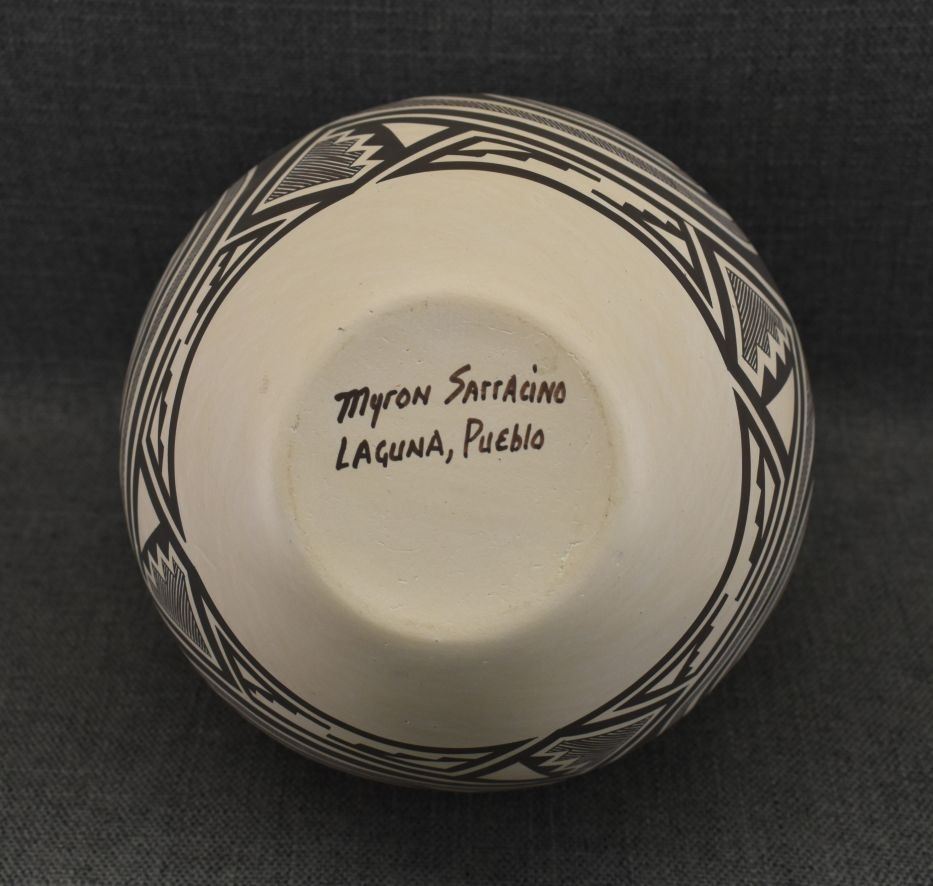 1990-2000's Laguna, hand coiled with black on white Anasazi/Tularosa geometric design by Myron Sarracino 10" x 8"