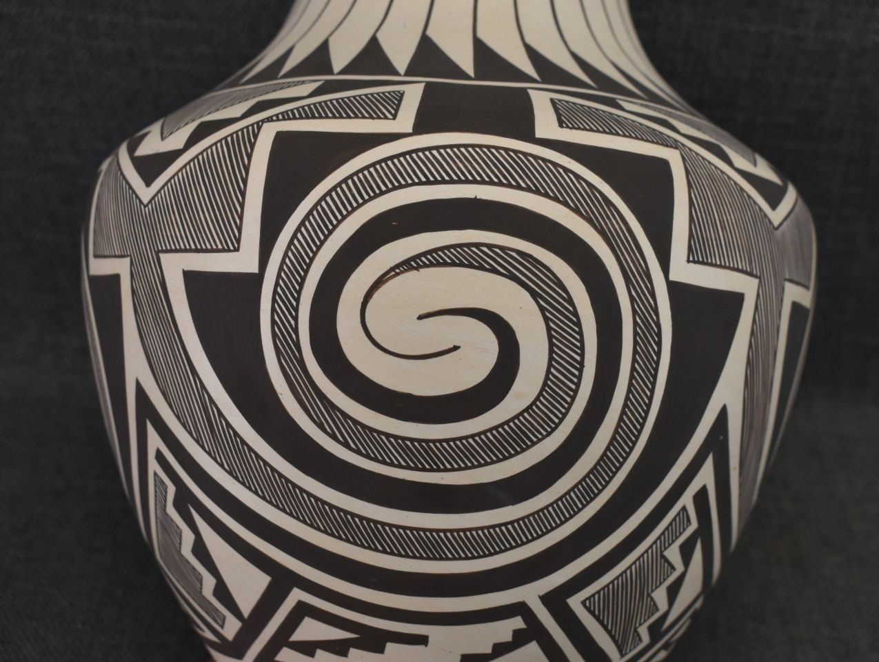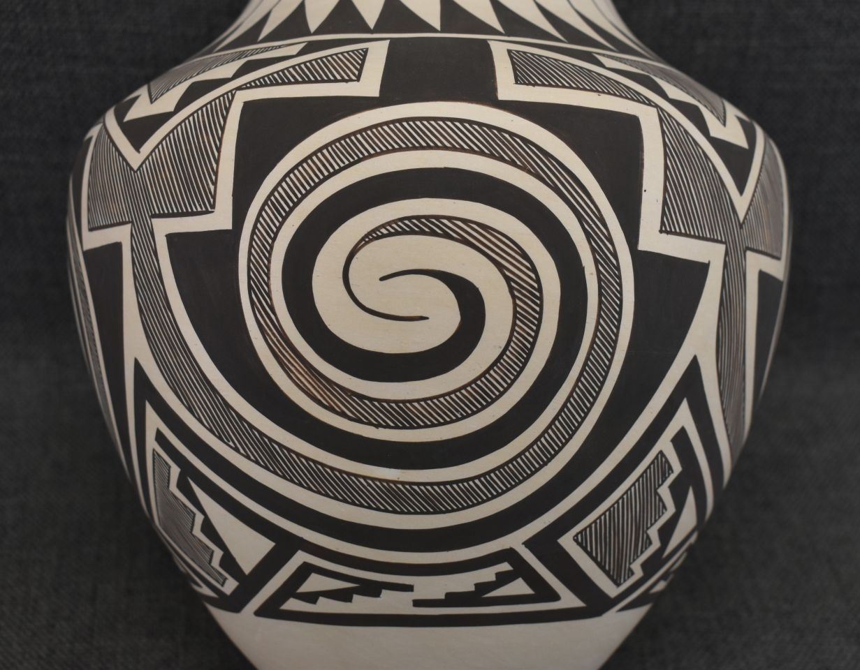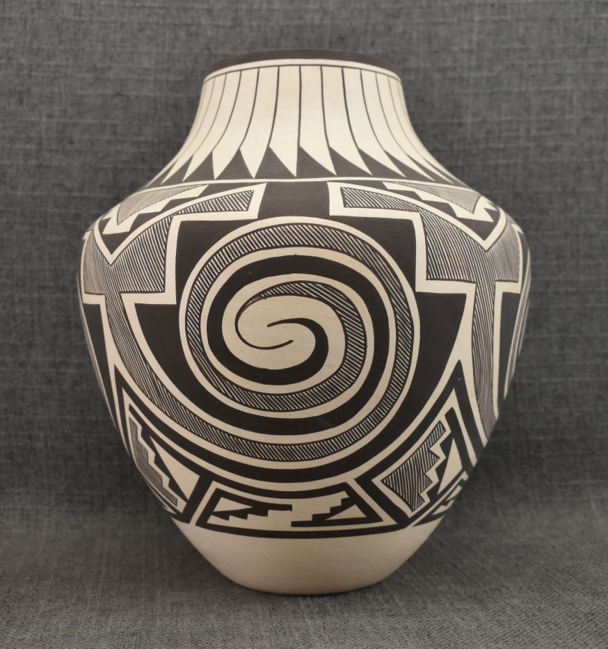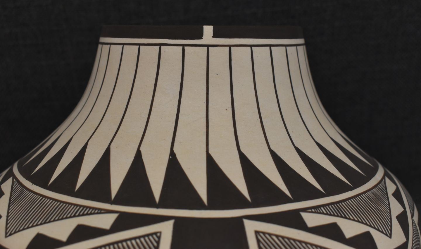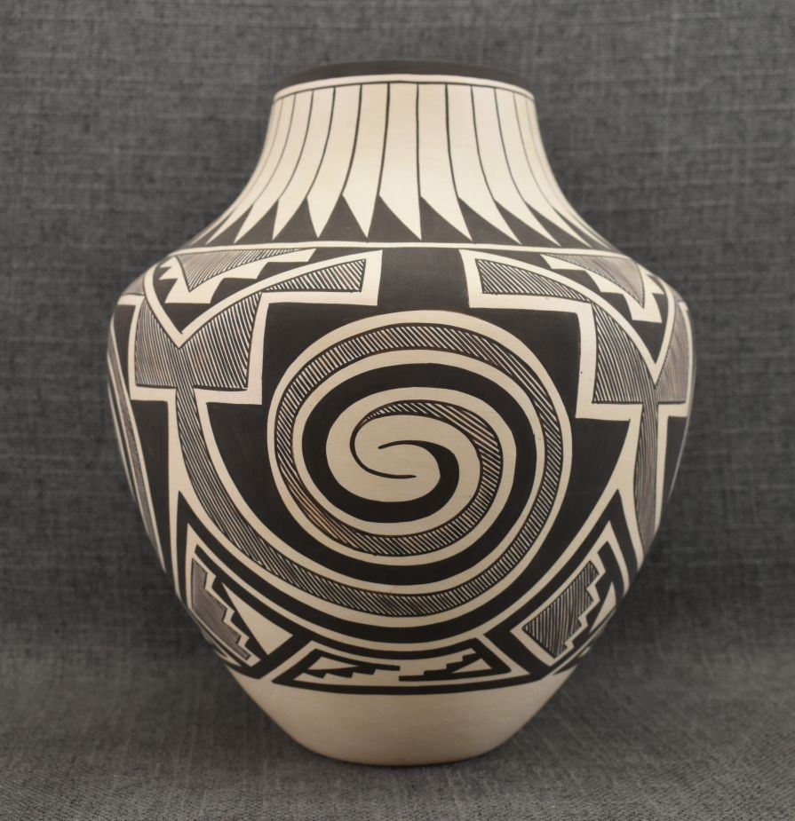 1990-2000's Laguna, hand coiled with black on white Anasazi/Tularosa geometric design by Myron Sarracino 10" x 8"