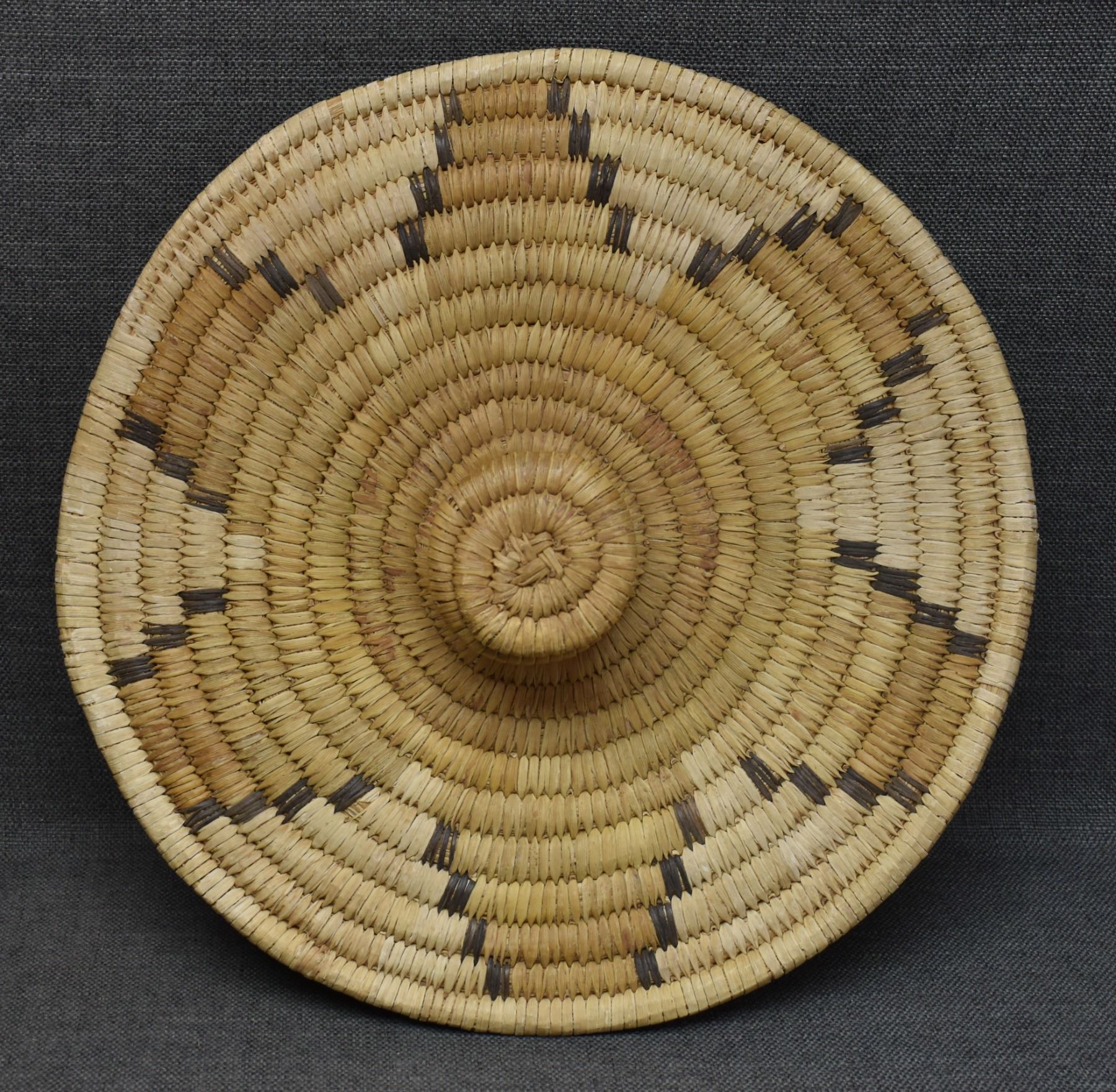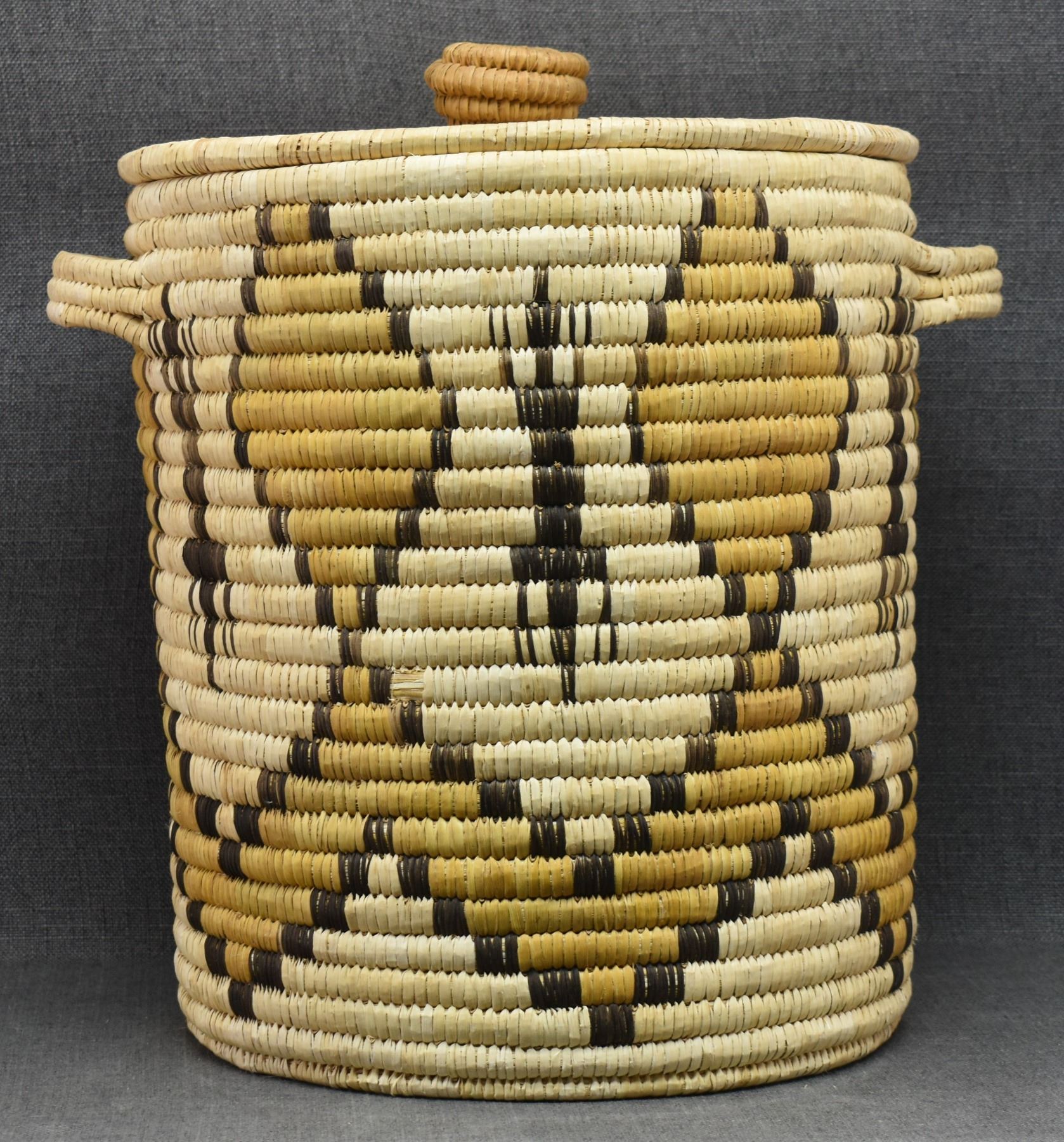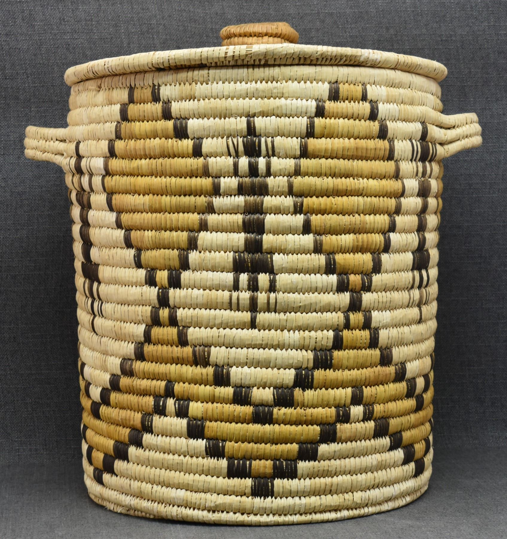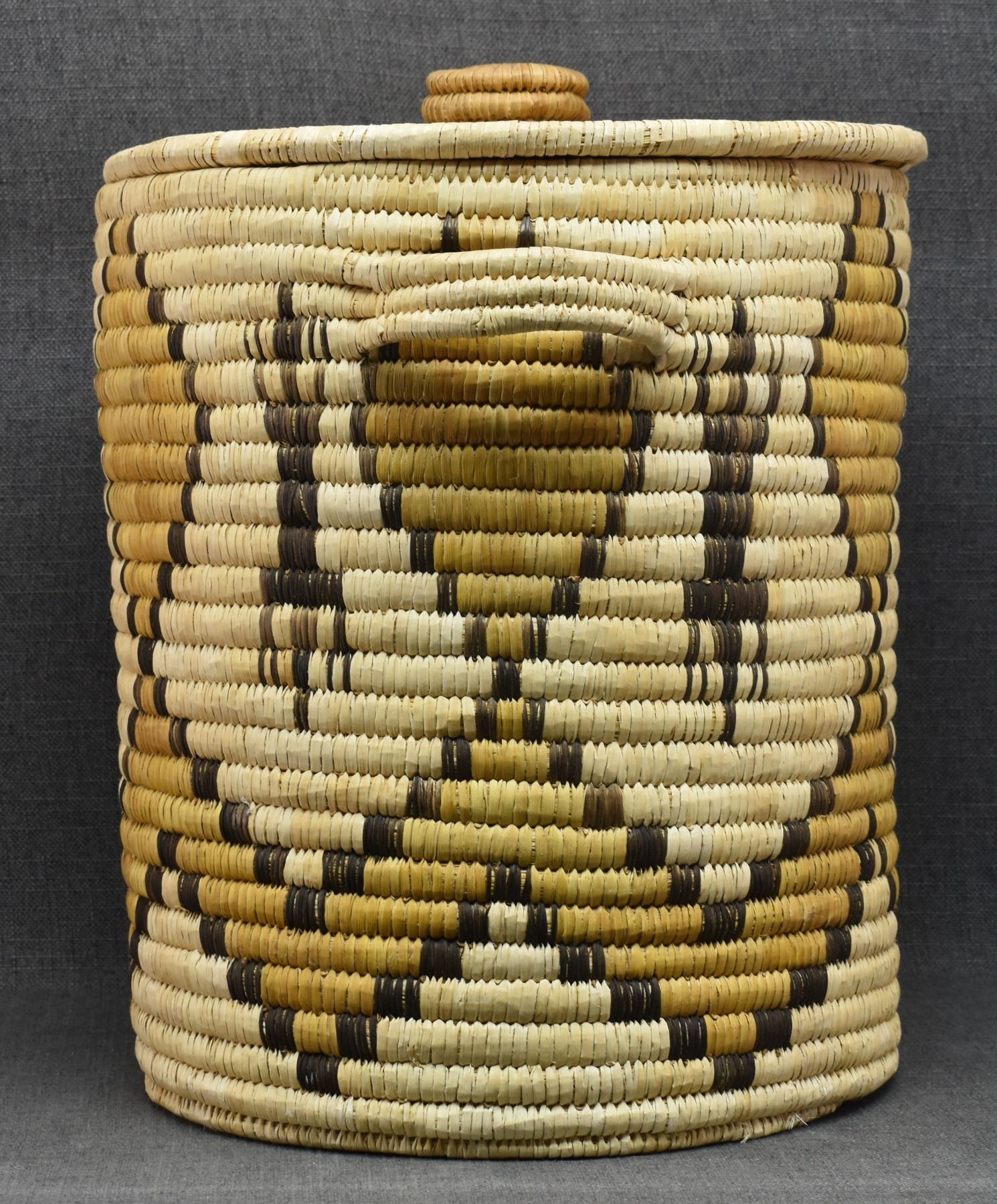 1970's Papago. Hand woven geometric and Gila Monster design lidded basket. 19'' x 18''
