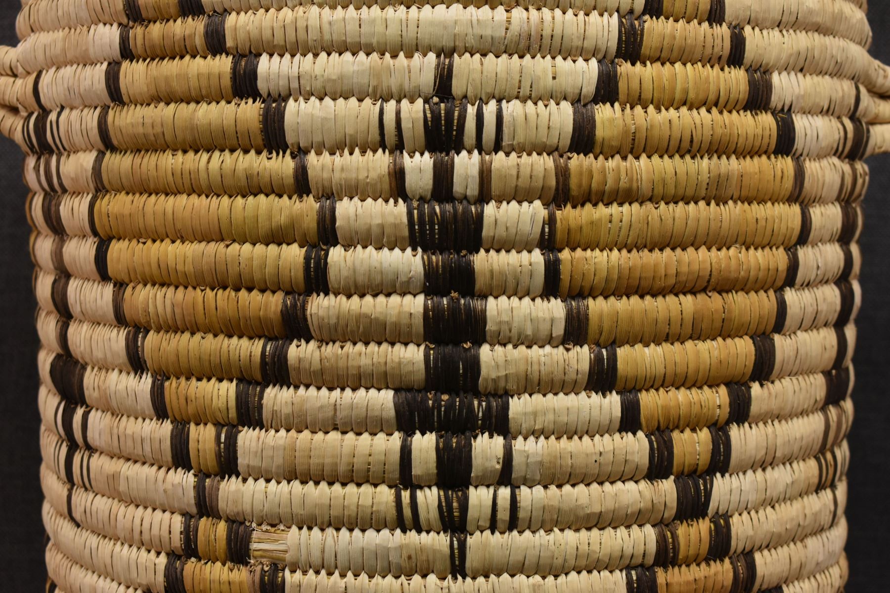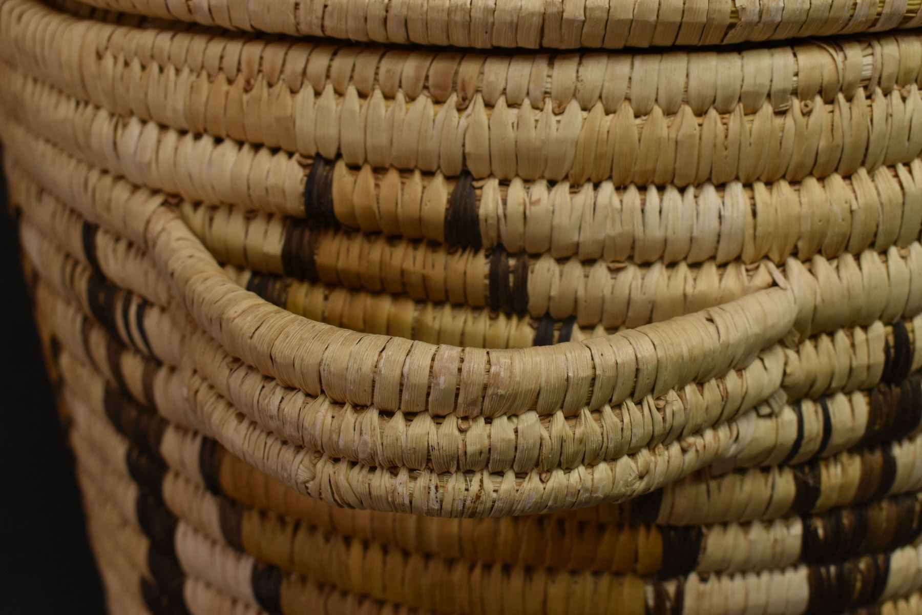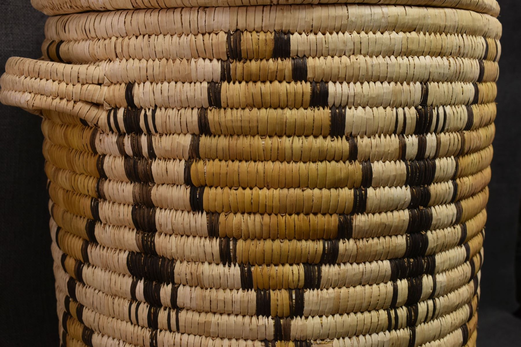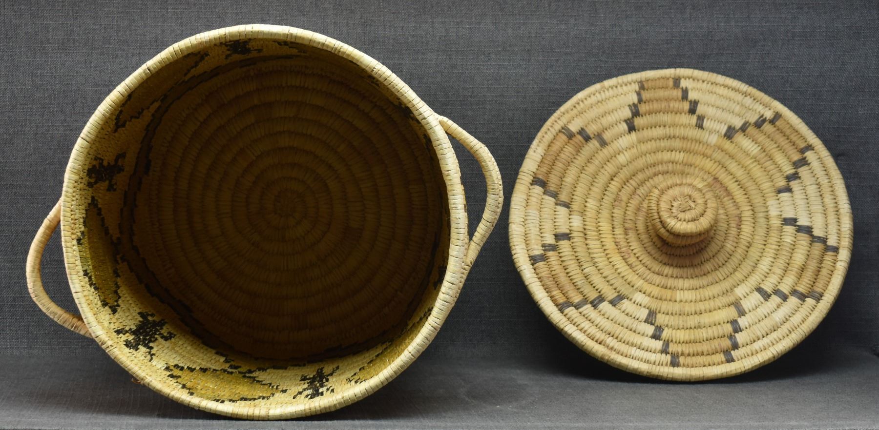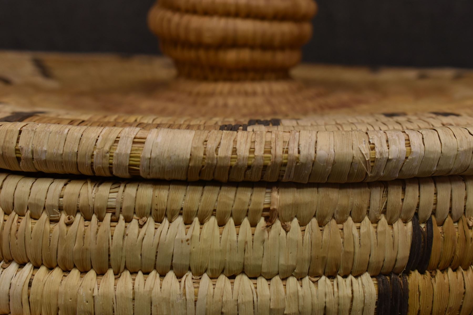 1970's Papago. Hand woven geometric and Gila Monster design lidded basket. 19'' x 18''