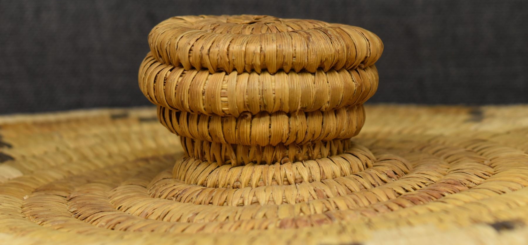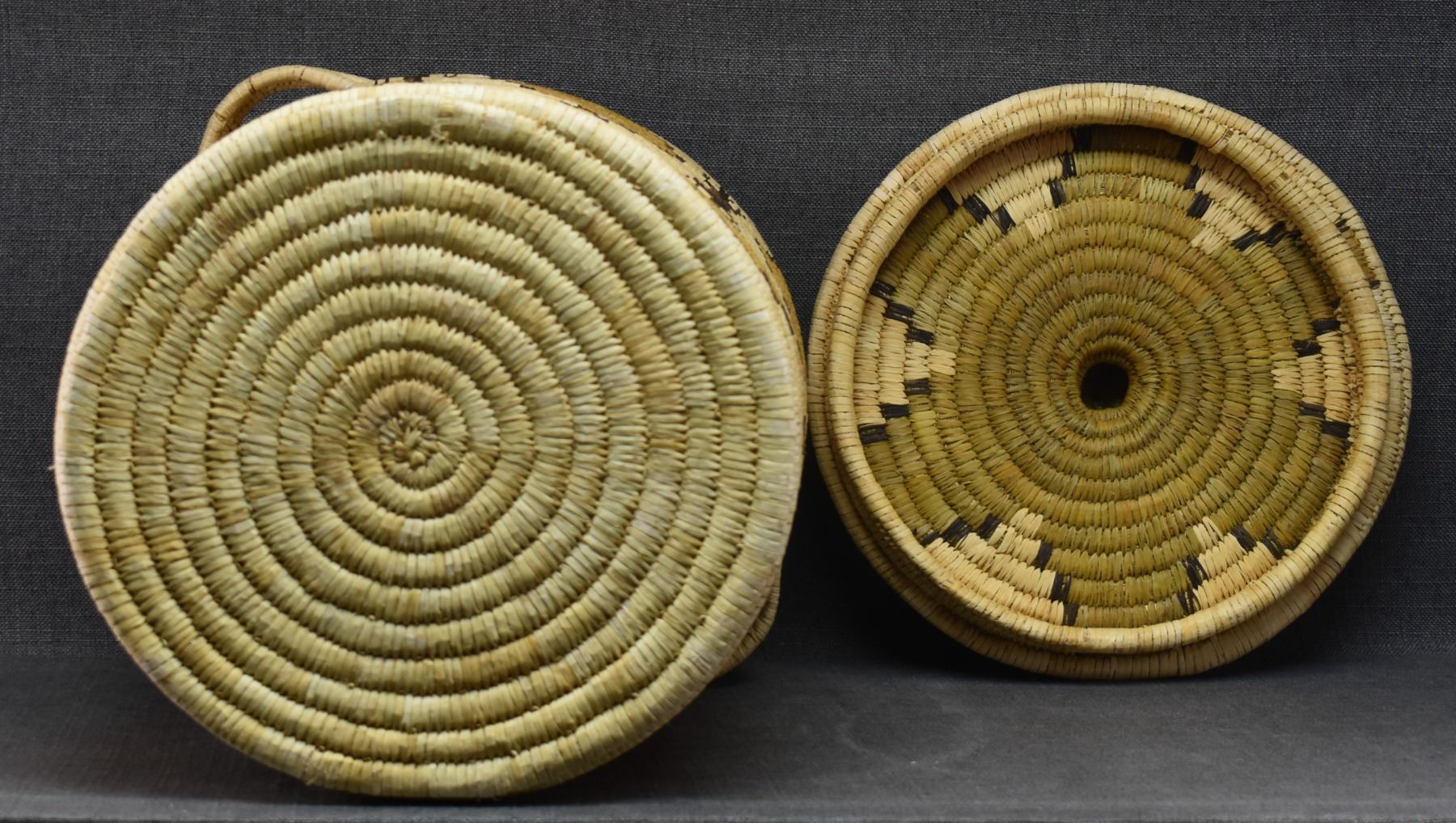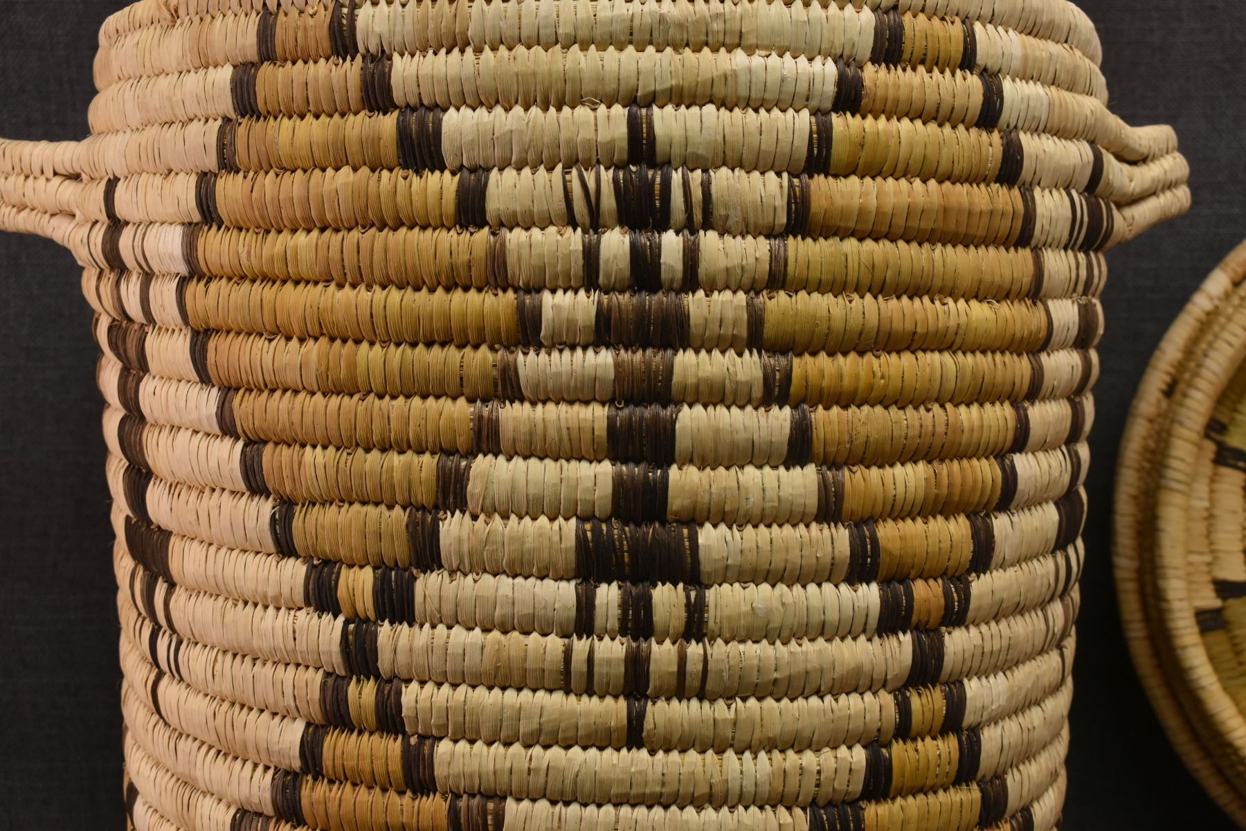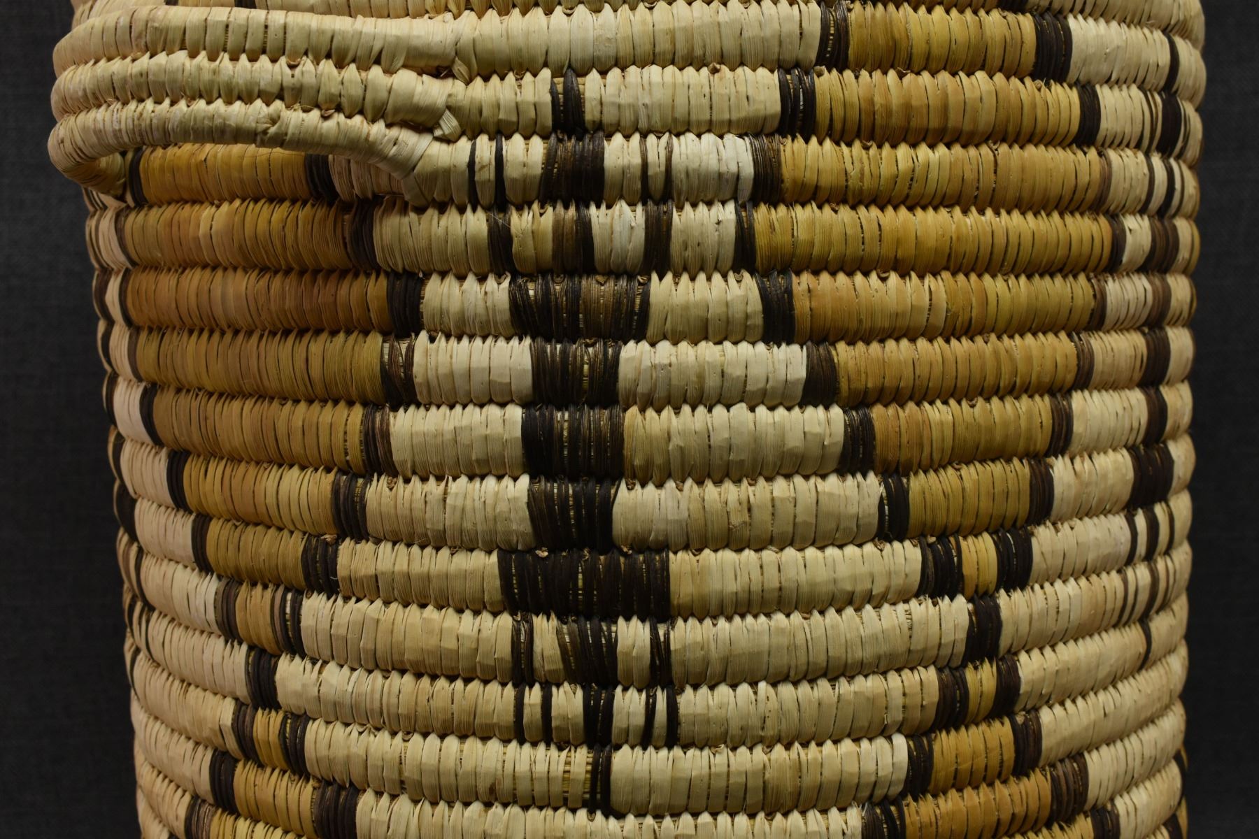 1970's Papago. Hand woven geometric and Gila Monster design lidded basket. 19'' x 18''