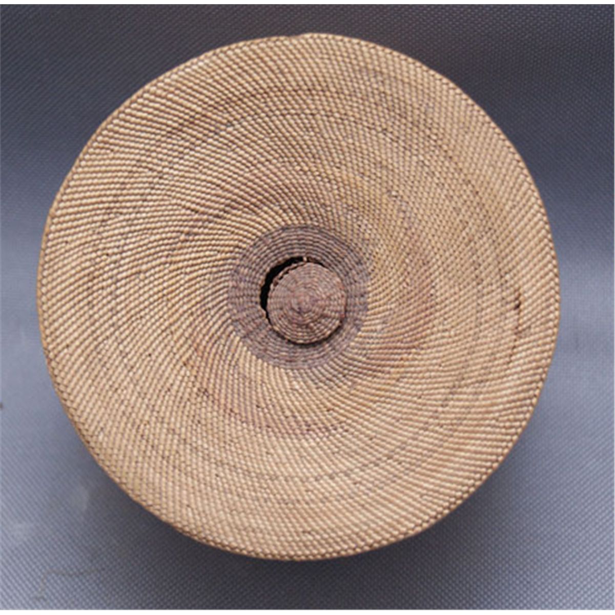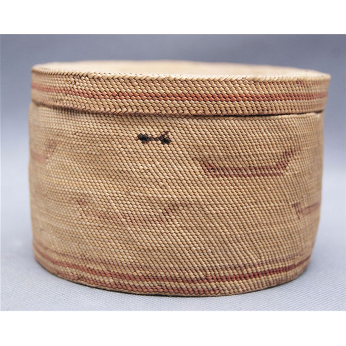 1920s 30s hand-woven design knob on lid has been broken also missing stitches and faded design. 2.75" x 4"