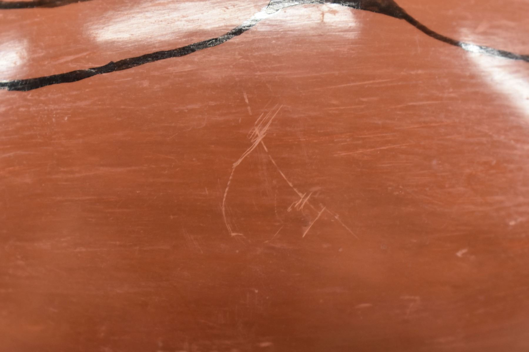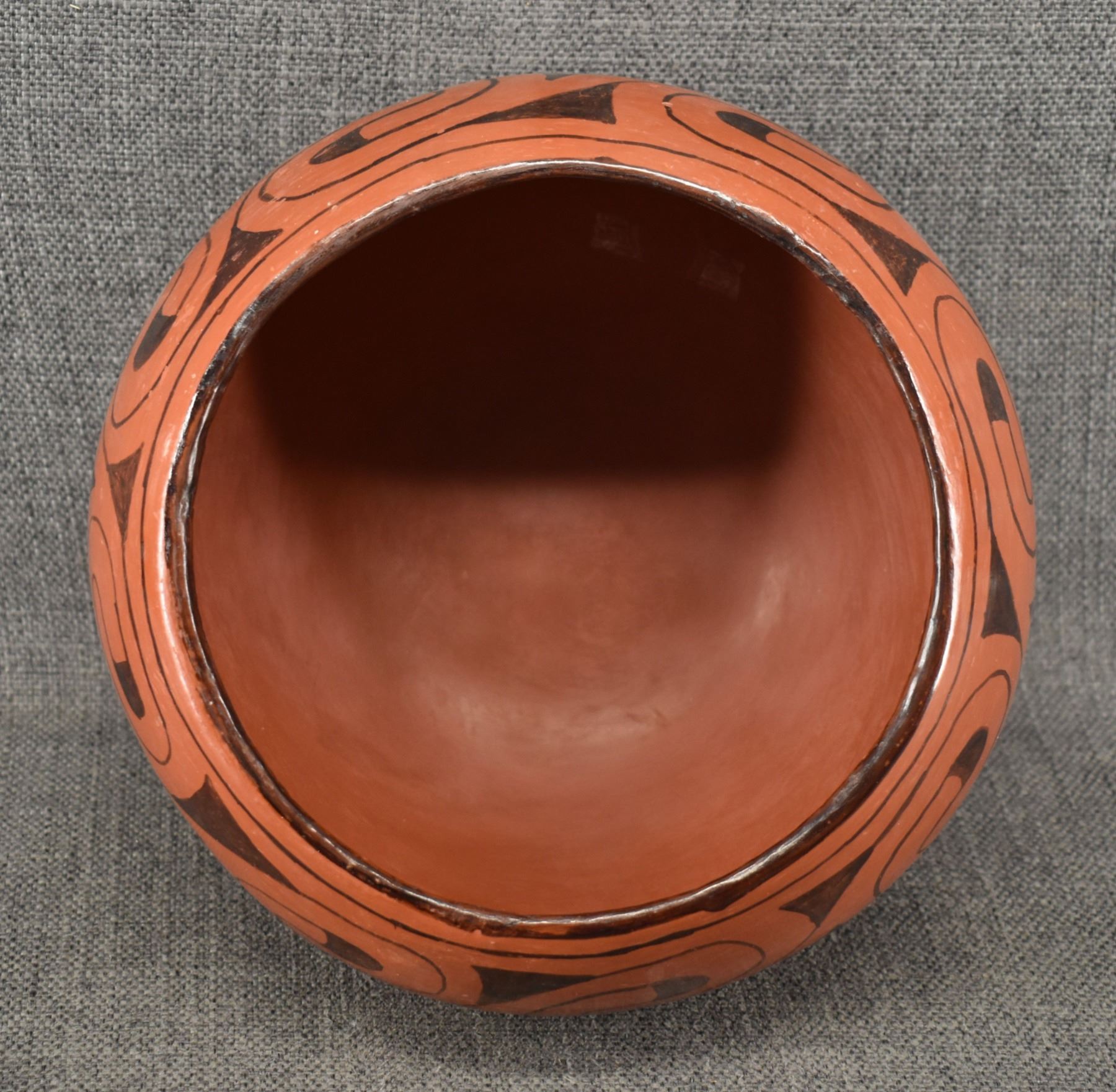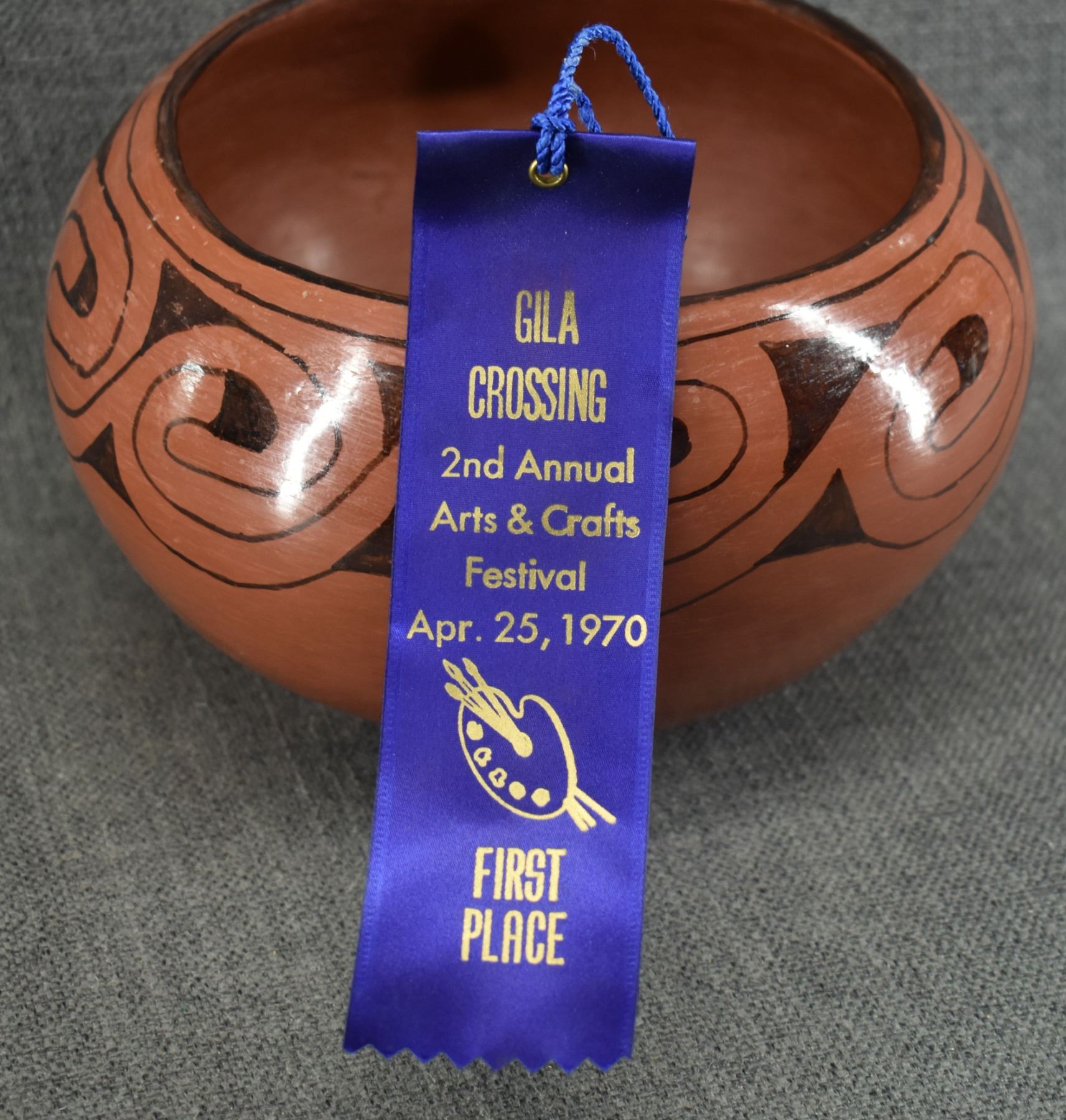 1970 Maricopa, hand coiled with painted geometric design by Anita Redbird, 5" x 9" includes ribbon from Gila Crossing 2nd annual arts and crafts.