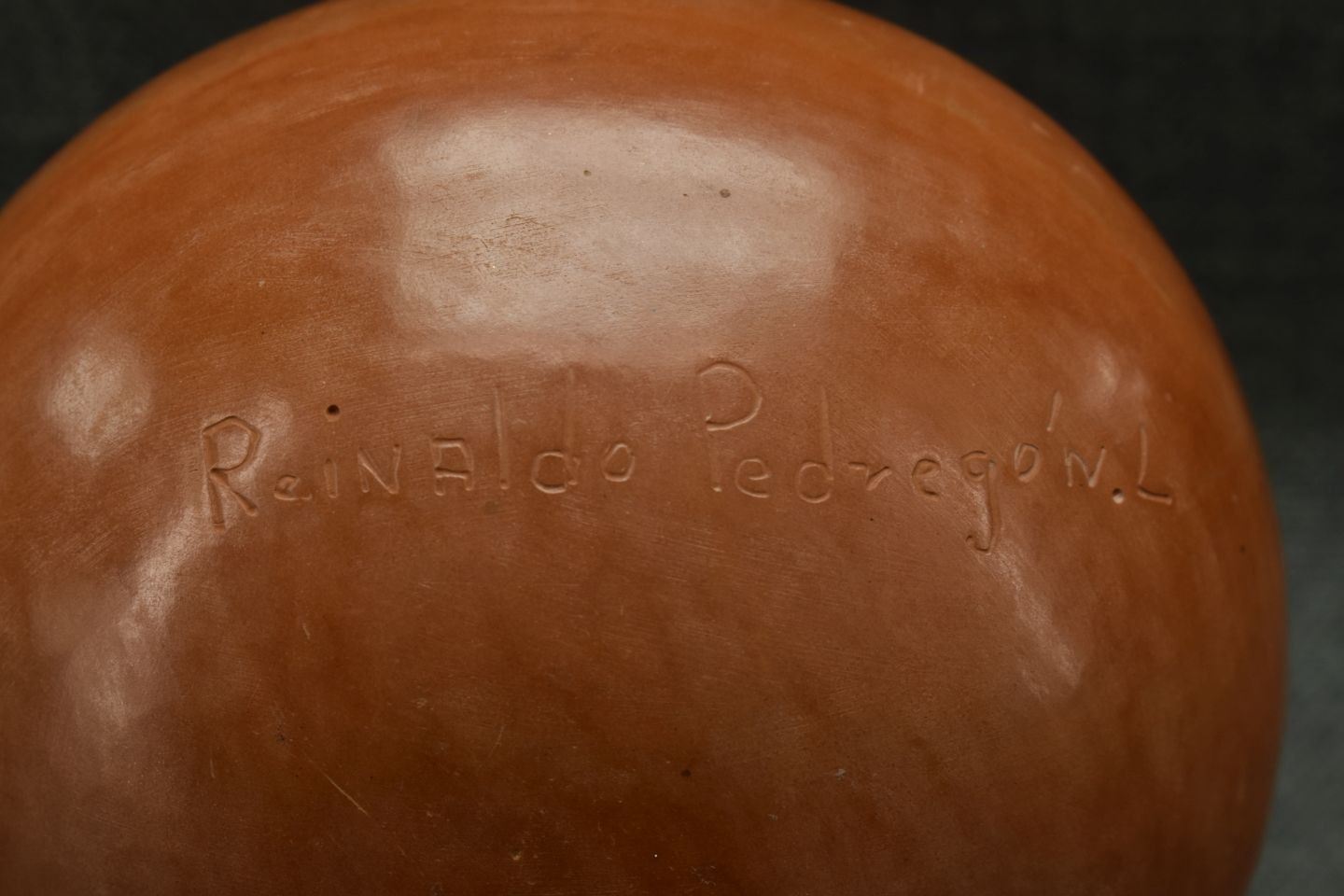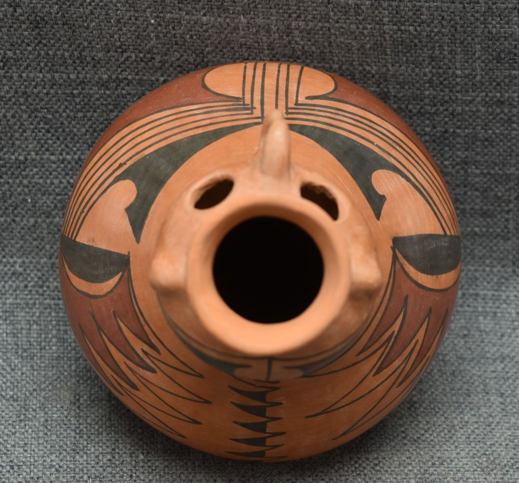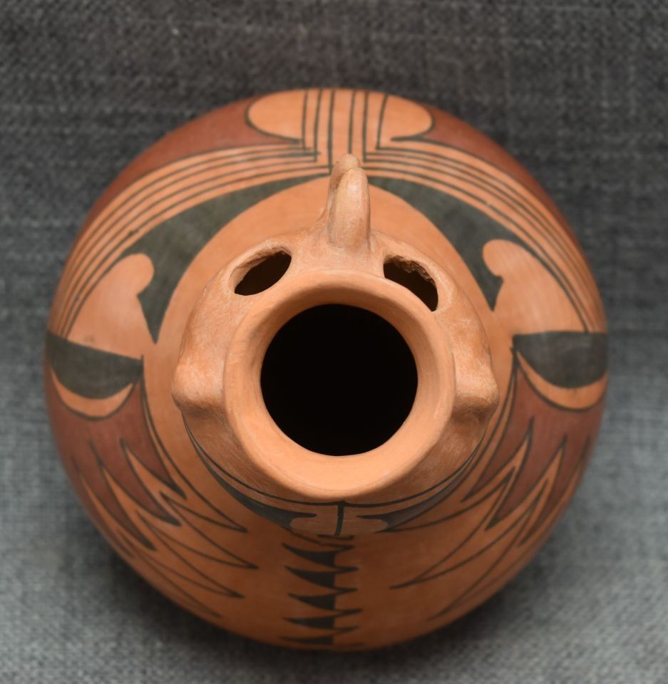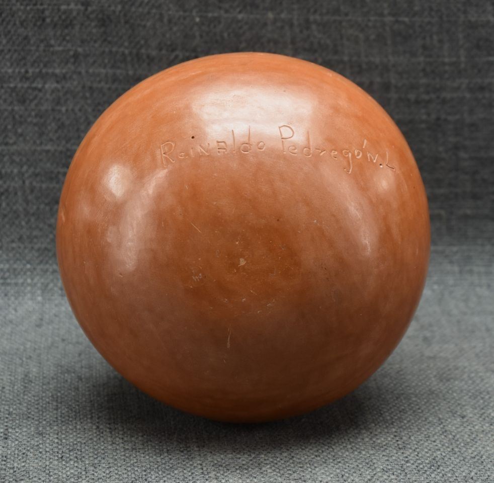 1990's Mata Ortiz, hand made with polychrome painted design signed Reinaldo Pedregon L. 6.5" x 5.5"