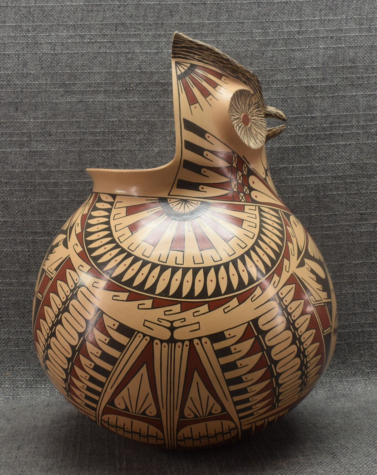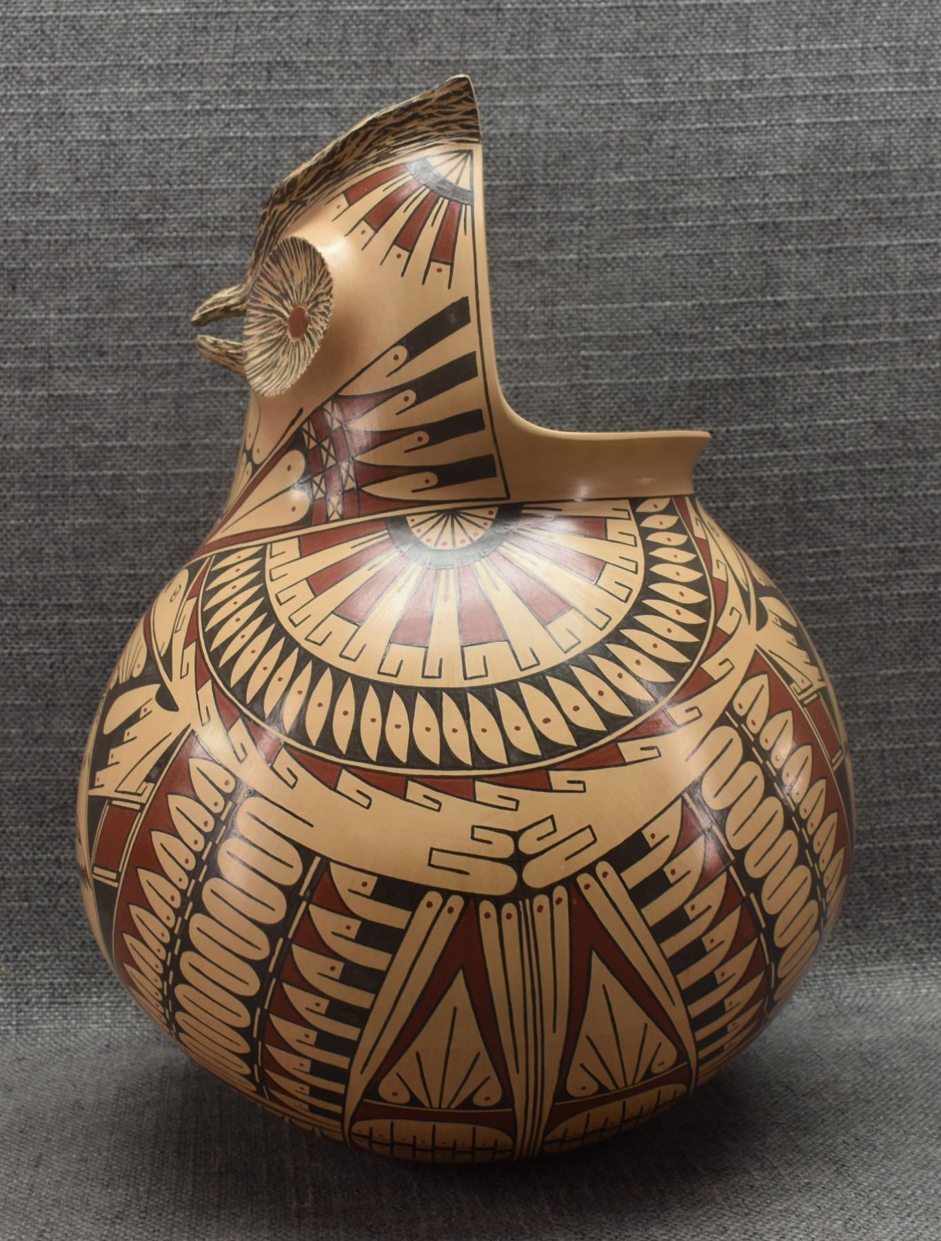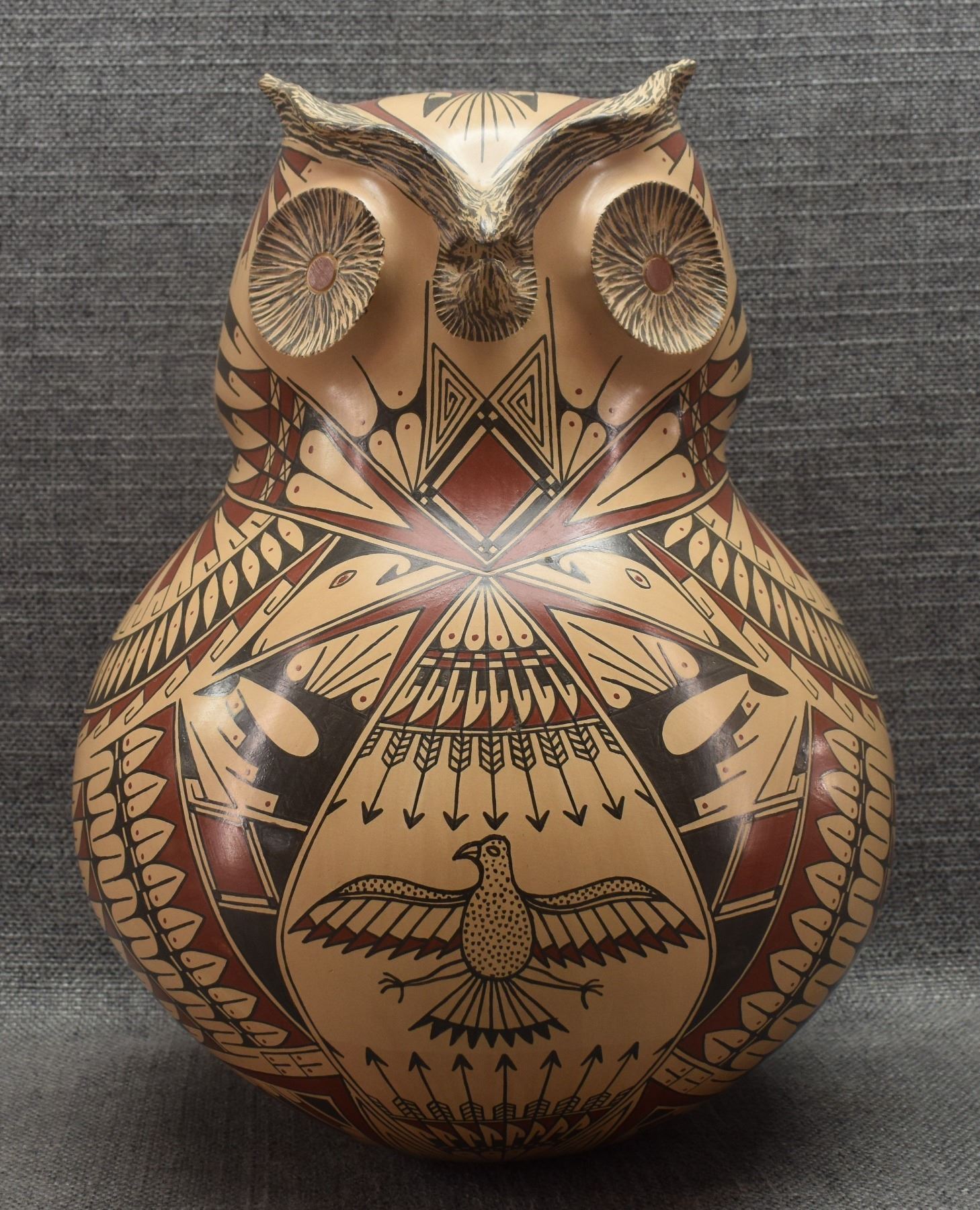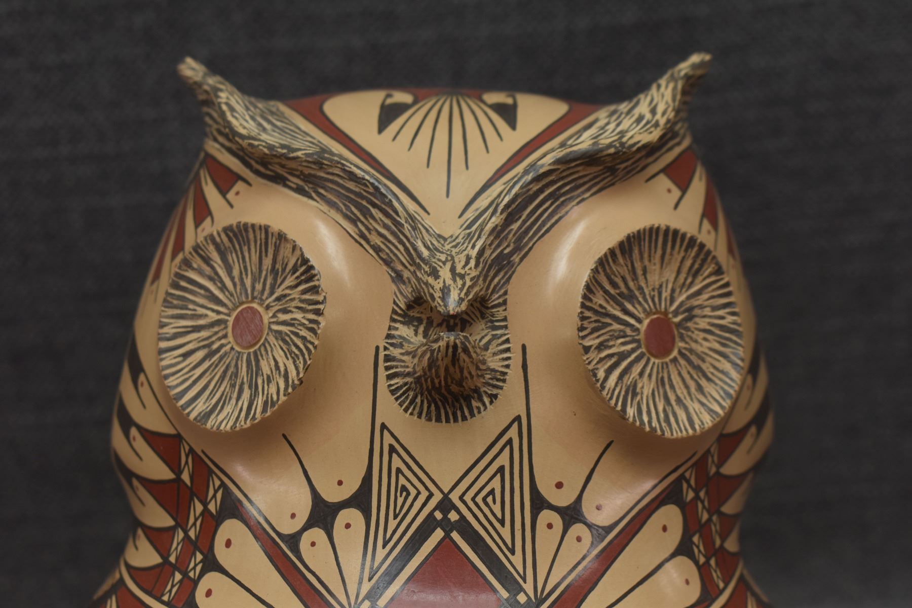 1980's Mata Ortiz hand made pottery owl with polychrome painted design 11" x 9" signed Adrian Rojas
