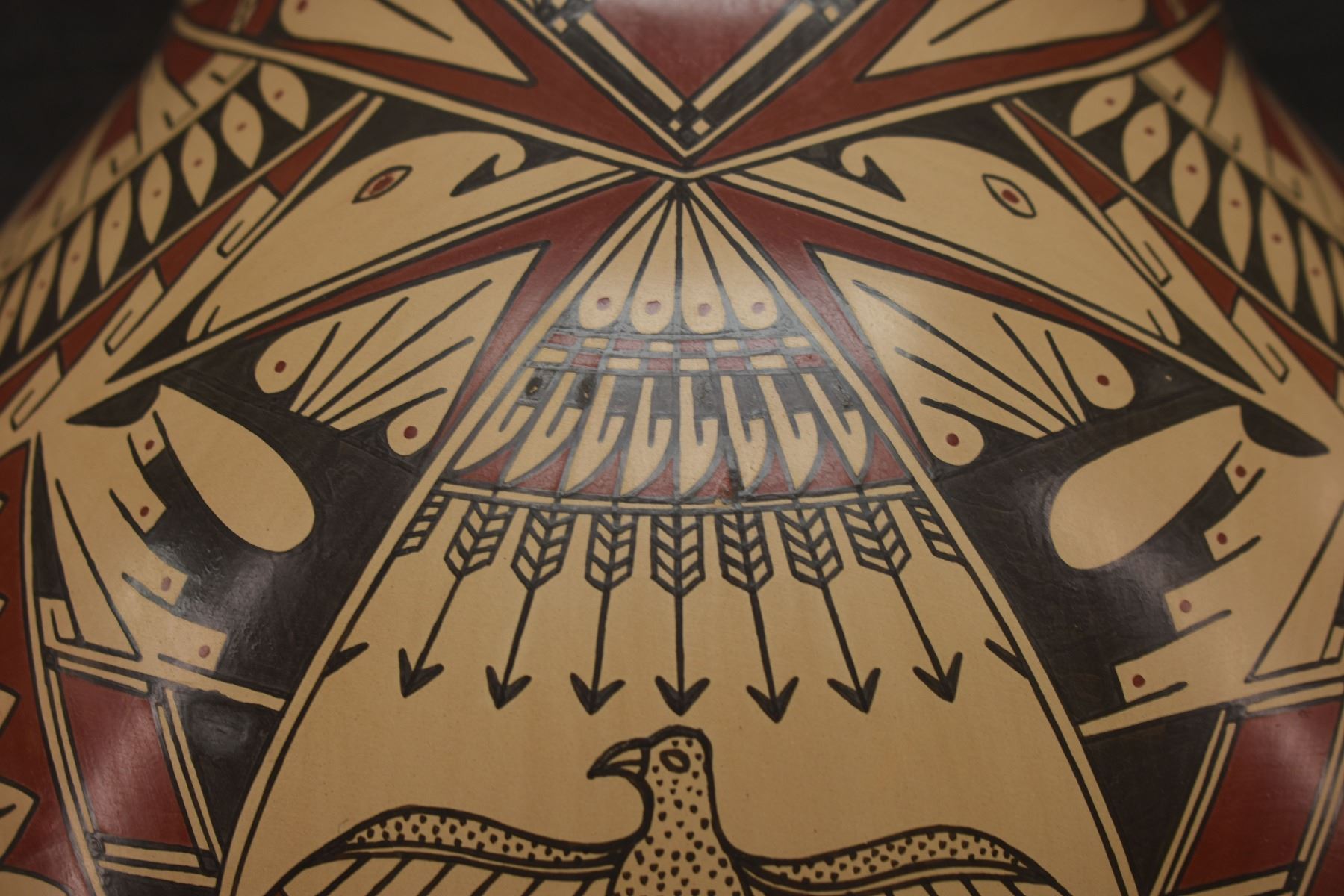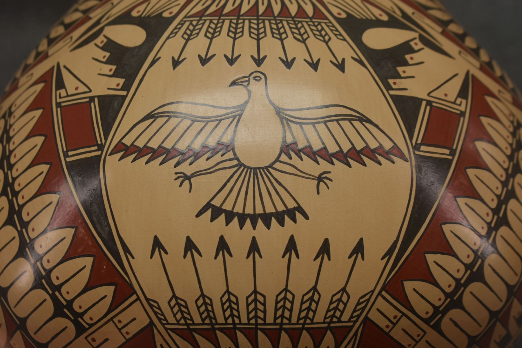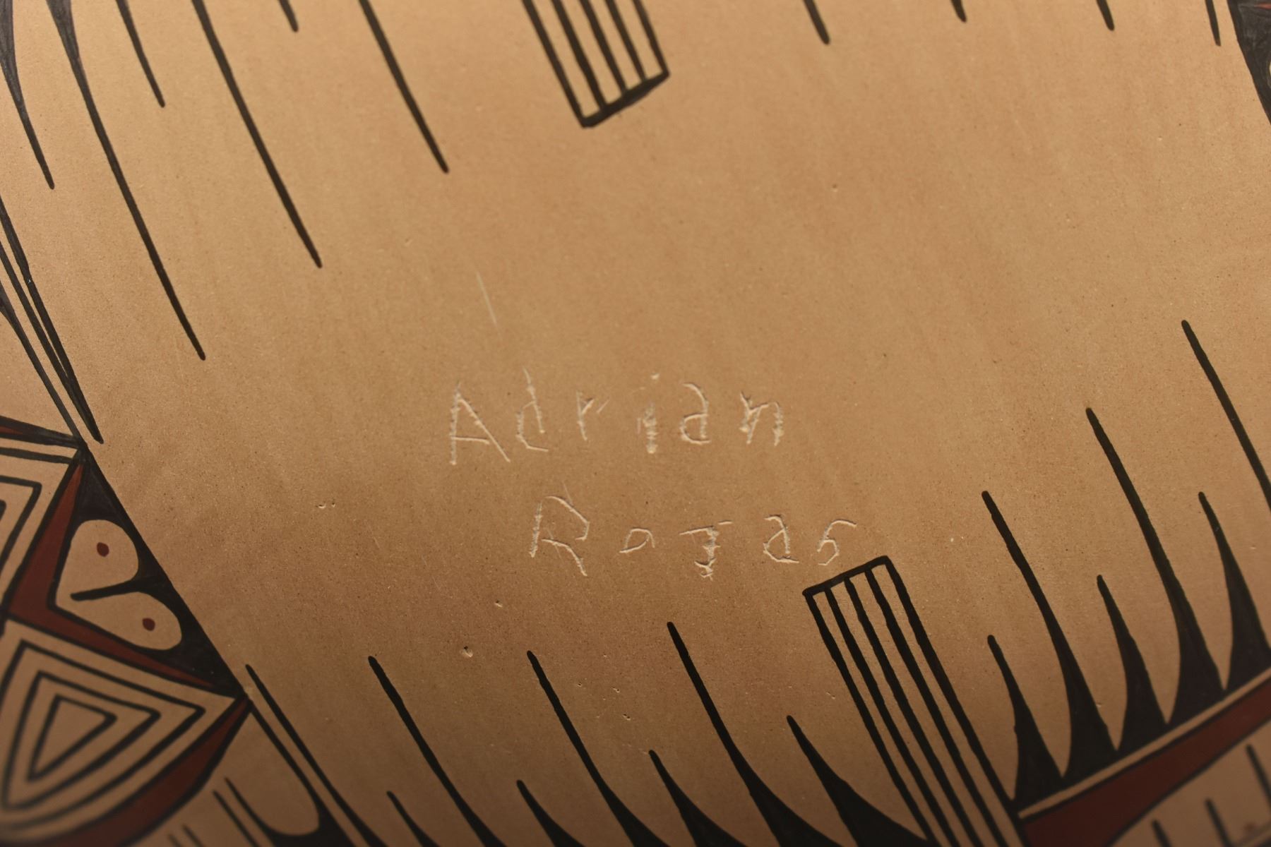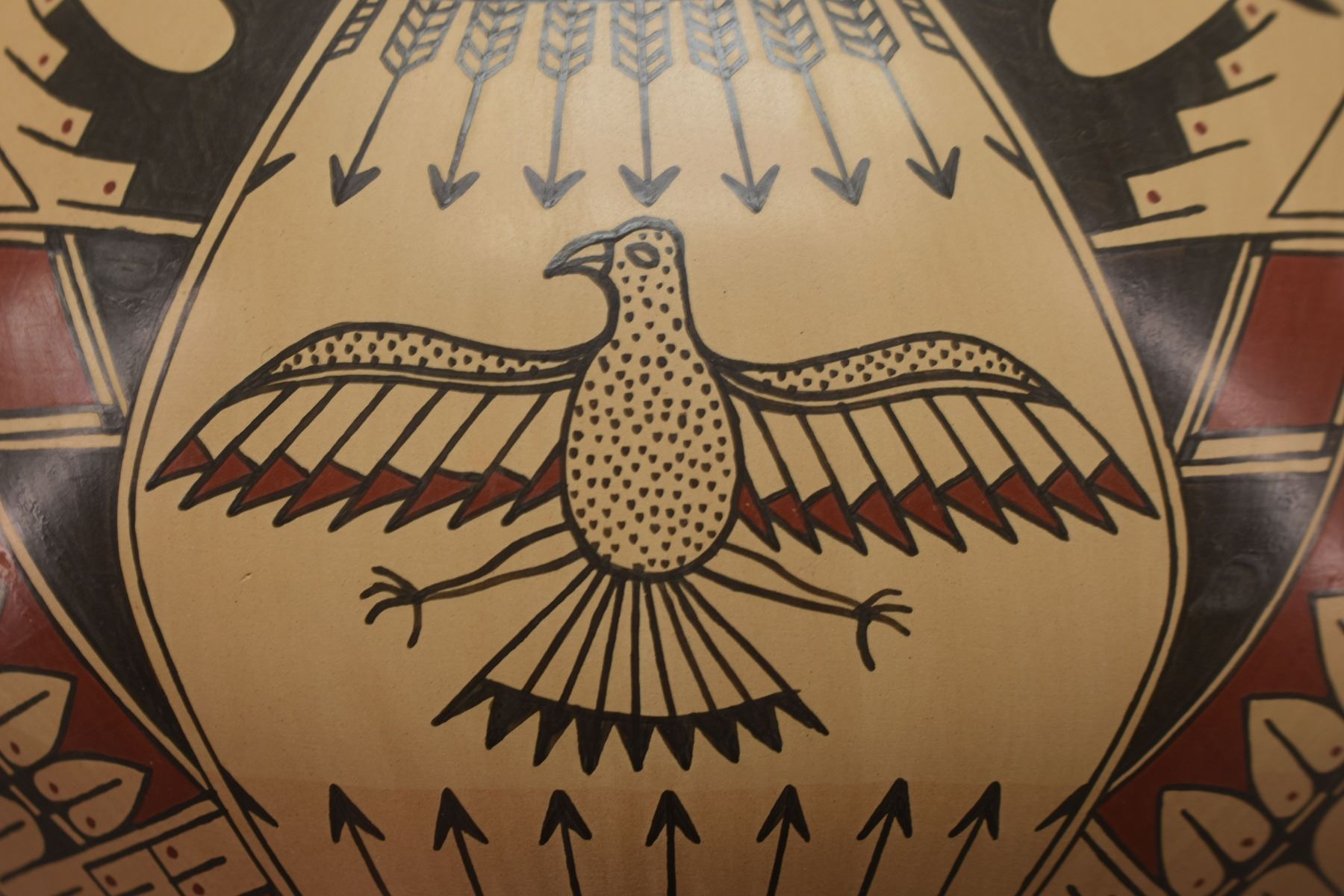 1980's Mata Ortiz hand made pottery owl with polychrome painted design 11" x 9" signed Adrian Rojas