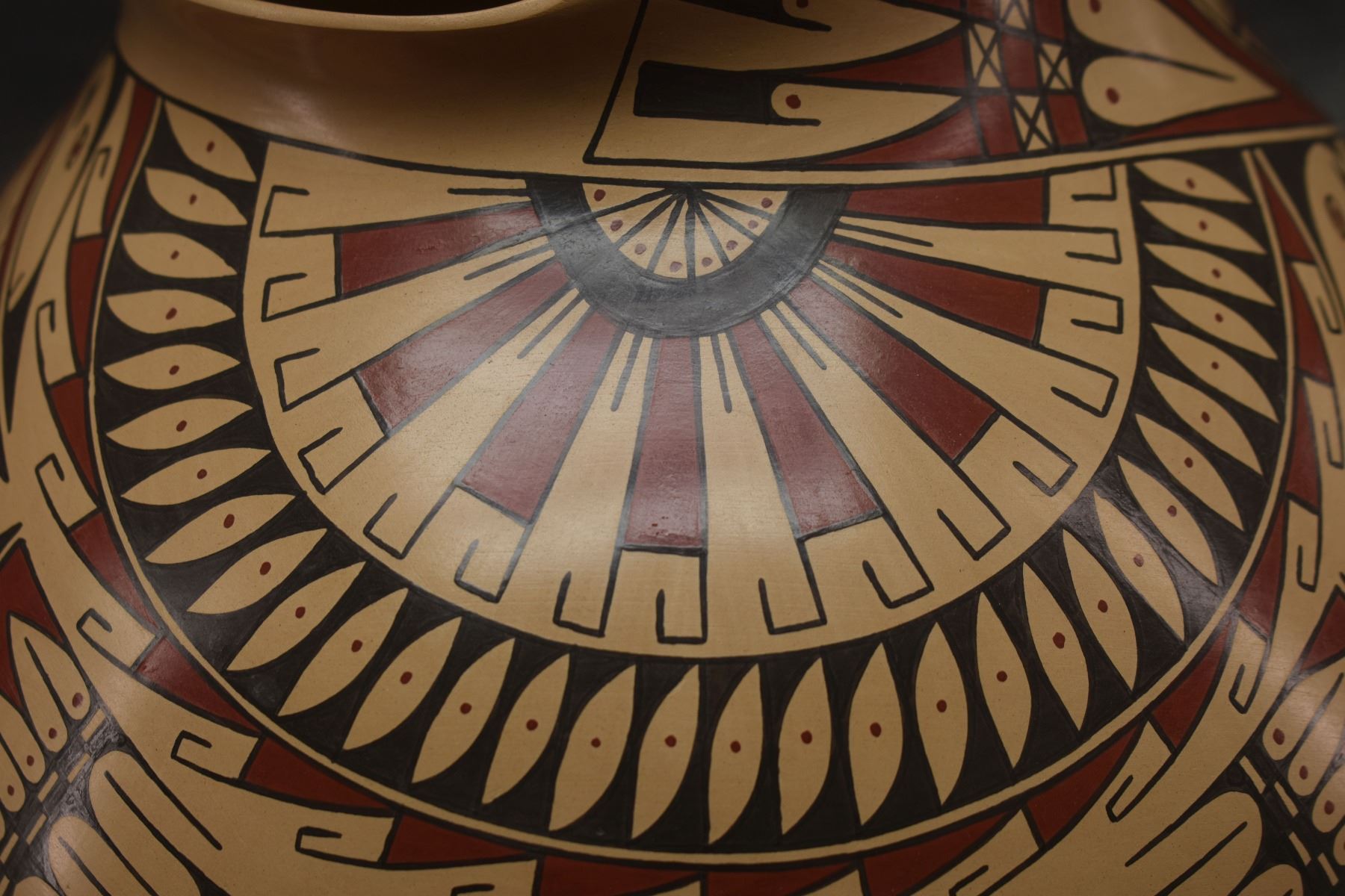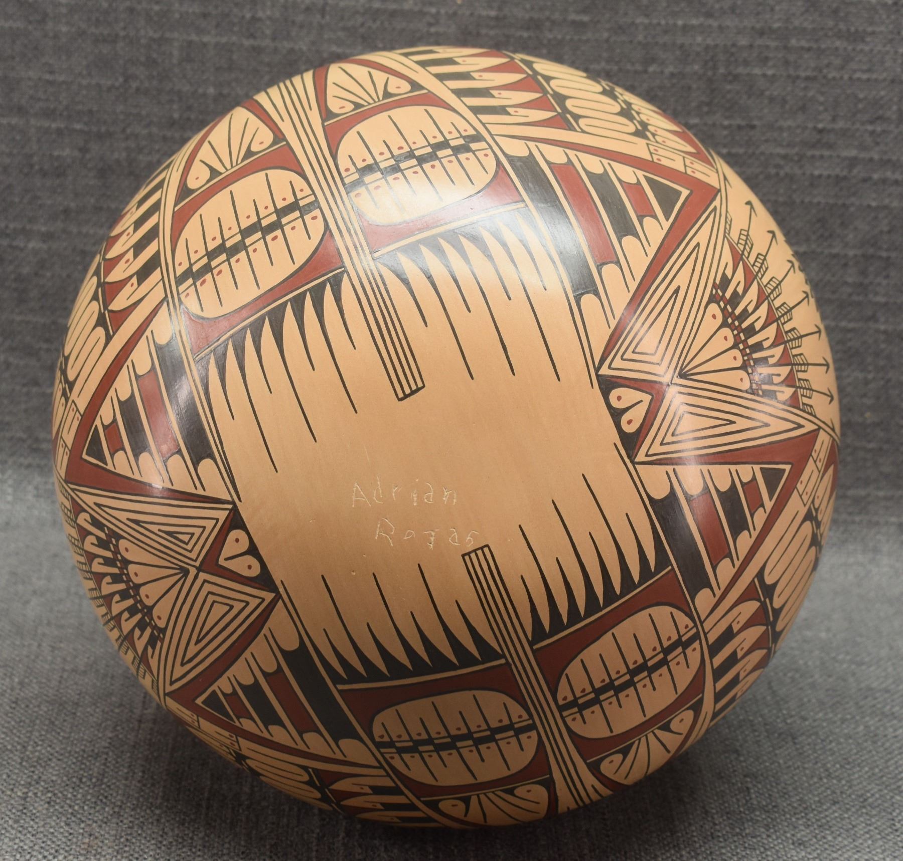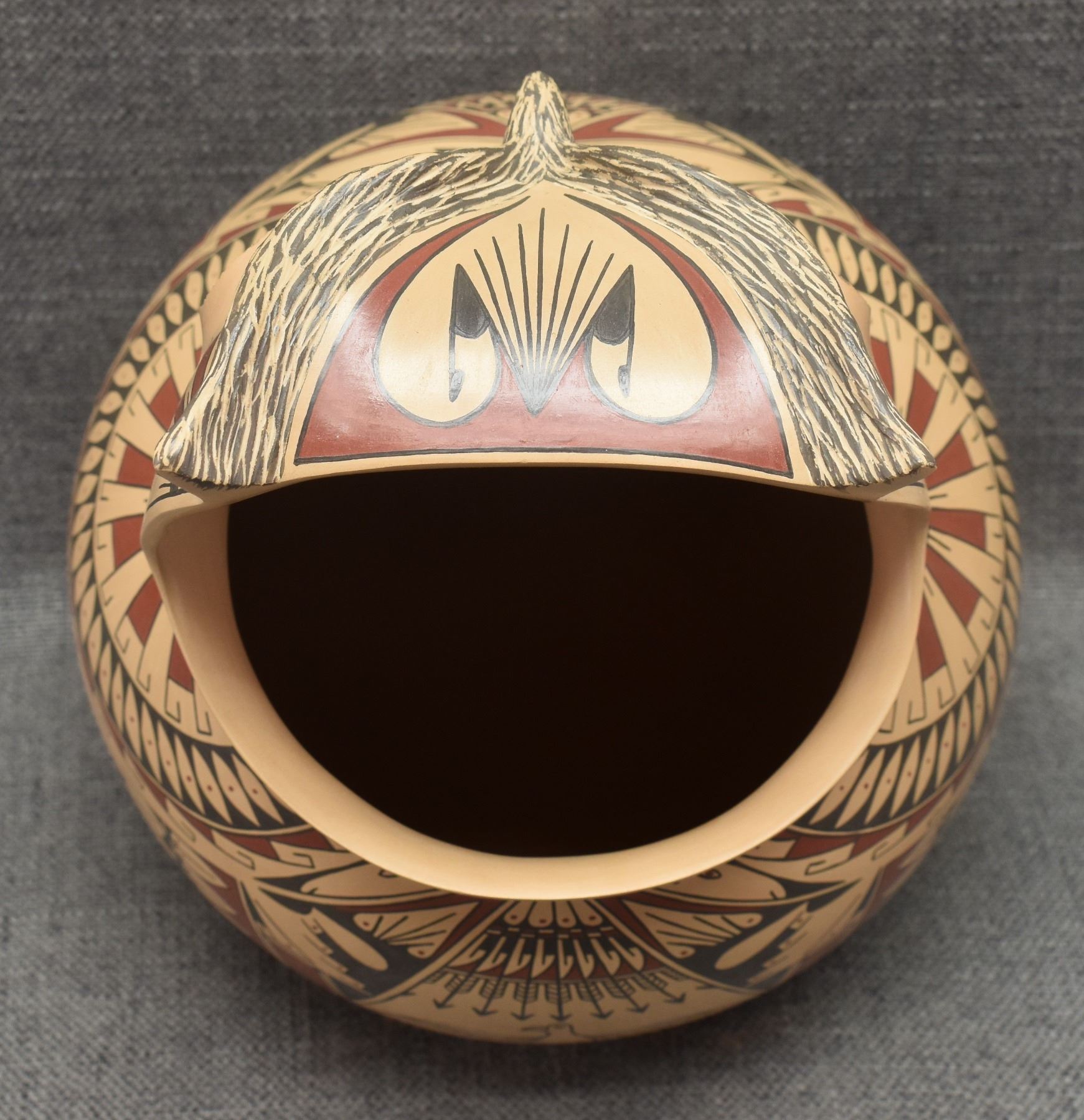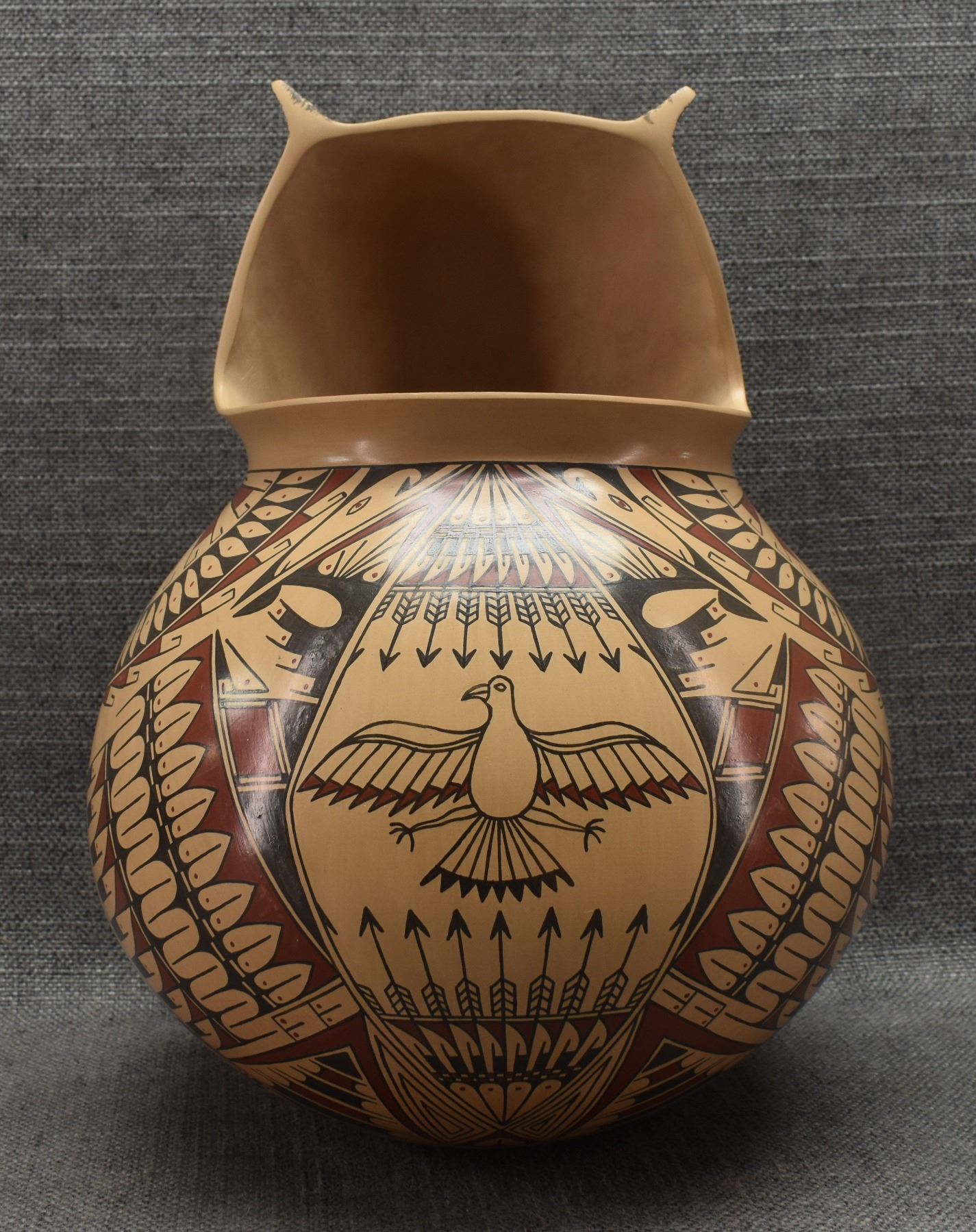 1980's Mata Ortiz hand made pottery owl with polychrome painted design 11" x 9" signed Adrian Rojas